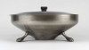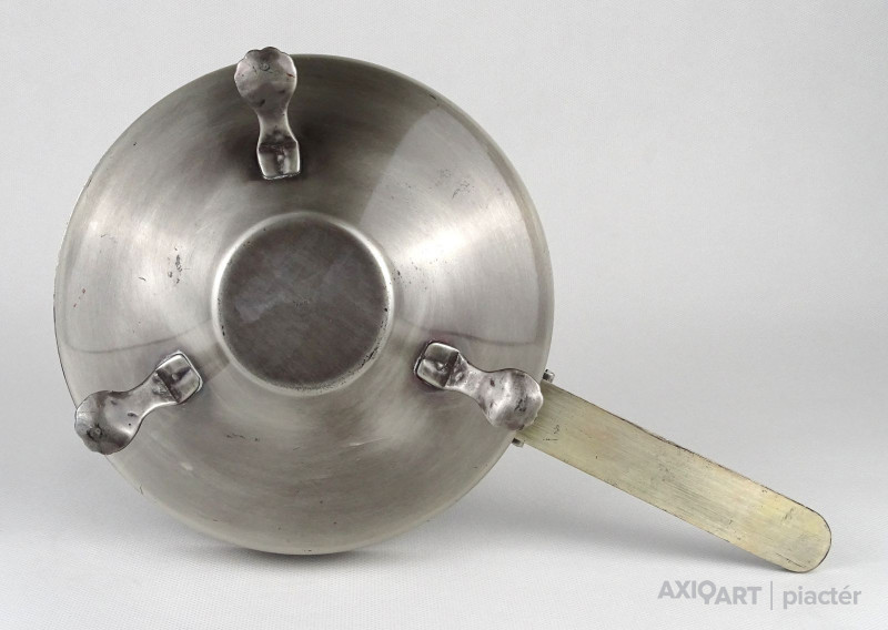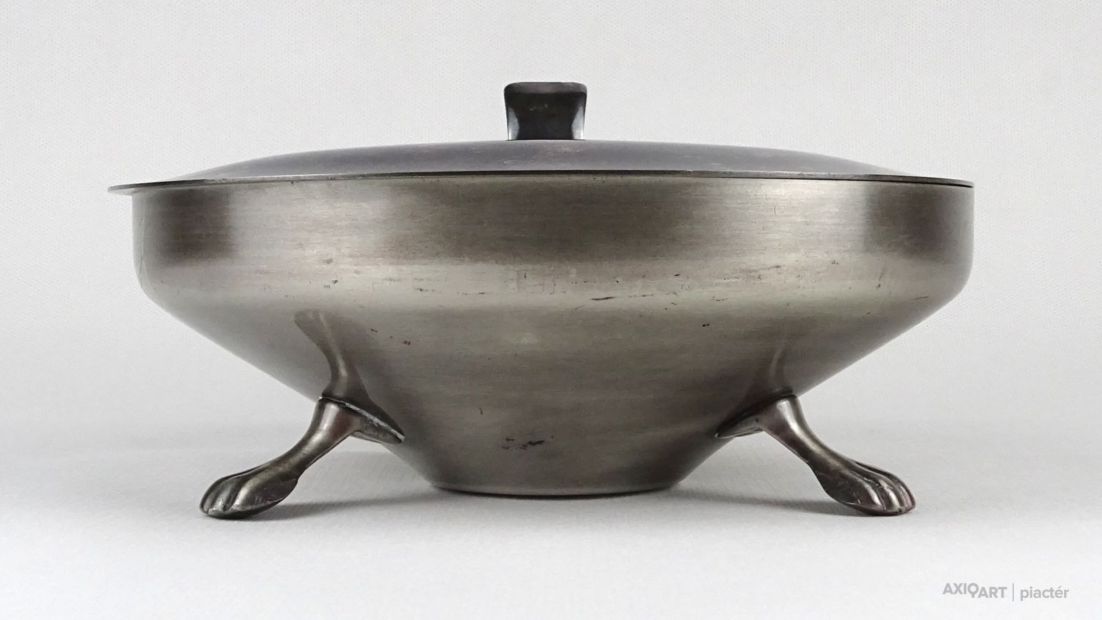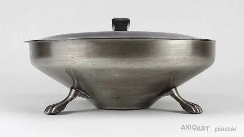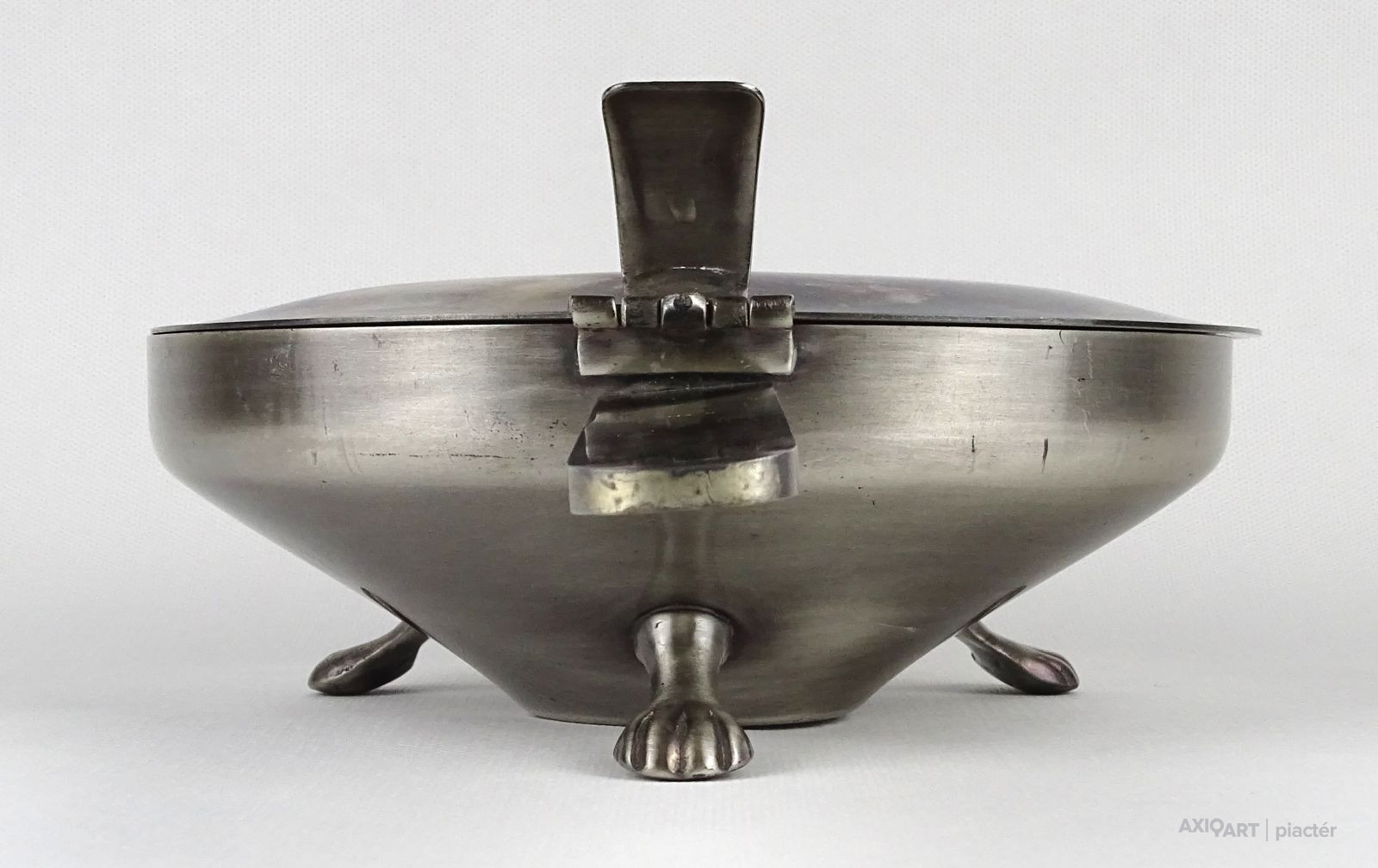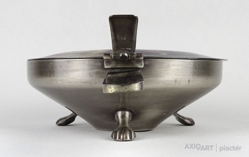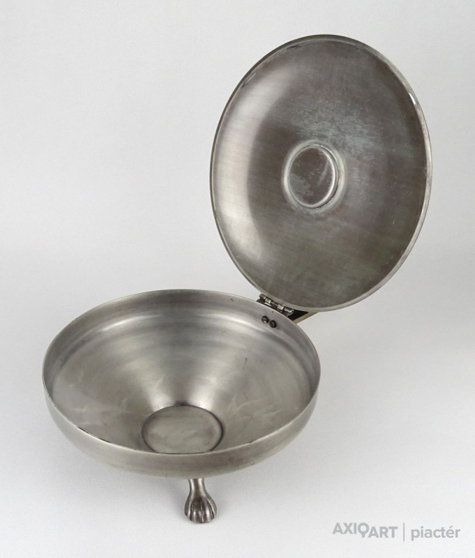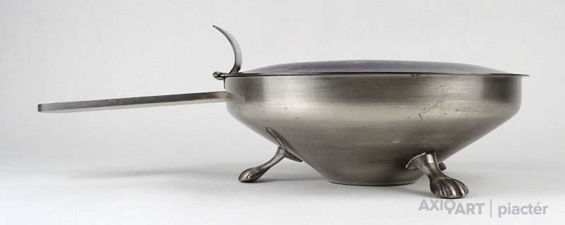 Régi nagyméretű jelzett, ezüstözött, három lábon álló, oroszlánlábas, fedeles, nyeles hamutartó, hamutál.