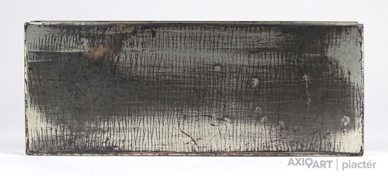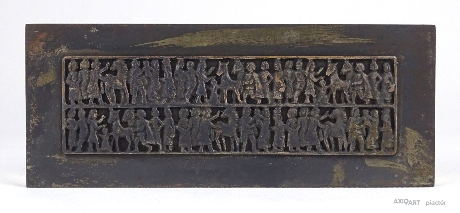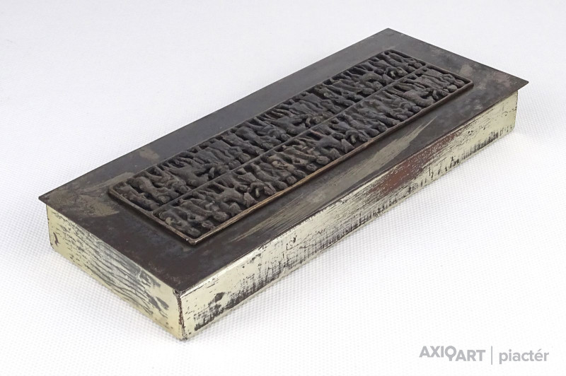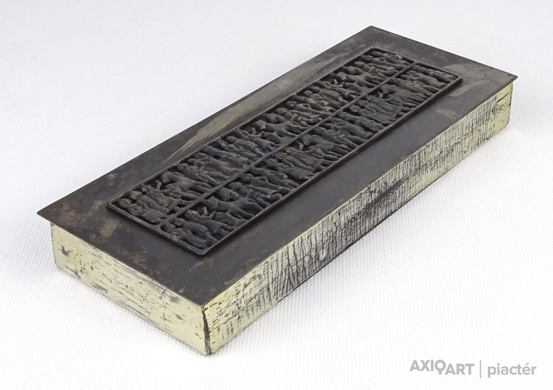 [1P182/X025] Régi, jelzett fa betétes Cigaretta kínáló vagy kártyadoboz. Gyönyörű dísztárgy, doboz, díszdoboz. Tetején domborműves, sok alakos díszítés látható. Belsejében jelzés: TEVAN Magasság: 2.5 cm Szélesség: 8 cm Hosszúság: 20 cm Súly: 0.375 kg Tevan Margit ötvös Születési hely: Békéscsaba Születési dátum: 1901 Honlap:   Kiállítások az adatbázisban: Tevan Margit ötvösművész emlékkiállítása Mesterei: Zutt Richárd, Kiss Ferenc. Tanulmányait 1921-ben az Iparművészeti Iskola ötvös-zománcozó szakán kezdte, majd Zutt Richárd és Kiss Ferenc magántanítványaként folytatta. Számos nemzetközi kiállításon nyert díjakat. Kitüntették Budapest Székesfőváros elismerő oklevelével. Az 1937-es Párizsi Világkiállításon elnyerte a Diplome d'Honneur-t. 1939: az Első Magyar Országos Iparművészeti Társulat kitüntetettje. 1940-ben a Milánói Triennálén Ezüstérmet kapott. 1957: Munkácsy-díj; 1962: érdemes művész, 1971-ben és 1976-ban a Munka Érdemrend arany fokozatát kapta. 1977-ben kiváló művész címmel ismerték el munkásságát. Tagja volt a Műhely Társaságnak. Tanulmányai végeztével, 1925-1927 között egy ötvösműhelyben, 1928-tól önálló művészként dolgozott. A 30-as évektől kezdve kiemelkedő szerepe volt a modern magyar fémművesség megteremtésében, tömegek számára hozzáférhetővé tételében és ezáltal az iparművészeti kultúra formálásában. Korai munkáiban a fémlemezt plasztikusan, szinte szobrászi erővel formálta meg, lemondva a korszak fémművességének sokszor öncélúan túlburjánzó ornamentikájáról. Szemléletének alapja az anyag önnön szépségének érvényre juttatása. Tárgyainak díszítményei - legtöbbször - reliefszerűen formált figurális motívumok (emberi figurák, állatalakok), amelyeket sokszor külön fémöntvények formájában applikált munkáira. Díszítőmotívumai, figurái sajátos bukolikus bájt kölcsönöznek tárgyainak, felfogásukra jelentős hatást gyakorolt a romanika szobrászatának tömör formavilága. Leggyakrabban ajándéktárgyakat, serlegeket, kelyheket, tálakat, dobozokat készített. Legkedveltebb anyaga a vörös- és sárgaréz volt, de szívesen dolgozott ónnal és bronzzal is. Egyéni kiállítások 1981 • Iparművészeti Múzeum, Budapest (emlékkiállítás) 1988 • Munkácsy Mihály Múzeum, Békéscsaba (emlékkiállítás) 1996 • Lánchíd Galéria, Budapest [Engel Tevan Istvánnal]. Válogatott csoportos kiállítások Iparművészeti Kiállítás, Nemzeti Szalon, Budapest 1932 • Magyar Kultúrszövetség 1943 • Belvárosi Művészeti Szalon 1948 • 90 művész kiállítása, Nemzeti Szalon, Budapest 1953 • 1. Országos Iparművészeti kiállítás, Műcsarnok, Budapest 1953 • Népművészeti és Iparművészeti Kiállítás, Műcsarnok, Budapest 1956 • Képző- és Iparművészeti kiállítás, Szeged 1958 • Magyar Képzőművésznők kiállítása, Műcsarnok, Budapest 1959 • 4. Országos Iparművészeti kiállítás, Műcsarnok, Budapest 1960 • Képzőművésznők nemzetközi kiállítása, Műcsarnok, Budapest 1962 • Katona József Múzeum, Kecskemét 1963 • Iparművészeti Kiállítás, Herman Ottó Múzeum, Miskolc 1965 • 5. Országos Iparművészeti kiállítás, Műcsarnok, Budapest 1967 • Budapesti Műszaki Egyetem, Kollégium 1966 • Modern Iparművészeti kiállítás, Sátoraljaújhely 1969 • Salgótarjáni Galéria, Salgótarján • Magyar Kultúra Háza, Prága 1975 • Jubileumi Iparművészeti kiállítás, Műcsarnok, Budapest. Művek közgyűjteményekben Iparművészeti Múzeum, Budapest. Irodalom KOCZOGH Á.: ~, Művészet, 1963/7. KOCZOGH Á.: ~, Népszava, 1976. december 12. KOCZOGH Á.: ~ (Mai magyar művészet sorozat), Budapest, 1977 TOLDI M.: ~ (1901-1978) ötvösművész kiállítása (kat. bev., Munkácsy Mihály Múzeum, Békéscsaba, 1988). Forrás: Artportal.hu Átmérője 14,5 cm Súlya: 323 g