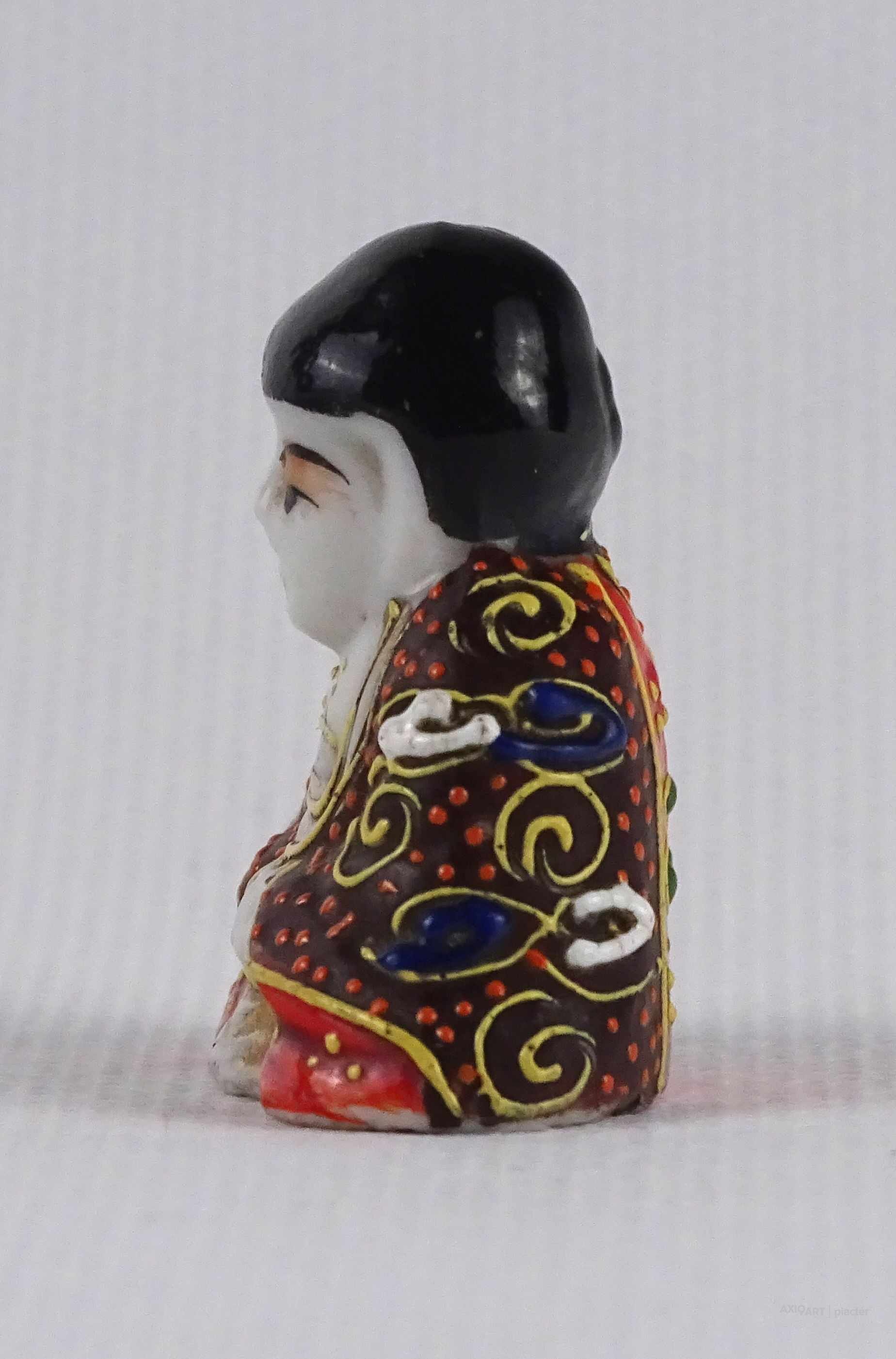 Kis méretű, hibátlan állapotú, kézi festéssel díszített, ülő Satsuma porcelán Buddha figura. Alján piros jelzés.
