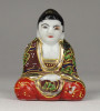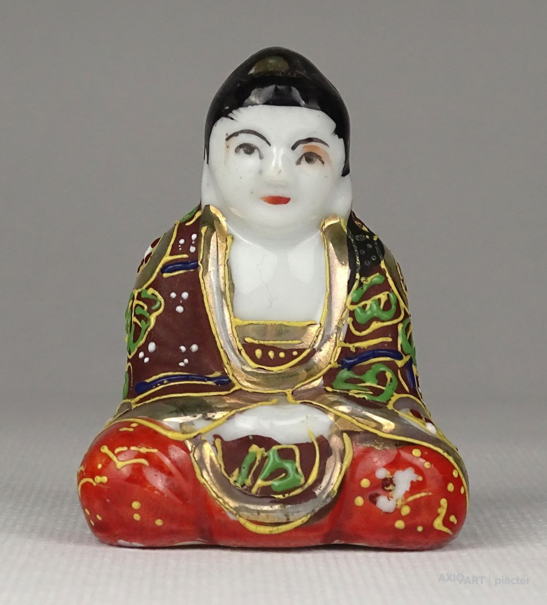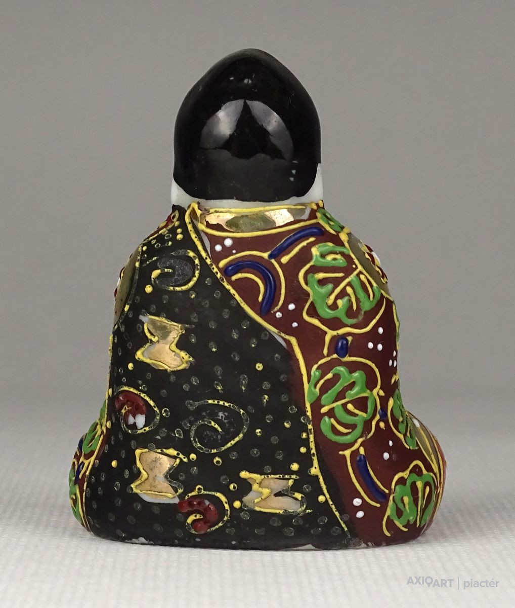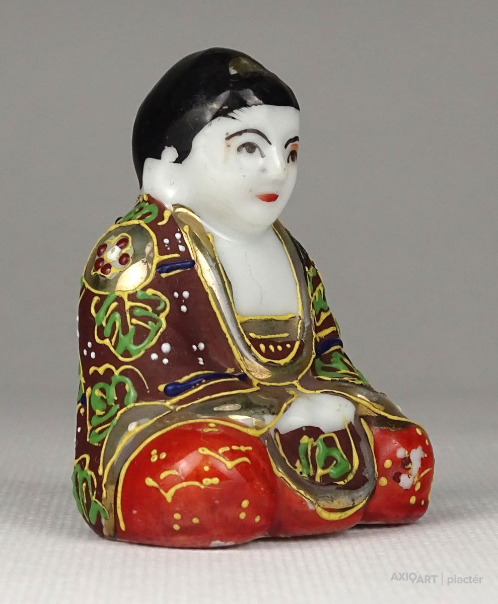 Szép állapotú kézi festéssel díszített, ülő Satsuma porcelán figura. Kisebb kopások láthatók rajta, lásd fotó.
