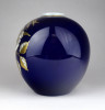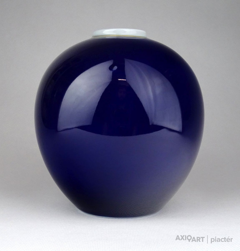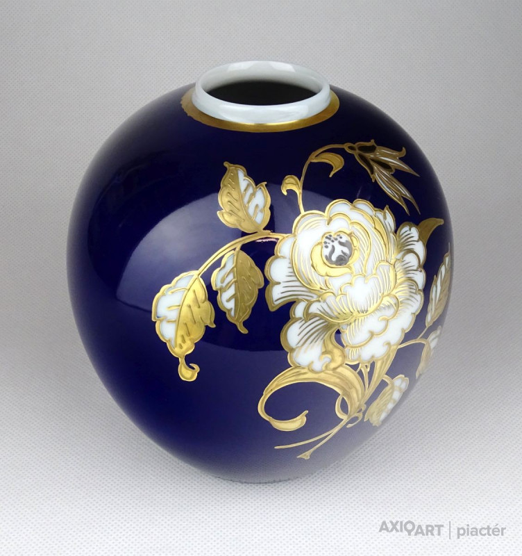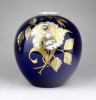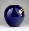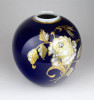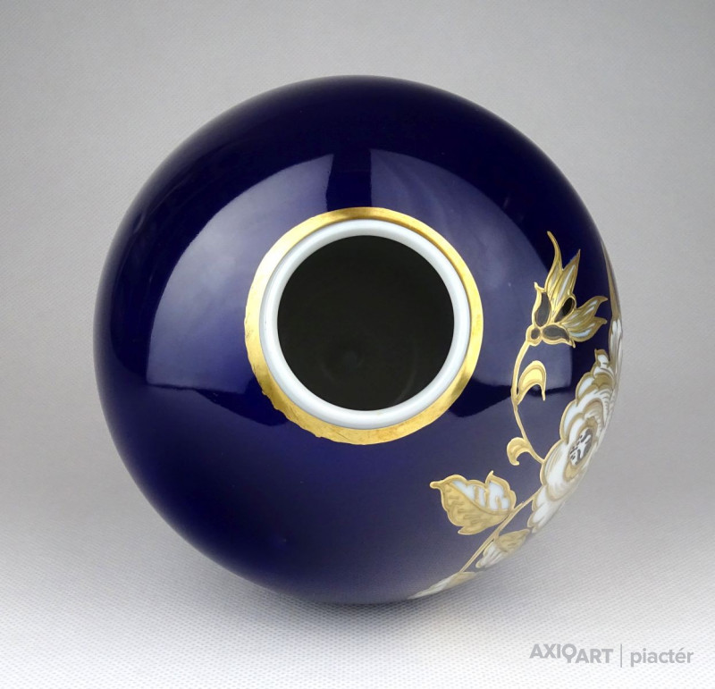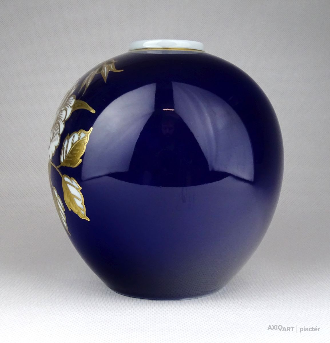 Hibátlan állapotú, kobalt kék színű, gazdagon aranyozott, virág díszes, jelzett porcelán váza, díszváza, gömbváza.