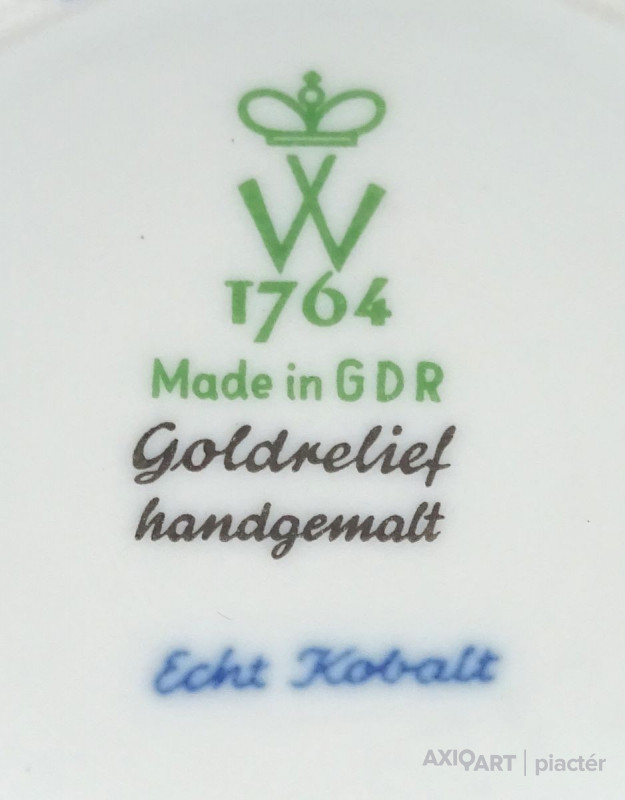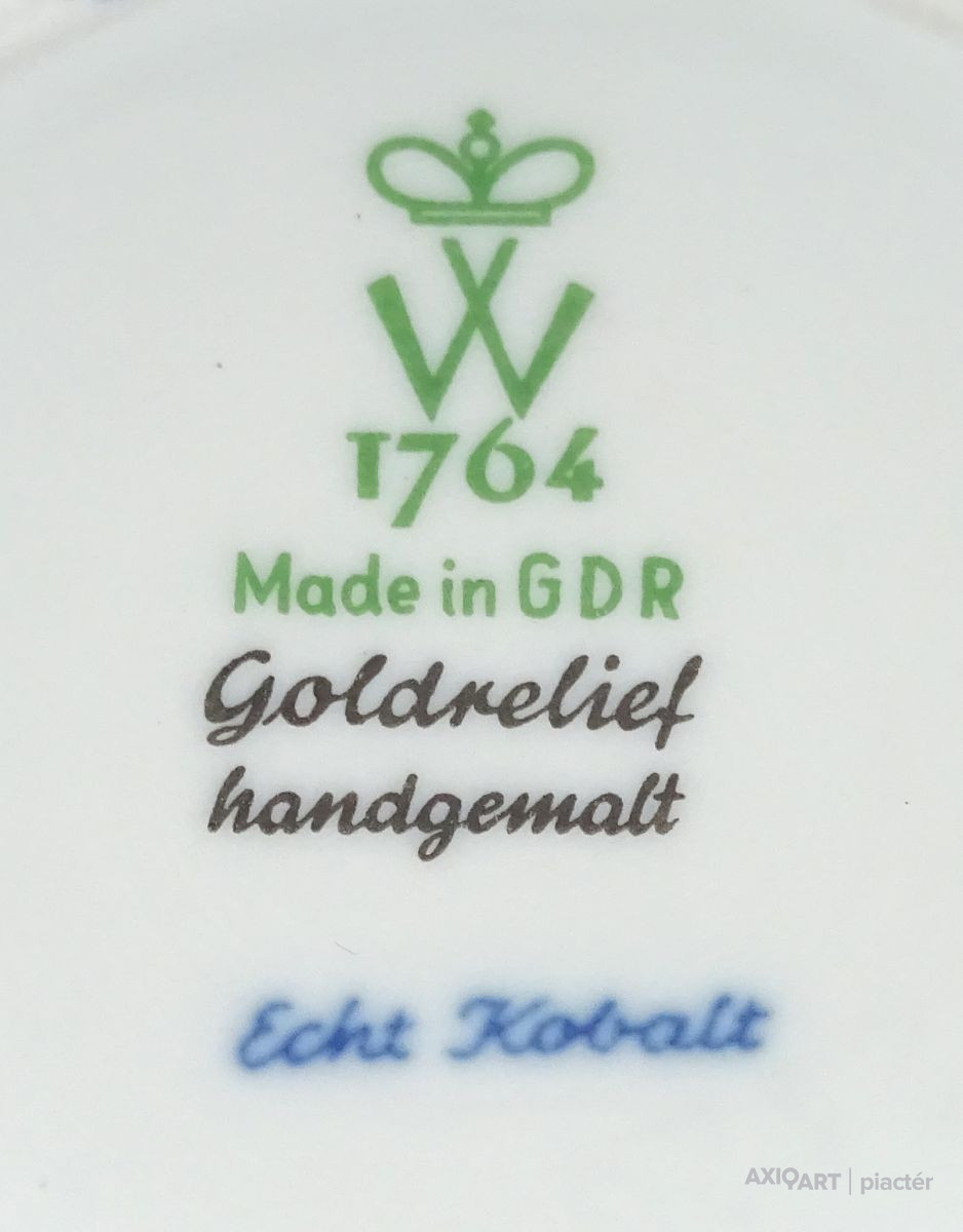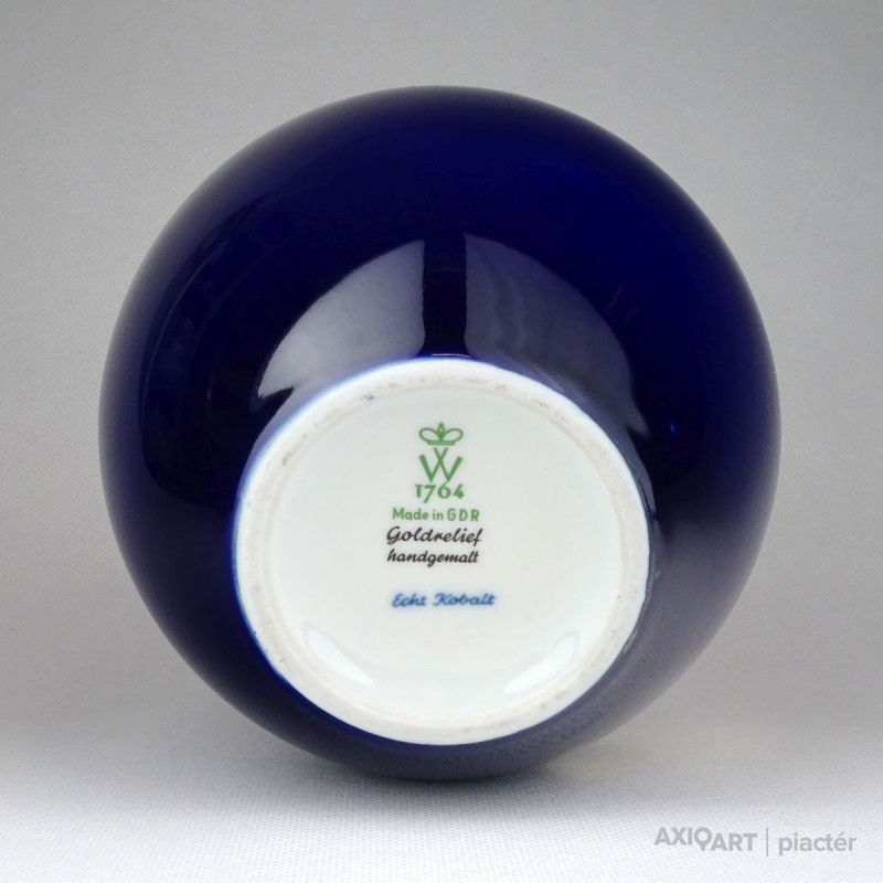 [1C556/X225] Hibátlan állapotú, kobalt kék színű, gazdagon aranyozott, virág díszes, jelzett porcelán váza, díszváza, gömbváza. Alján Wallendorfi zöld koronás márkajelzés: W 1764 MADE IN GDR GOLDRELIEF HANDGEMALT ECHT KOBALT Magasság: 13.5 cm Szélesség: 12.5 cm Súly: 0.42 kg