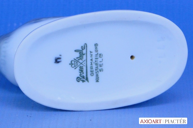 [1T504/Z040] Régi, hibátlan állapotú, talapzaton álló, szépen kidolgozott porcelán bohóc figura. Ritkán előforduló darab. Alján zöld koronás márkajelzés: ROSENTHAL SELB - BAVARIA Talapzaton formatervező neve: FRED. LIEBERMANN (Ferdinand Liebermann - Sculptor - szobrász, a Rosenthal legfontosabb, legnevesebb tervezője) Magasság: 15 cm Szélesség: 11.5 cm Súly: 0.205 kg   Ferdinand Liebermann Ferdinand Liebermann (1883–1941), the son of a toy manufacturer, was a German sculptor. He studied at the Munich School of Arts and Crafts and the Art Academy. After taking study trips to Rome and Paris, he opened a studio in 1910 in Munich. In the same year he received the Great Austrian Golden State Medal for a small bronze sculpture. Several exhibitions followed. He became one of the most important designers for the porcelain manufacturer Rosenthal AG. Liebermann’s work-spectrum encompasses bronze sculpturing, monumental sculpturing and memorials. In 1926 he received the professor title for monumental and portrait sculpturing in Munich.  After 1933, Liebermann  produced at the orders of the Nazi party 32 busts of Hitler (all 1½ life size), one of which was a commission from the city of Munich for the city hall. In appreciation he was made city councillor of the Capital of the Movement, the 'Haupstadt der Bewegung'. Liebermanns Führerbust was displayed at the XIX Venice Biennale 1934 ('Cancelliere del Reich Adolf Hitler') and also at the GDKs of 1937, 1938 and in the Münchener Kunstausttellungen 1934, 1940 and 1941. It is said that the busts designed by Liebermann were favoured by the German leader over all the others.  His sculpture 'L'Abbandoro' ('Abandoned') was displayed at the XIV Biennale 1924 in Venice; ‘Erhebung’ (‘Elevatione’ or ‘Elevation’) was displayed at the XIX Venice Biennale 1934 and later again at the GDK 1937, room 9. In 1938 his bronze ‘Abwehr’ (‘Defence’ or 'Ripulso') was displayed at the XXI Venice Biennale. Liebermann also completed a bronze bust of Hitler's half-niece Geli Raubal, who had shot herself in Hitler’s apartment in 1931. From this bust Hitler had numerous copies made for display in his residences.  At the Great German Art Exhibitions Ferdinand Liebermann was represented with 16 works, among them the two Hitler busts, the relief 'Wille’ (design for the Freikorps-monument), a bust of Riechsleiter Alfred Rosenberg, Reichsleiter Amann and two 'Kampf' sculptures.  In 1941, the year of his death, he created the massive sculpture for the  Freikorpsdenkmal in Munich. In the possession of the Bayerische Staatsgemäldesammlungen are the following works: 'Eva' (GDK 1939 room 35), 'Abwehr', 'In Erwartung', Frisches Lachen', 'Paolo', 'Rhythmus' and 'Knabe auf einem Waller reitend'. A copy of 'Eva' in bronze (72 cm high) was displayed at the exhibition ‘Kunst im 3. Reich, Dokumente der Unterwerfung’; the exhibition, instigated by the Frankfurter Kunstverein, was held from 1974 to 1975 in Frankfurt, Hamburg, Stuttgart, Ludwigshafen and Wuppertal.Ferdinand Liebermann: Ferdinand Liebermann: (1883–1941), the son of a toy manufacturer, was a German sculptor. He studied at the Munich School of Arts and Crafts and the Art Academy. After taking study trips to Rome and Paris, he opened a studio in 1910 in Munich. In the same year he received the Great Austrian Golden State Medal for a small bronze sculpture. Several exhibitions followed.r He became one of the most important designers for the porcelain manufacturer Rosenthal AG. Liebermann’s work-spectrum encompasses bronze sculpturing, monumental sculpturing and memorials. In 1926 he received the professor title for monumental and portrait sculpturing in Munich.  After 1933, Liebermann  produced at the orders of the Nazi party 32 busts of Hitler (all 1½ life size), one of which was a commission from the city of Munich for the city hall. In appreciation he was made city councillor of the Capital of the Movement, the 'Haupstadt der Bewegung'. Liebermanns Führerbust was displayed at the XIX Venice Biennale 1934 ('Cancelliere del Reich Adolf Hitler') and also at the GDKs of 1937, 1938 and in the Münchener Kunstausttellungen 1934, 1940 and 1941. It is said that the busts designed by Liebermann were favoured by the German leader over all the others.  His sculpture 'L'Abbandoro' ('Abandoned') was displayed at the XIV Biennale 1924 in Venice; ‘Erhebung’ (‘Elevatione’ or ‘Elevation’) was displayed at the XIX Venice Biennale 1934 and later again at the GDK 1937, room 9. In 1938 his bronze ‘Abwehr’ (‘Defence’ or 'Ripulso') was displayed at the XXI Venice Biennale. Liebermann also completed a bronze bust of Hitler's half-niece Geli Raubal, who had shot herself in Hitler’s apartment in 1931. From this bust Hitler had numerous copies made for display in his residences.  At the Great German Art Exhibitions Ferdinand Liebermann was represented with 16 works, among them the two Hitler busts, the relief 'Wille’ (design for the Freikorps-monument), a bust of Riechsleiter Alfred Rosenberg, Reichsleiter Amann and two 'Kampf' sculptures.  In 1941, the year of his death, he created the massive sculpture for the  Freikorpsdenkmal in Munich. In the possession of the Bayerische Staatsgemäldesammlungen are the following works: 'Eva' (GDK 1939 room 35), 'Abwehr', 'In Erwartung', Frisches Lachen', 'Paolo', 'Rhythmus' and 'Knabe auf einem Waller reitend'. A copy of 'Eva' in bronze (72 cm high) was displayed at the exhibition ‘Kunst im 3. Reich, Dokumente der Unterwerfung’; the exhibition, instigated by the Frankfurter Kunstverein, was held from 1974 to 1975 in Frankfurt, Hamburg, Stuttgart, Ludwigshafen and Wuppertal.