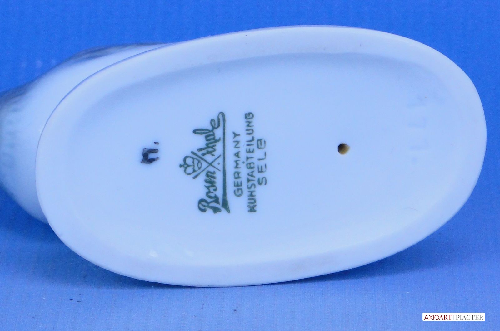 [0D143/UZ-K] Hibátlan állapotú, talapzaton álló, jelzett régi szépen kidolgozott porcelán kacsa. Alján zöld koronás márkajelzés: ROSENTHAL GERMANY KUNSTABTEILUNG SELB Formatervező neve a talapzat oldalán: K. HIMMELSTOSS Formaszám: 177 Magasság: 6 cm Súly: 0.086 kg