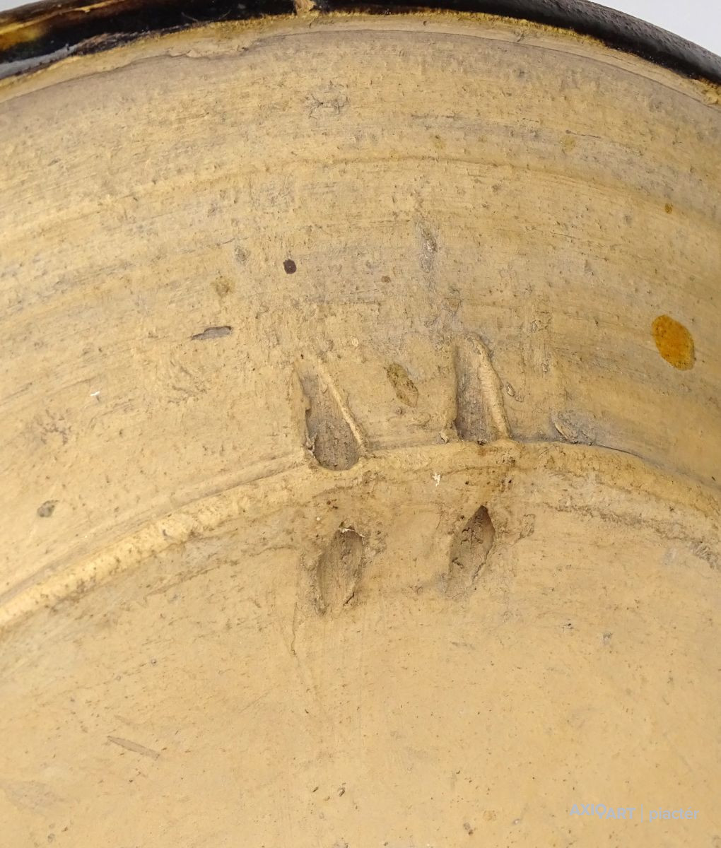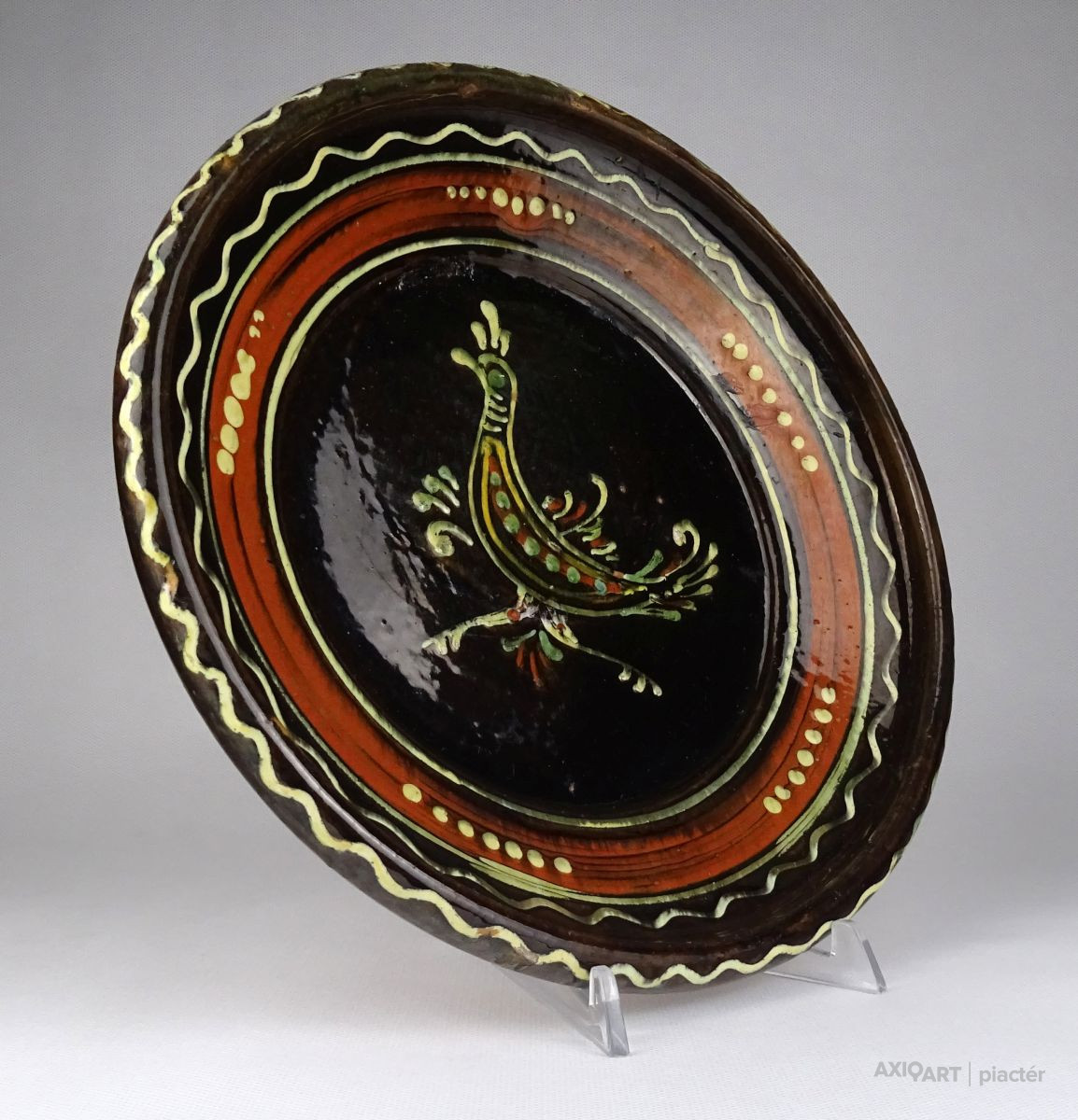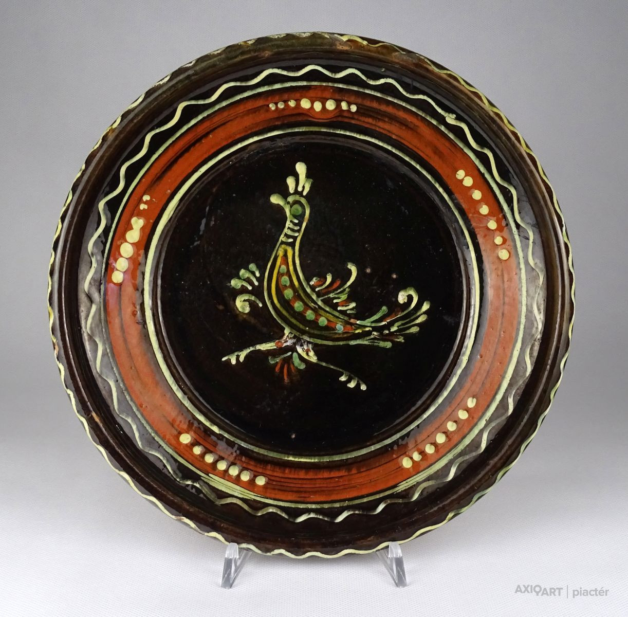 Régi jelzett, kézi festéssel díszített sötétbarna mázas kerámia fali tál, falitányér. Közepében nagy méretű madár díszítés. Falra akasztási lehetőséggel rendelkezik.
