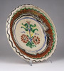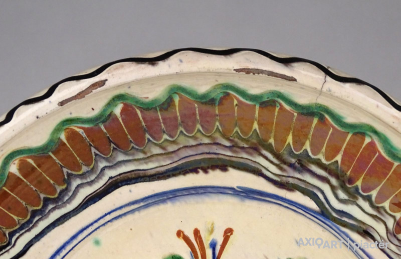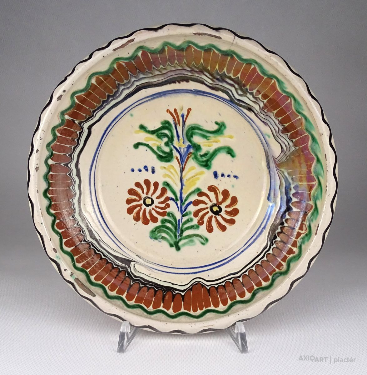 Régi jelzett, kézi festéssel díszített vajszínű mázas kerámia falitál, falitányér. Közepében virág díszítés. Falra akasztási lehetőséggel rendelkezik.