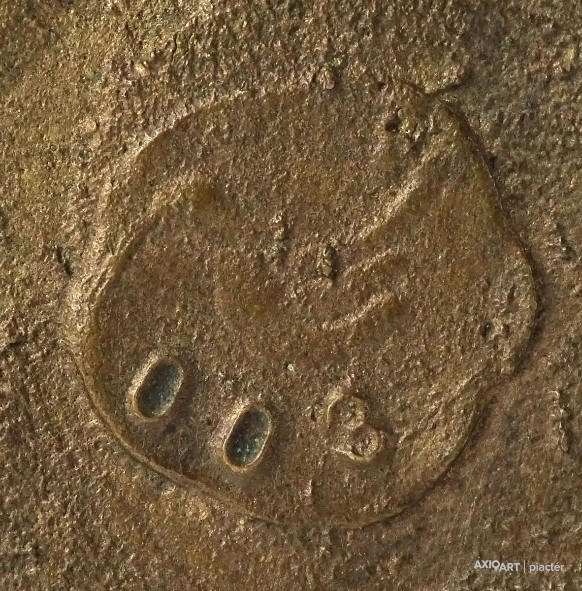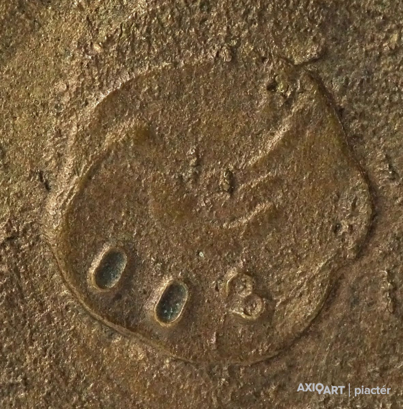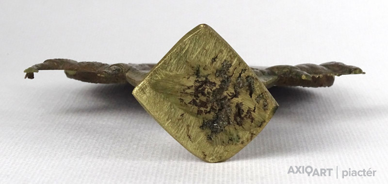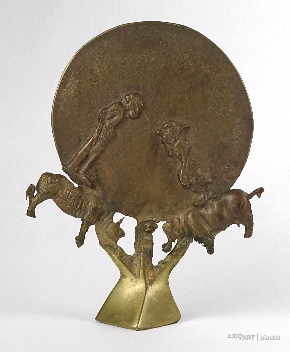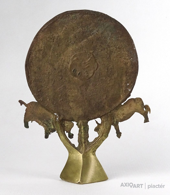 Régi, különleges talpas réz plakett. Napkorongon két orrszarvú, hátukon egy-egy ember alak. Hátoldalán madaras pecsét, alatt sorszám: 003
