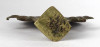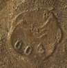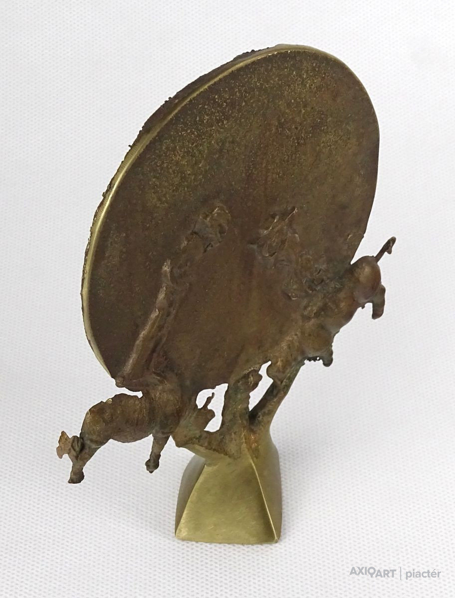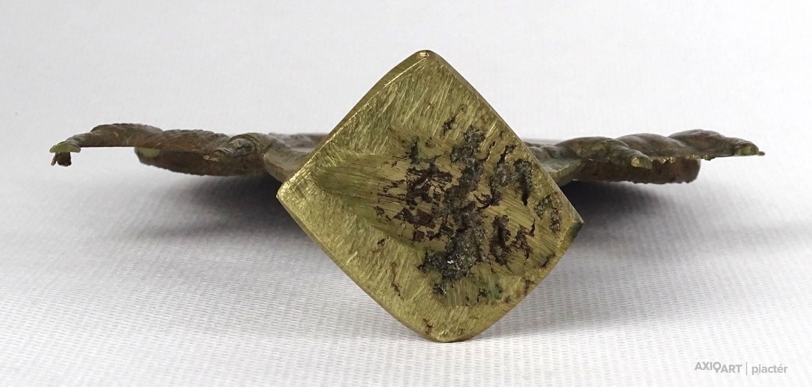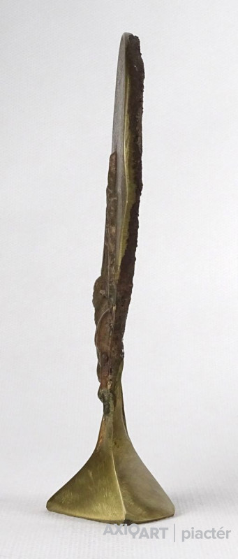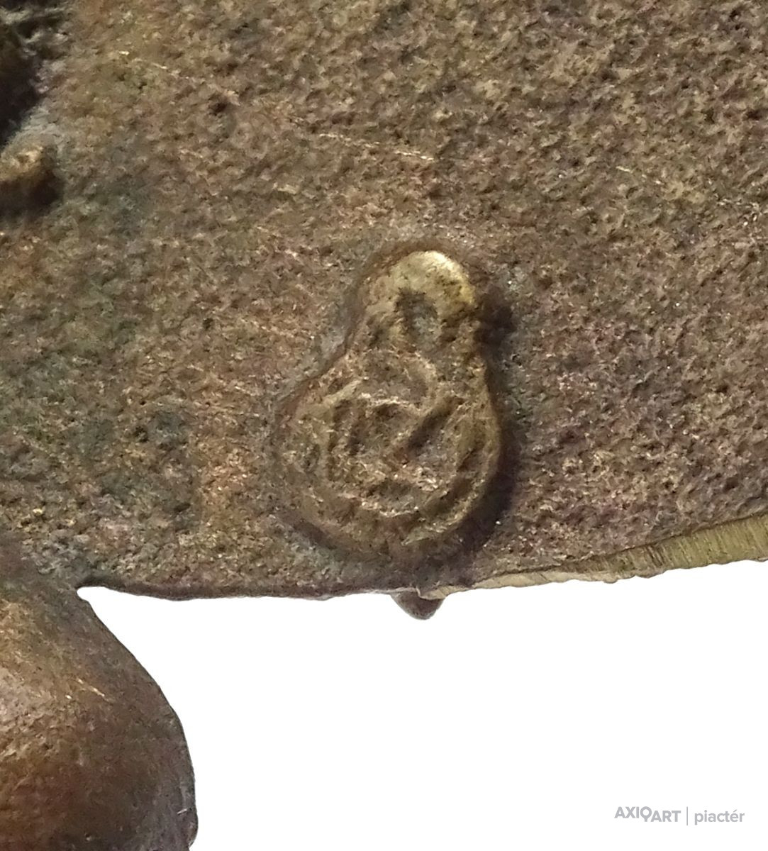 Régi, különleges talpas réz plakett. Napkorongon két orrszarvú, hátukon egy-egy ember alak. Hátoldalán madaras pecsét, alatt sorszám: 003