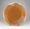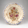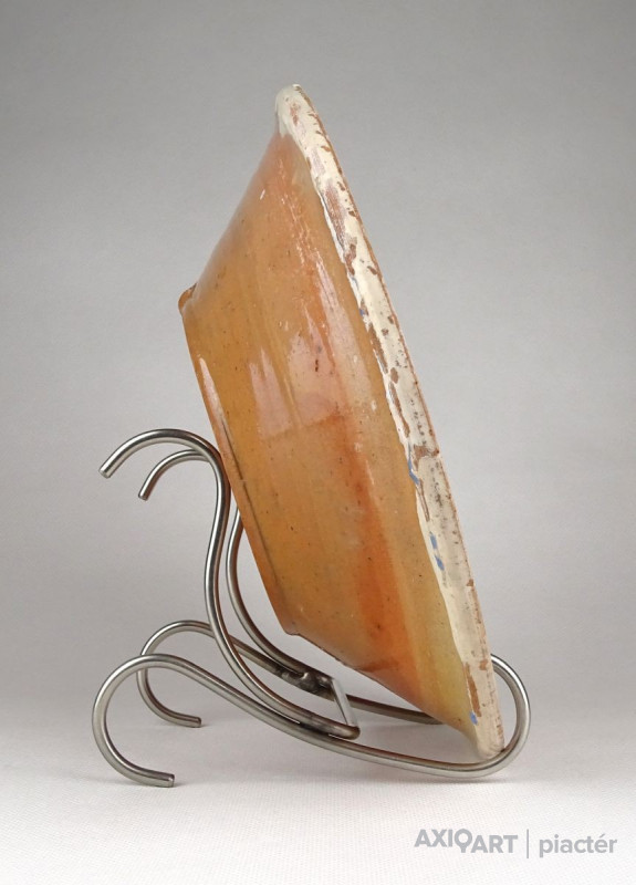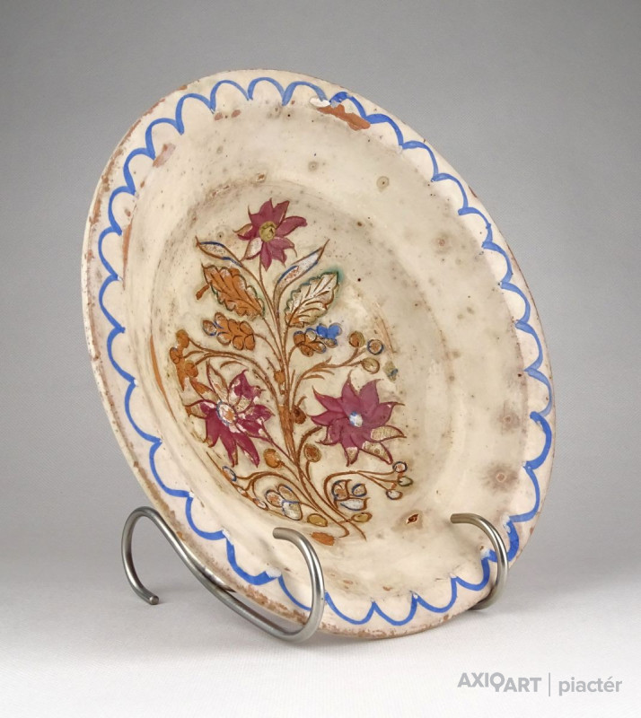 Régi, falra akasztási lehetőséggel rendelkező kerámia falitányér. Rajta karcolt és kézzel festett virág díszítés látható. Felülete kopottas.