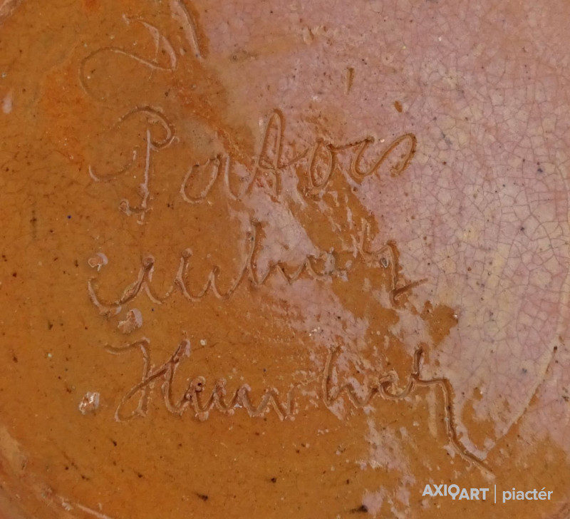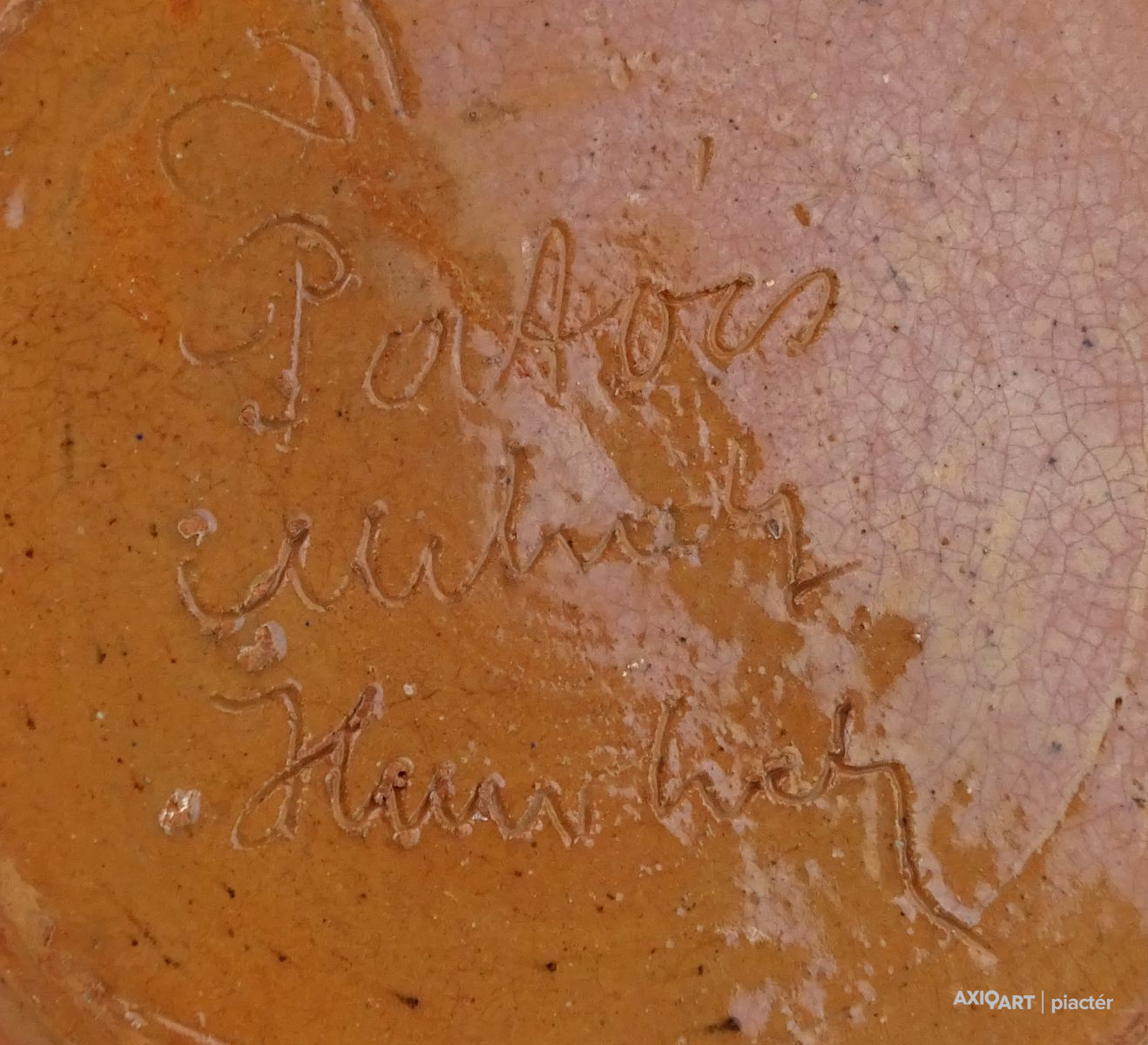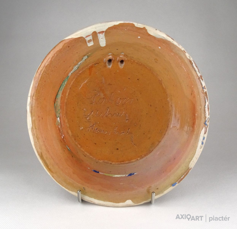 [1A496/X313] Régi, falra akasztási lehetőséggel rendelkező kerámia falitányér. Rajta karcolt és kézzel festett virág díszítés látható. Felülete kopottas. Alján karcolt jelzés: PATÓCS MIHÁLY HMVHELY Magasság: 5 cm Szélesség: 21 cm Súly: 0.515 kg