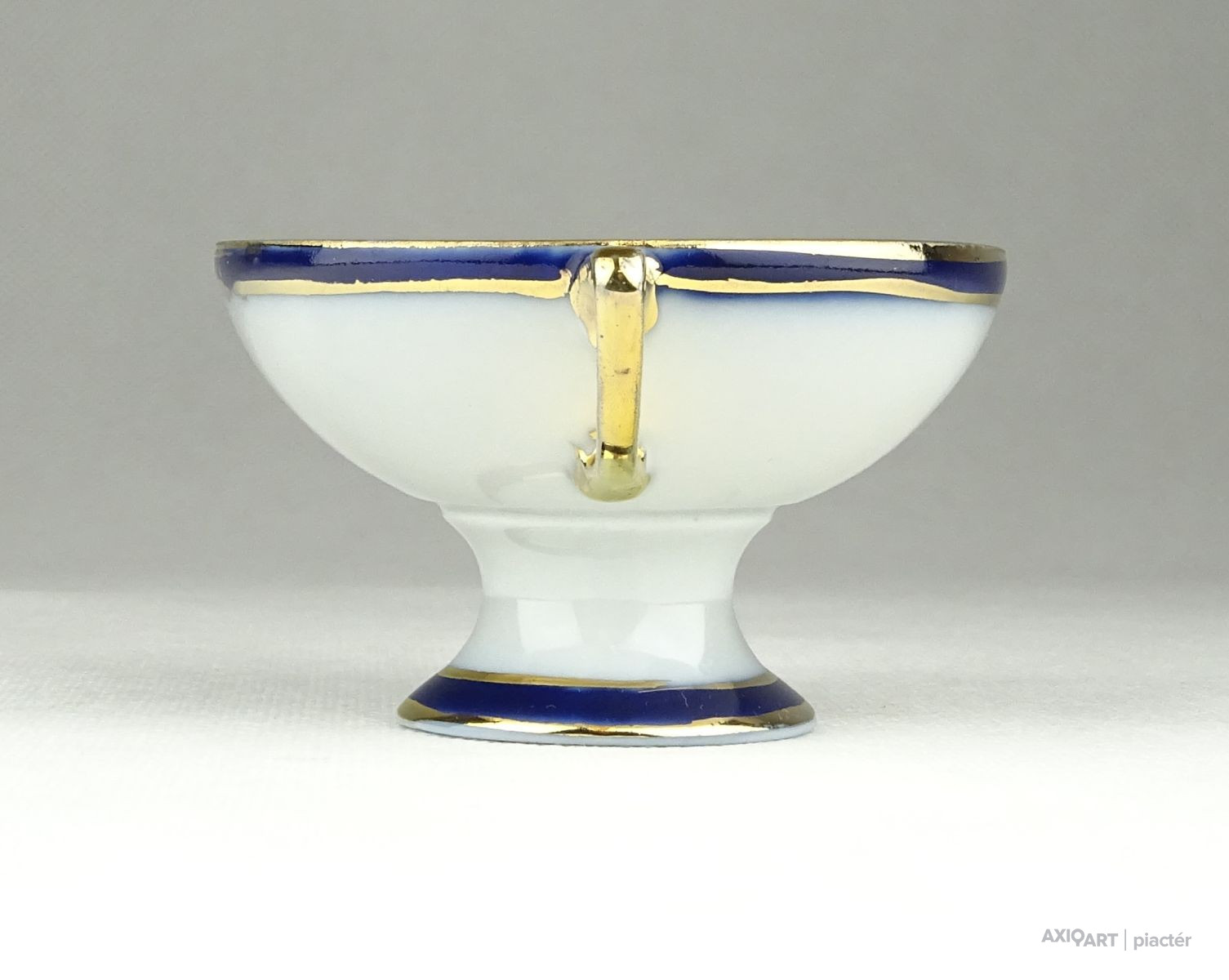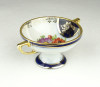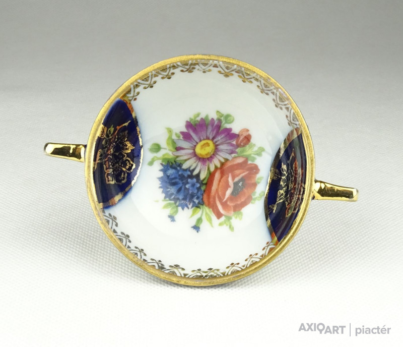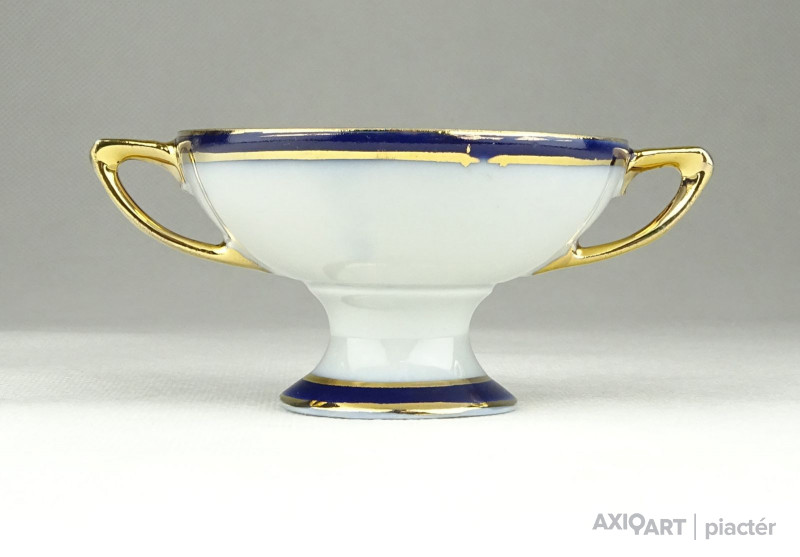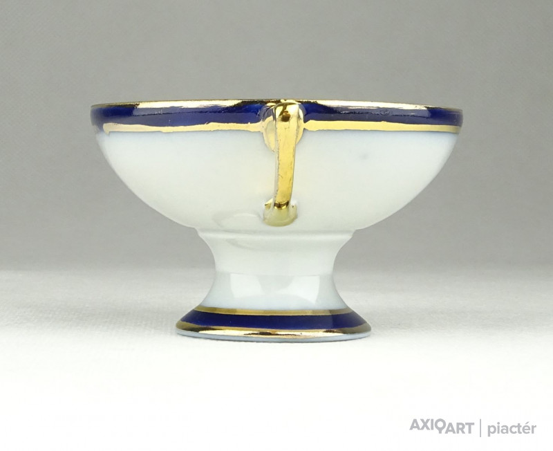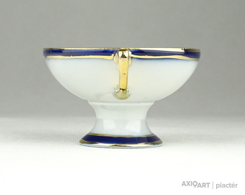 Régi, hibátlan állapotú, kisméretű aranyozott porcelán füles kínáló alakú dísztárgy, porcelán nipp.