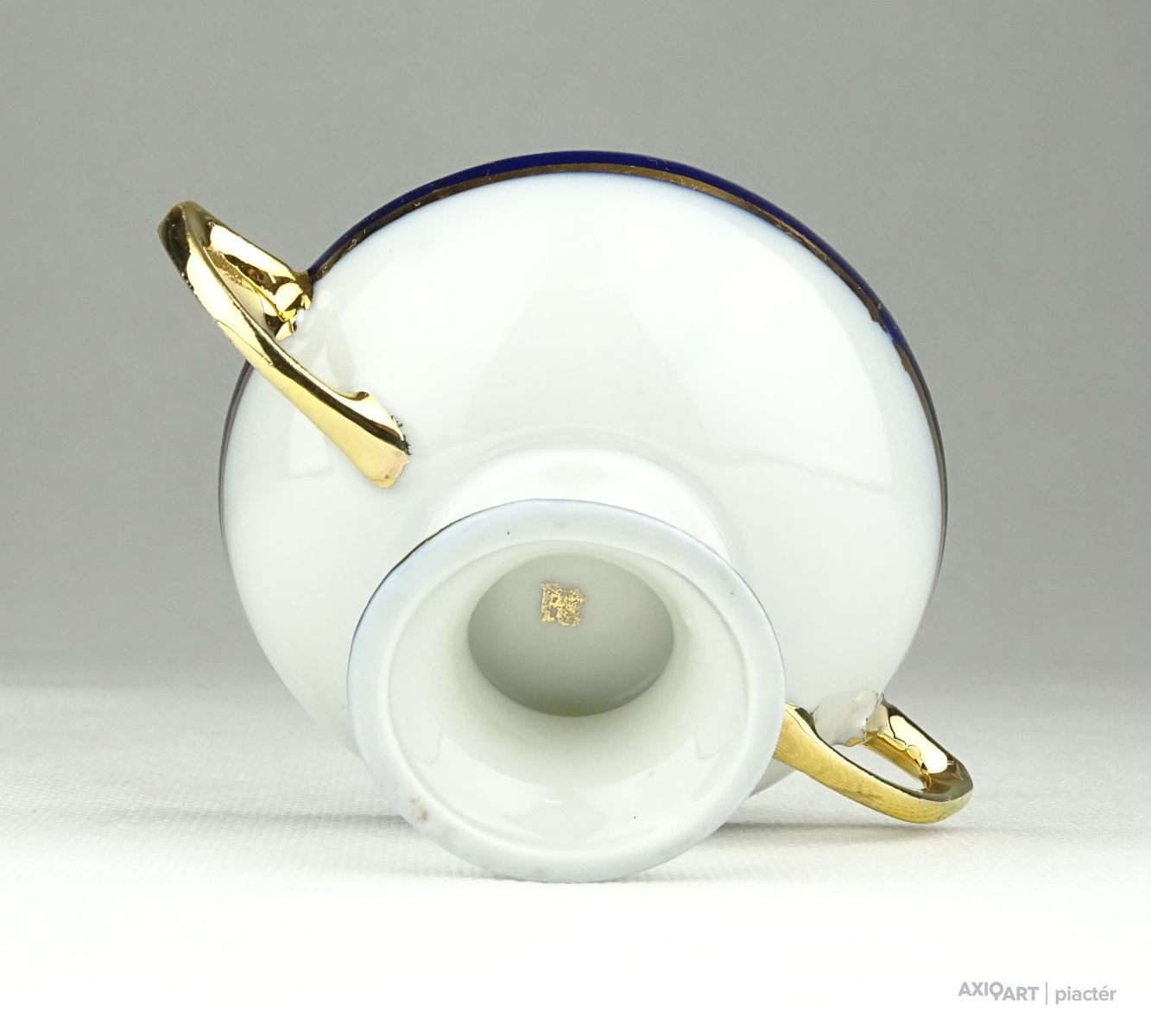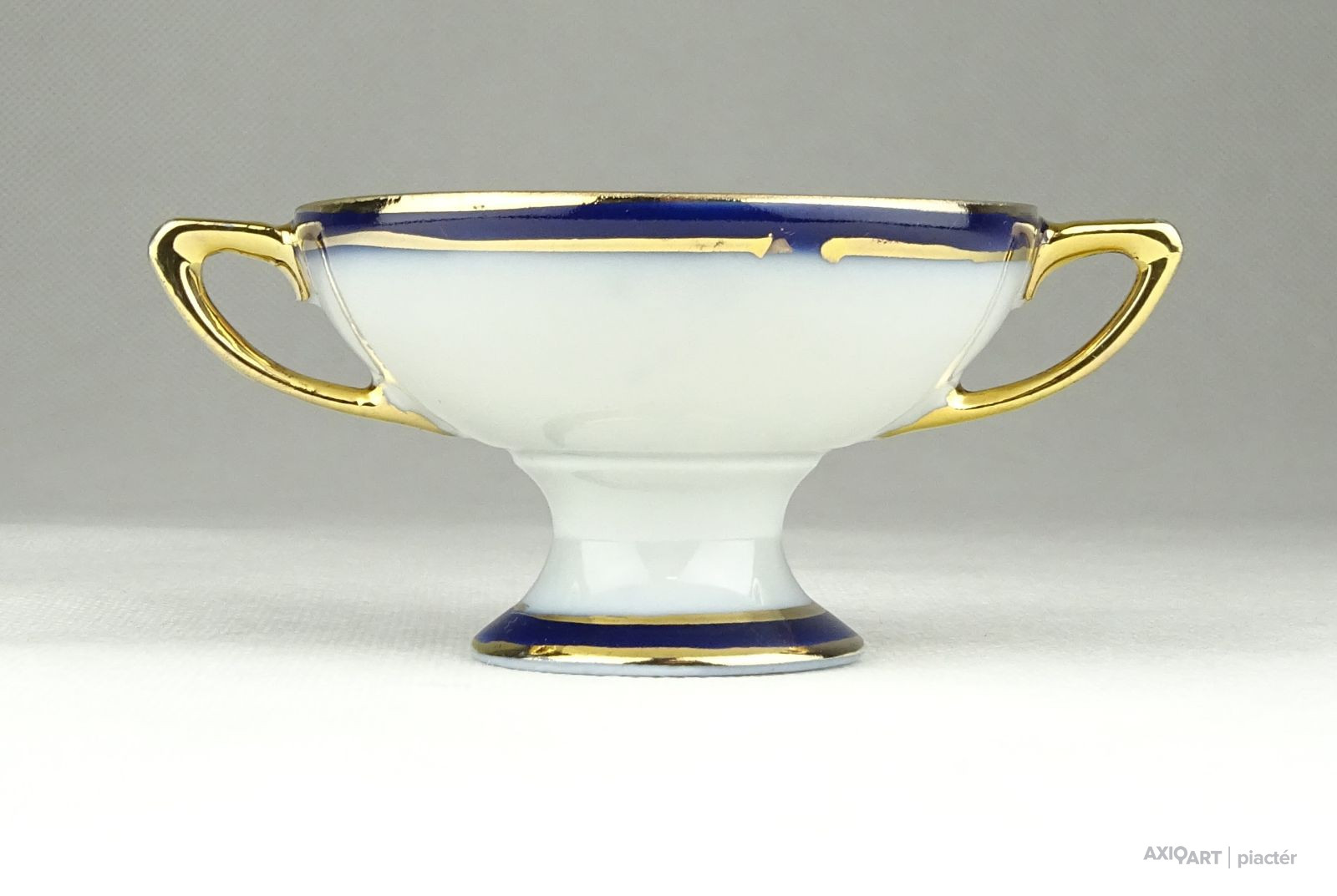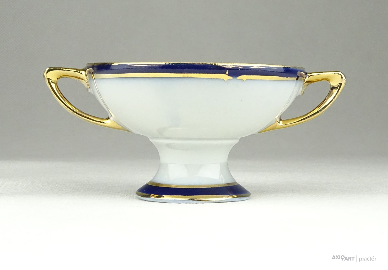 Régi, hibátlan állapotú, kisméretű aranyozott porcelán füles kínáló alakú dísztárgy, porcelán nipp.