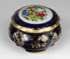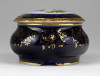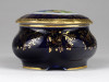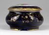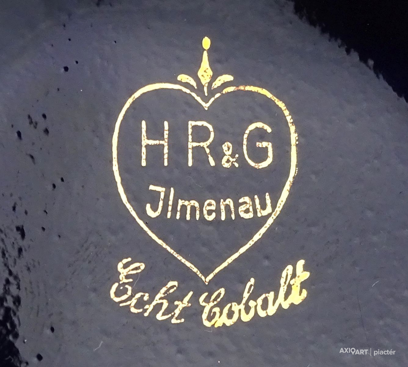 [1K480/X110] Régi hibátlan állapotú jelzett kobaltkék színű gazdagon aranyozott, porcelán gyűrűtartó, ékszertartó bonbonier. Barokkos forma, négy lábon álló bonbonier. A tetején háromalakos Ámor allegorikus jelenet látható. Alján jelzés arannyal: HR&G JLMENAU ECHT KOBALT Magasság: 5.5 cm Szélesség: 8 cm Súly: 0.12 kg