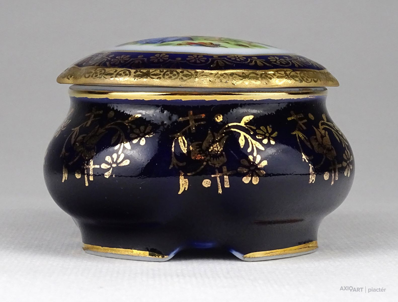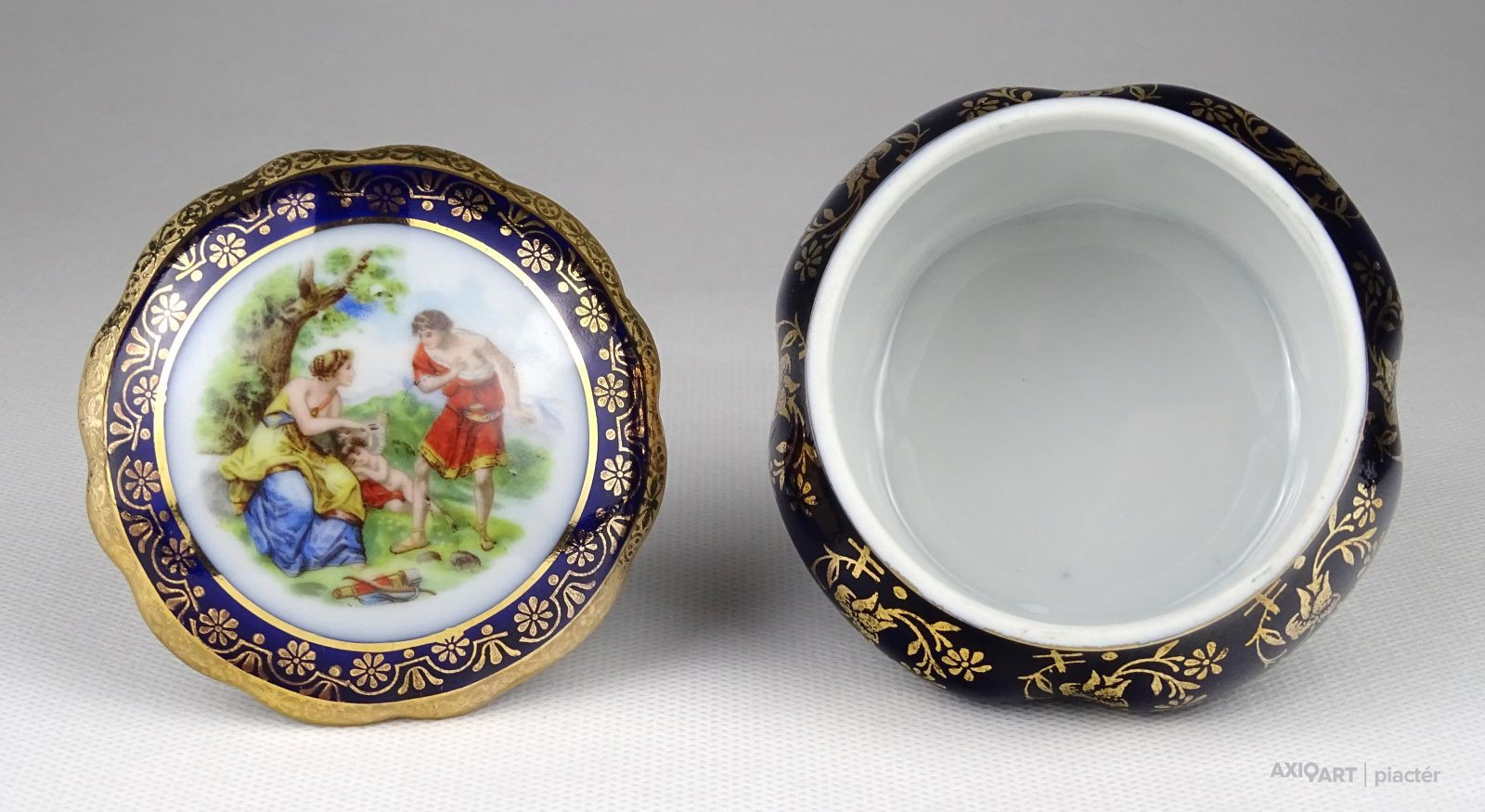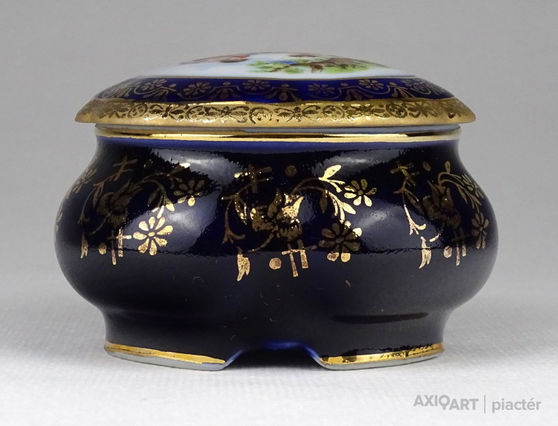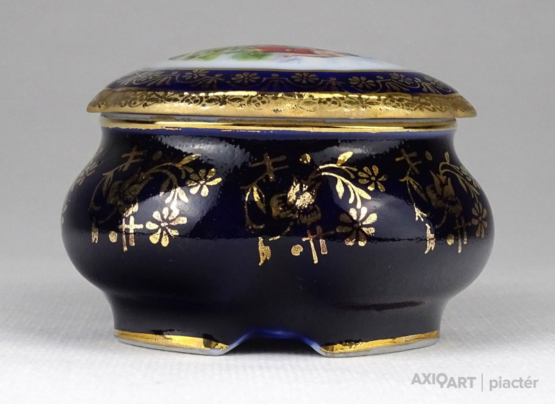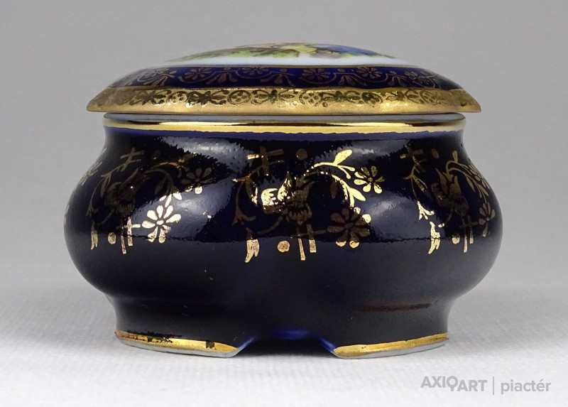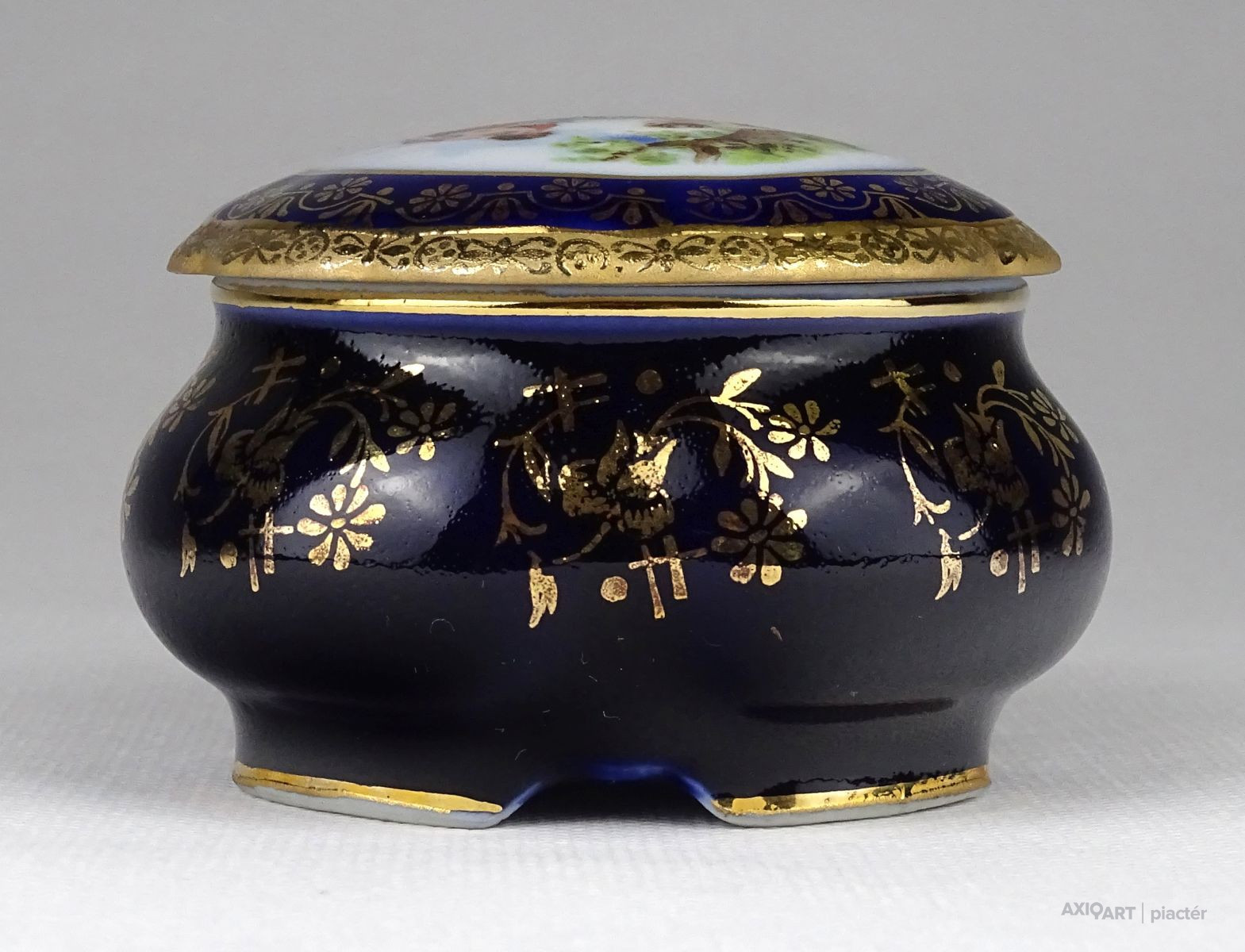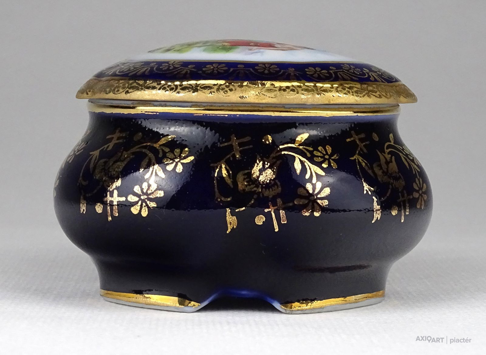 Régi hibátlan állapotú jelzett kobaltkék színű gazdagon aranyozott, porcelán gyűrűtartó, ékszertartó bonbonier. Barokkos forma, négy lábon álló bonbonier. A tetején háromalakos Ámor allegorikus jelenet látható.