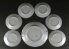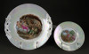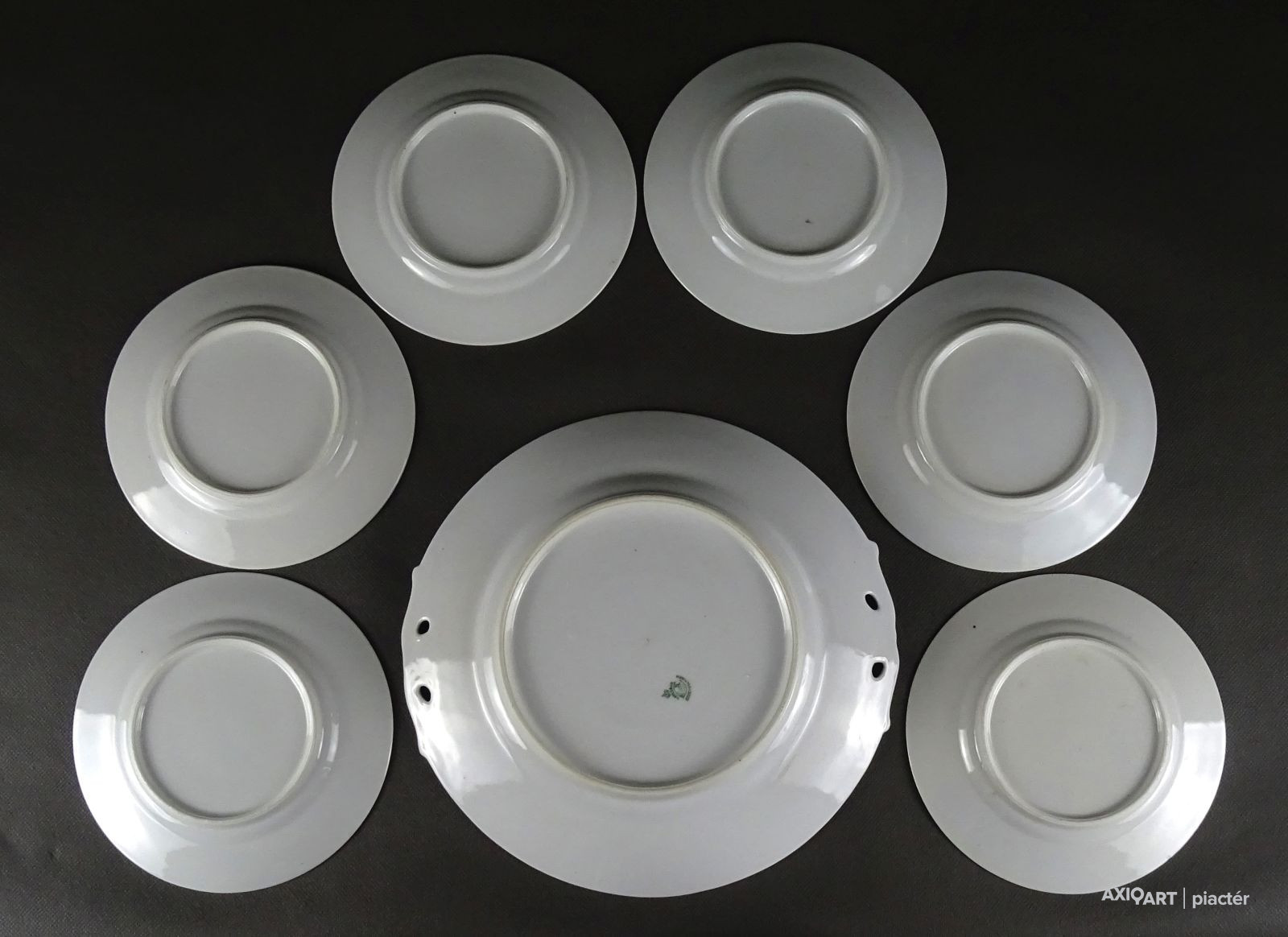 Régi szép állapotú, jelzett porcelán süteményes készlet. Szélén irizáló felületű, közepén többalakos allegorikus jelenetekkel díszített készlet.