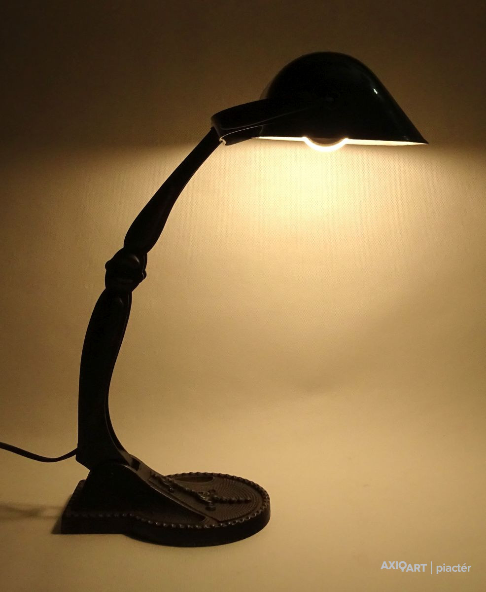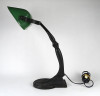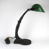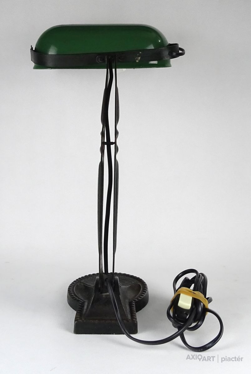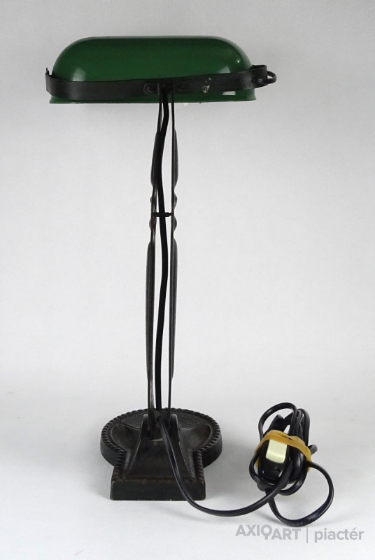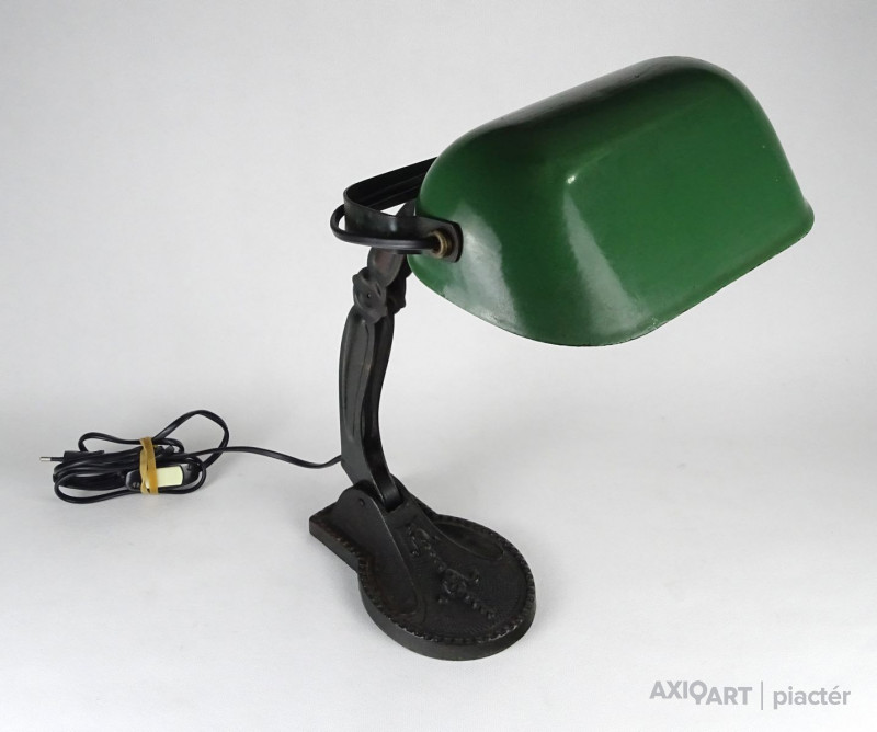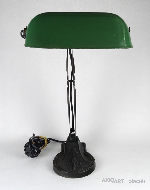 Nagyon régi, működő állapotban lévő öntöttvas fém talpas méregzöld színű fém burás banklámpa, íróasztali lámpa. A lámpa burája zománcozott. Nagy méretű (E27) izzó való bele.