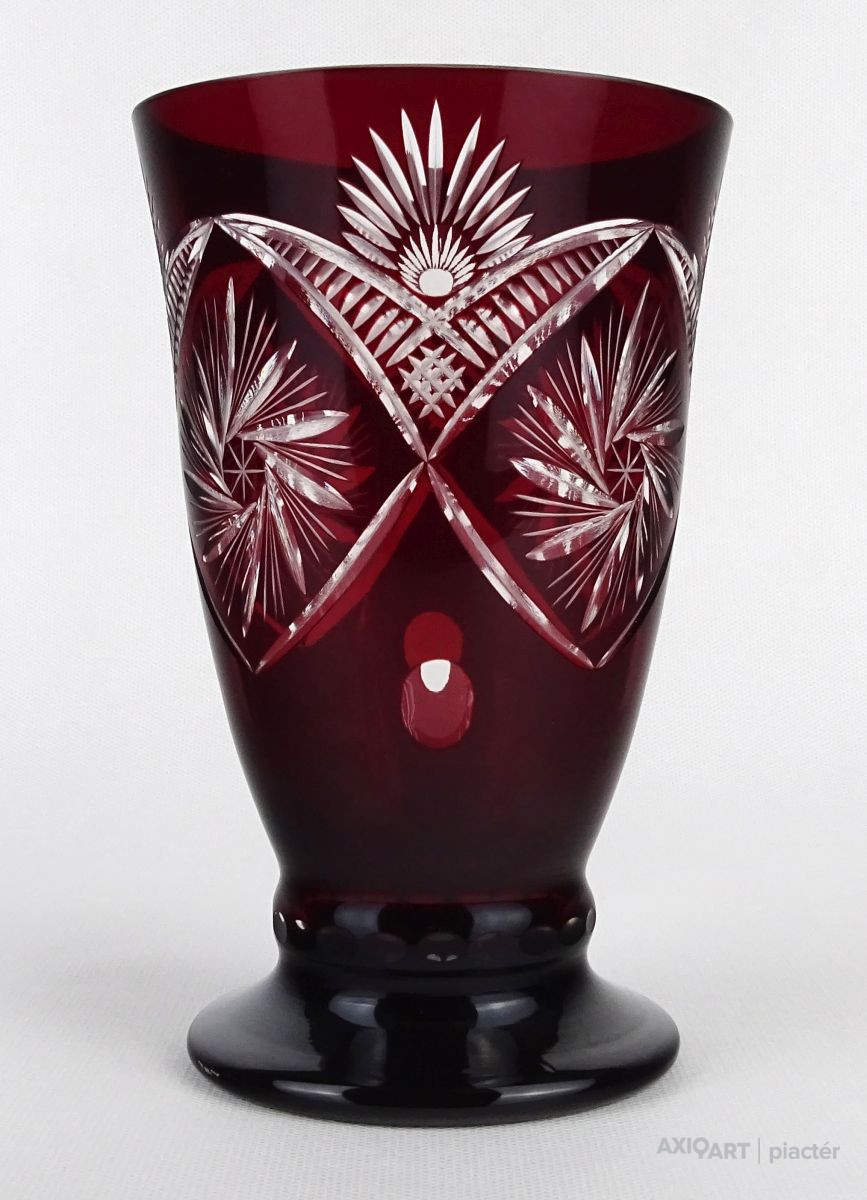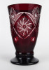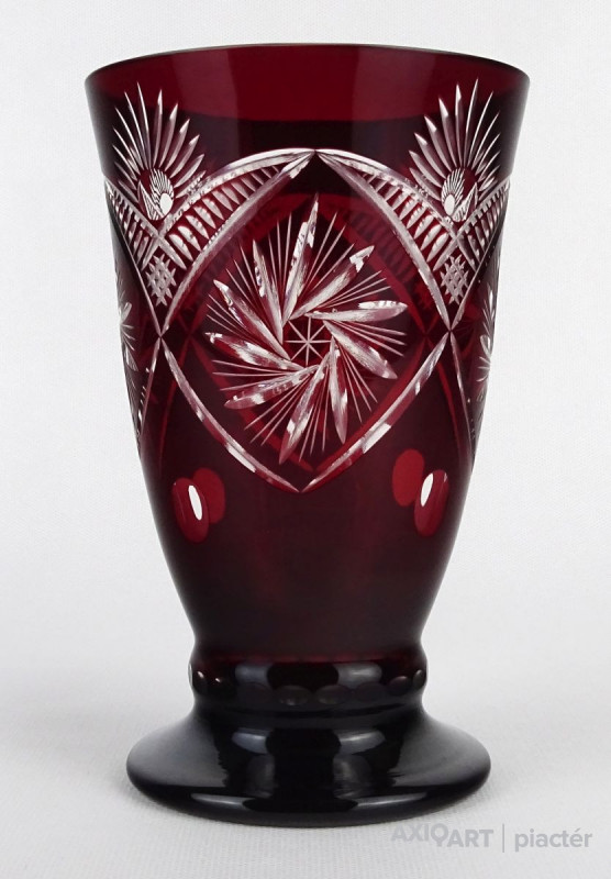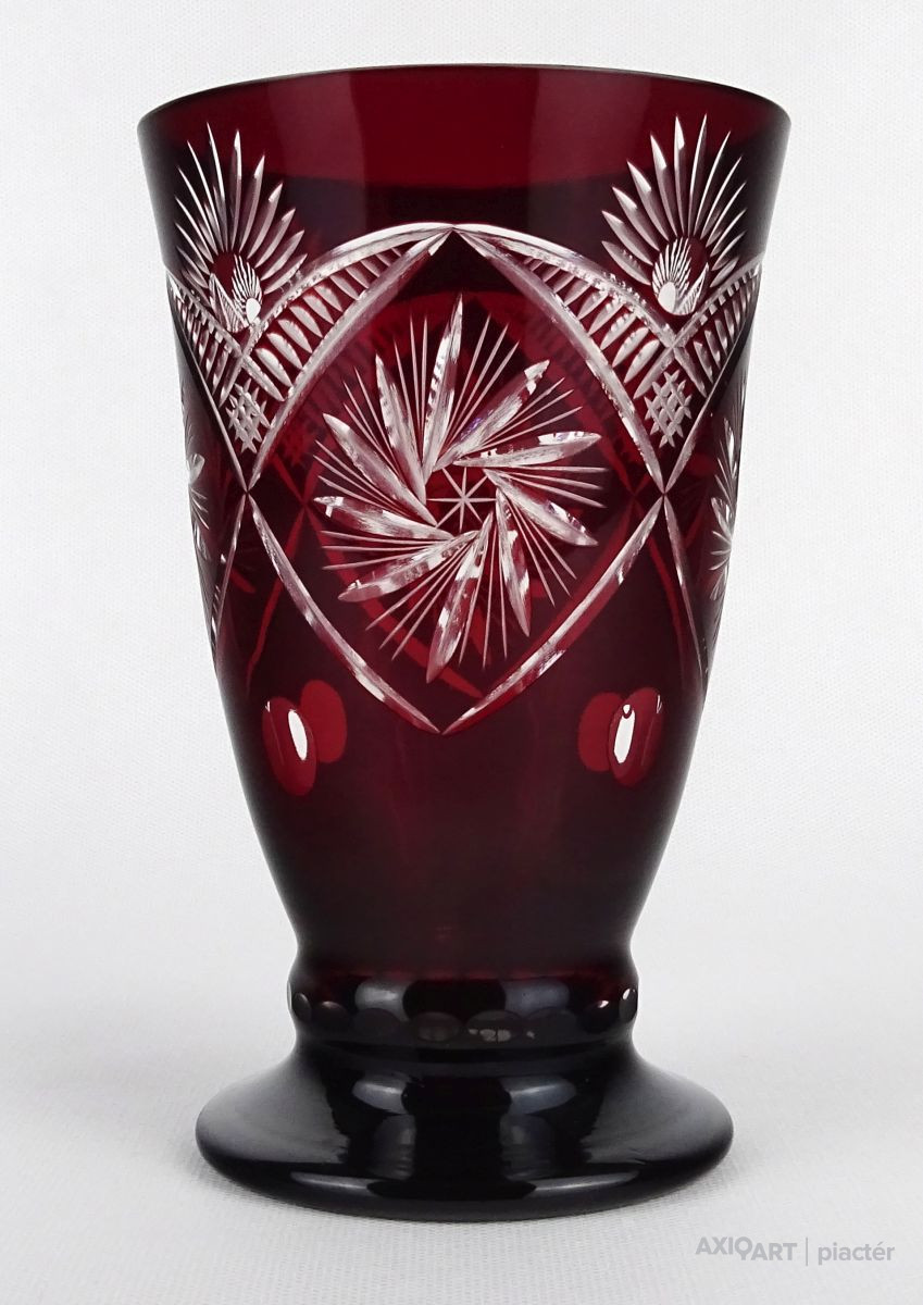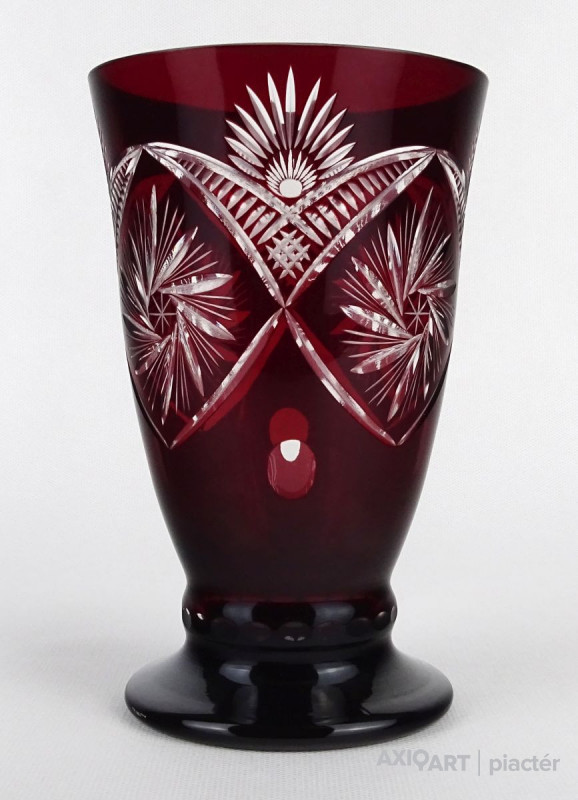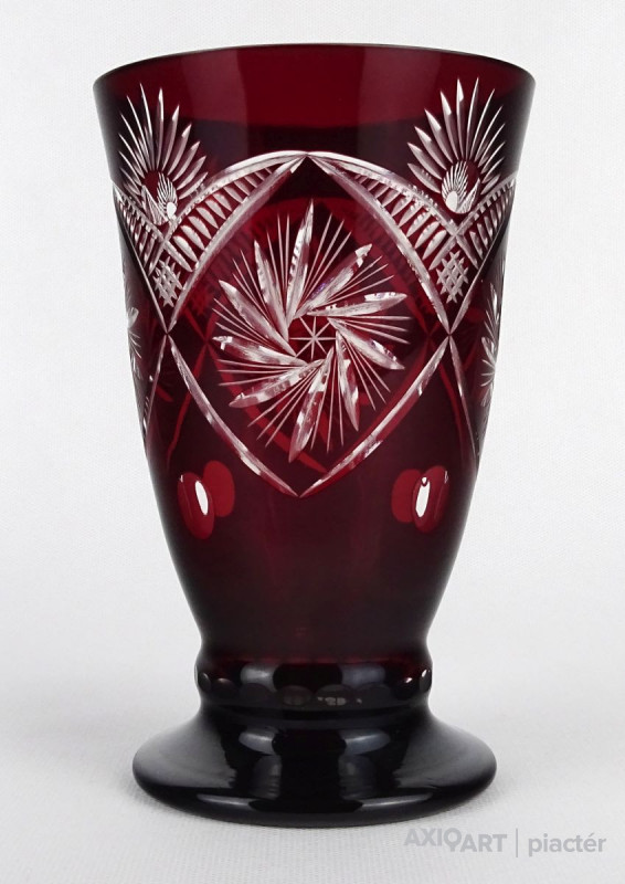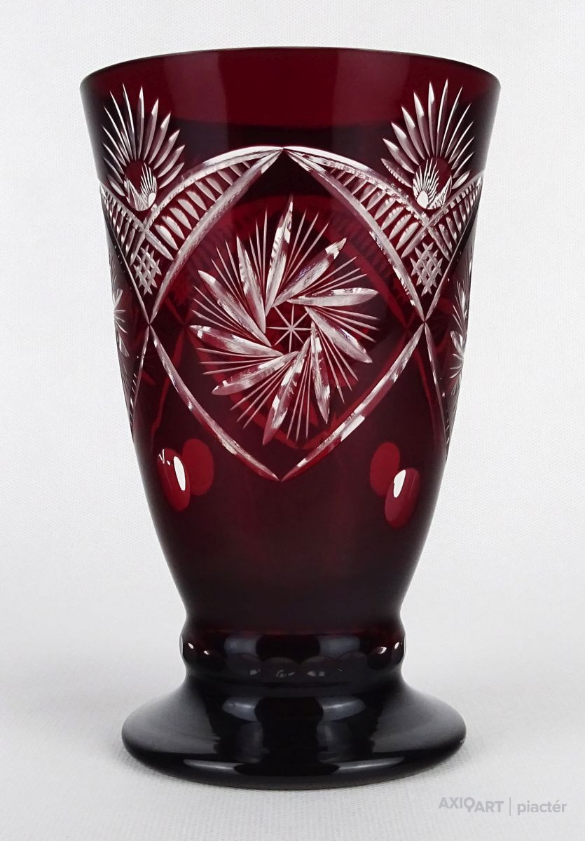 Hibátlan állapotú, bordóra színezett, csiszolt, gazdagon díszített, kehely alakú talpas kristály váza.