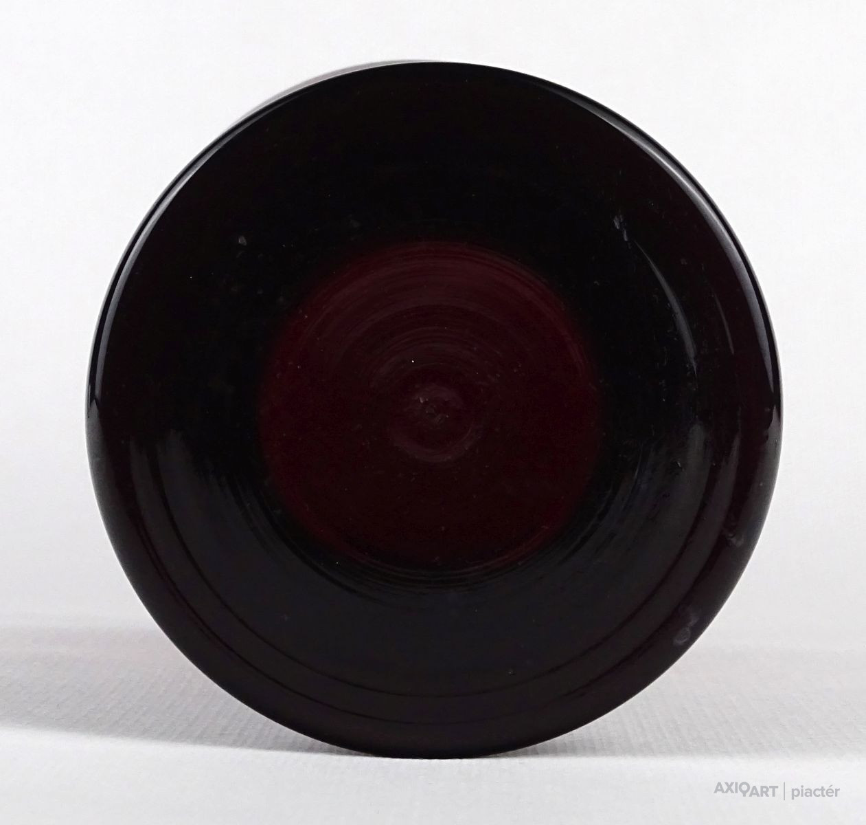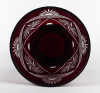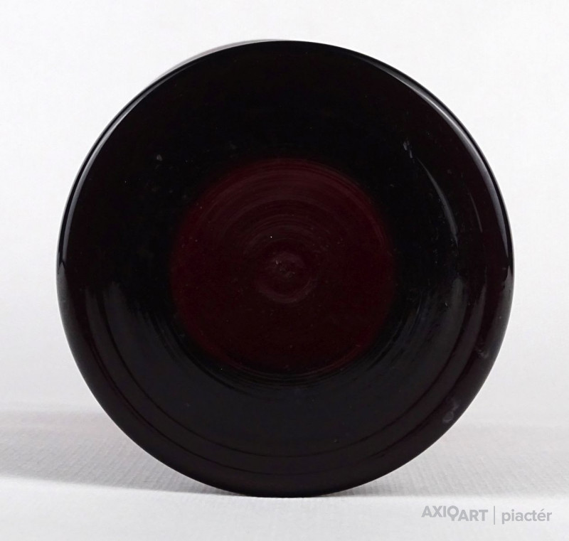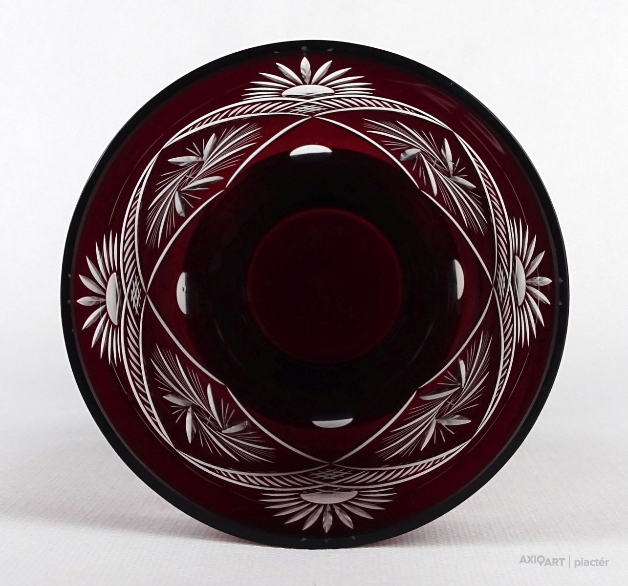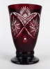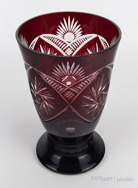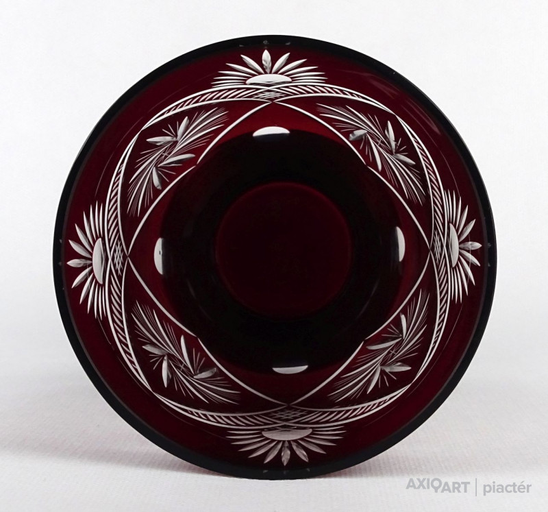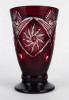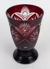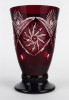 Hibátlan állapotú, bordóra színezett, csiszolt, gazdagon díszített, kehely alakú talpas kristály váza.