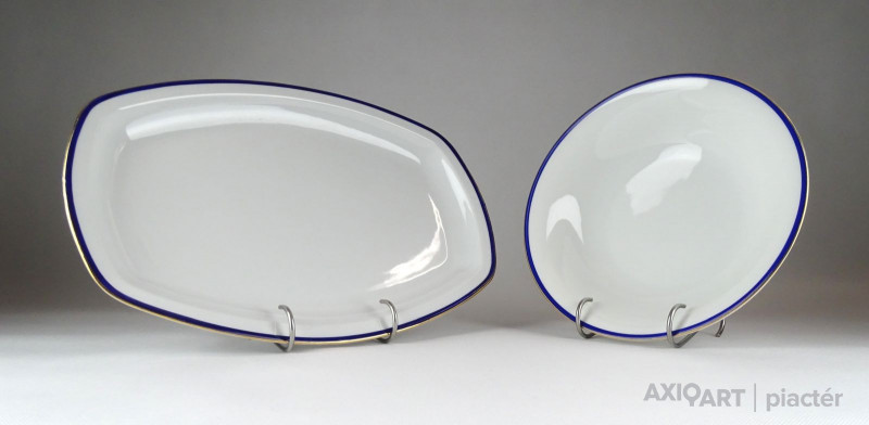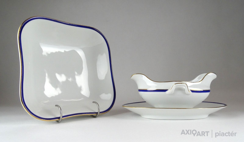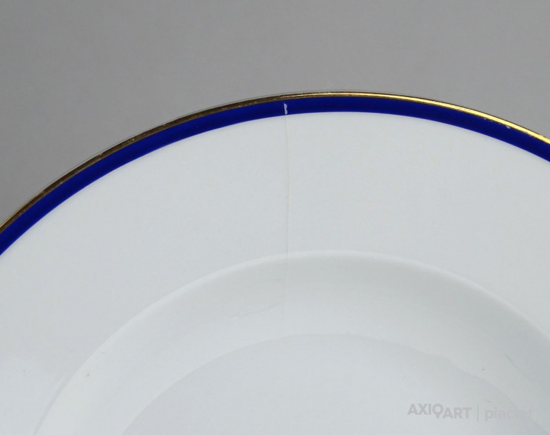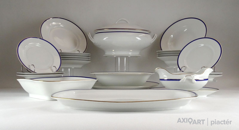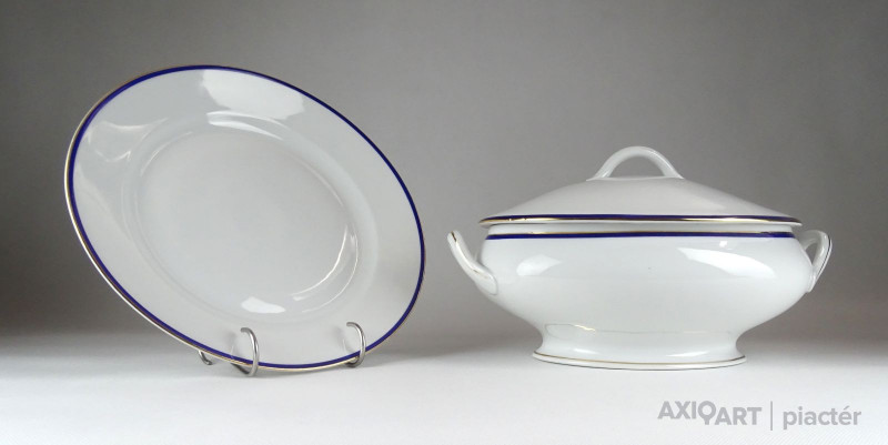 [1D207/X307] Szép állapotú 23 darabos Zsolnay porcelán étkészlet és süteményes készlet kobaltkék és aranyozott széllel. Alján Zsolnay öttornyú pajzspecsétes márkajelzés: ZSOLNAY PÉCS Az étkészlet darabjai: - 1 darab fedeles leveses tál (19 x 21.5 x 33.5 cm) - 5 darab leveses mélytányér (24 cm) Egyik darabon hajszálrepedés található, lásd fotó. - 6 darab lapostányér (24 cm) - 1 darab szószos, mártásos tál (9.7 x 15 x 23.5 cm) - 1 darab ovális pecsenyés kínáló tál (26.5 x 37 cm) - 1 darab szögletes tésztás tál (6 x 21 x 22 cm) - 1 darab kerek kínáló tál (6.5 x 25.5 cm) A süteményes készlet darabjai: - 1 darab nagy méretű süteményes tál (30 cm) - 6 darab süteményes kistányér (18 cm) Súly: 11.925 kg