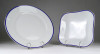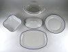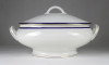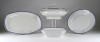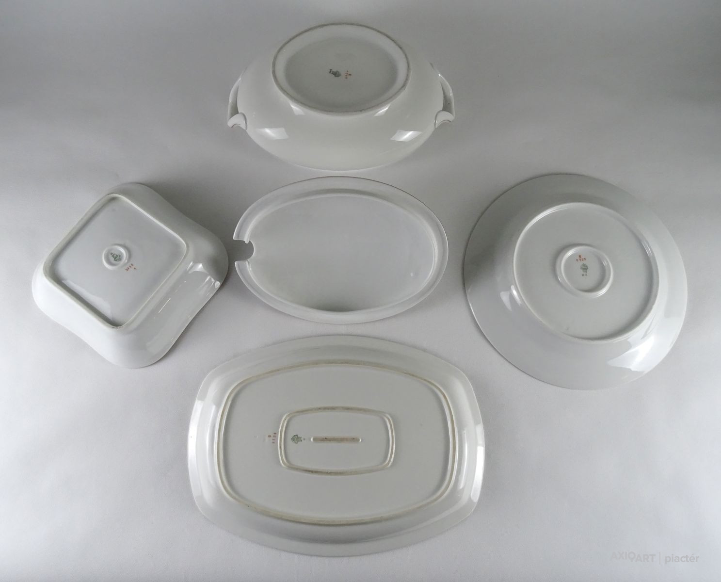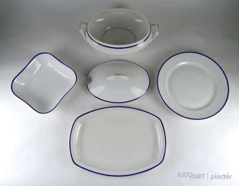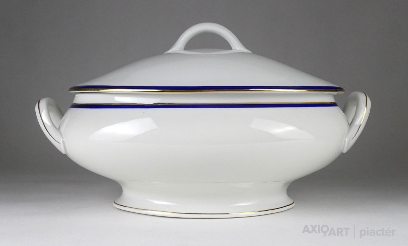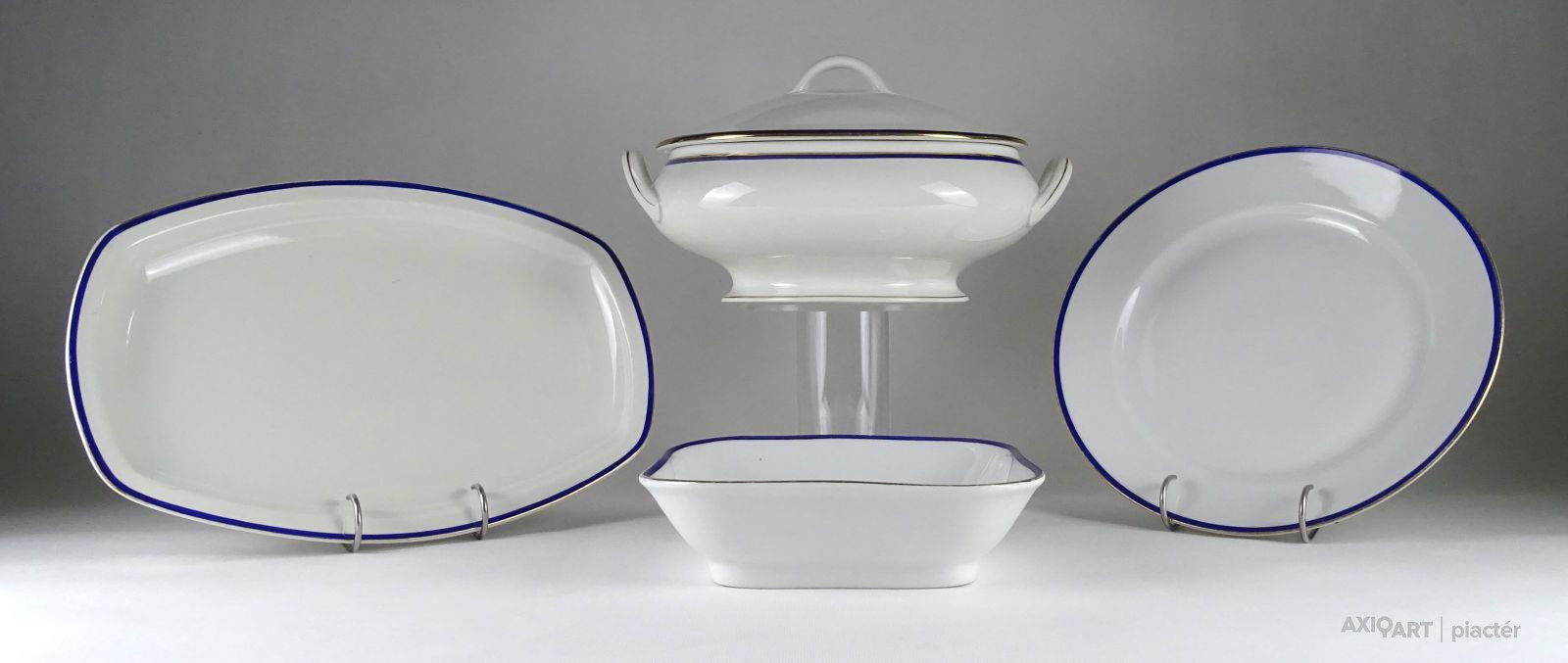 [1I858/X186] Szép állapotú Zsolnay porcelán étkészlet, kobaltkék és aranyozott széllel. Alján Zsolnay öttornyú pajzspecsétes márkajelzés: ZSOLNAY PÉCS Az étkészlet darabjai: - 1 darab fedeles leveses tál (18 x 21.5 x 33.5 cm) - 1 darab ovális pecsenyés kínáló tál (26 x 37 cm) - 1 darab szögletes tésztás tál (6 x 21.5 x 22 cm) - 1 darab kerek kínáló tál (30 cm) Súly: 4.605 kg