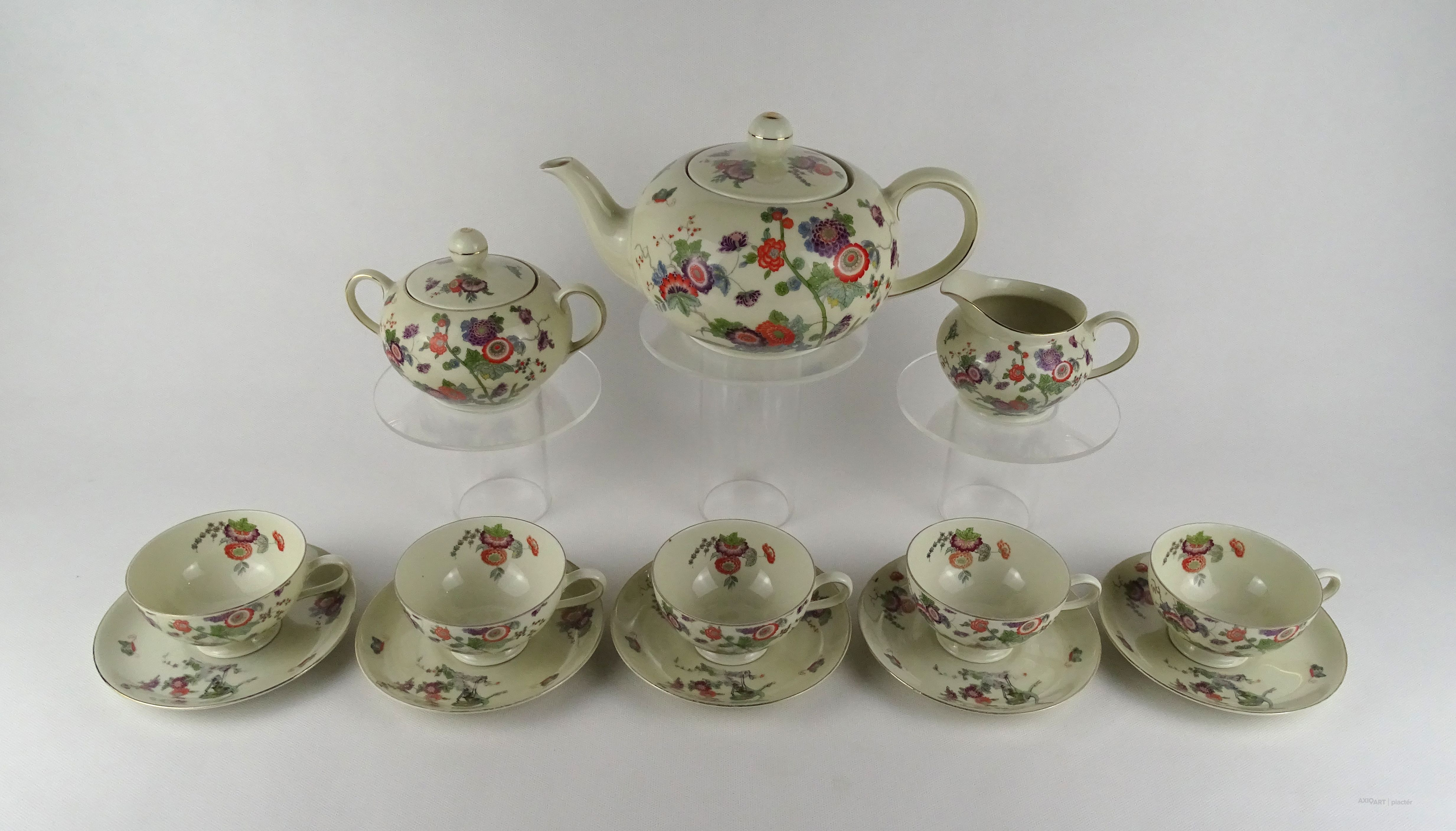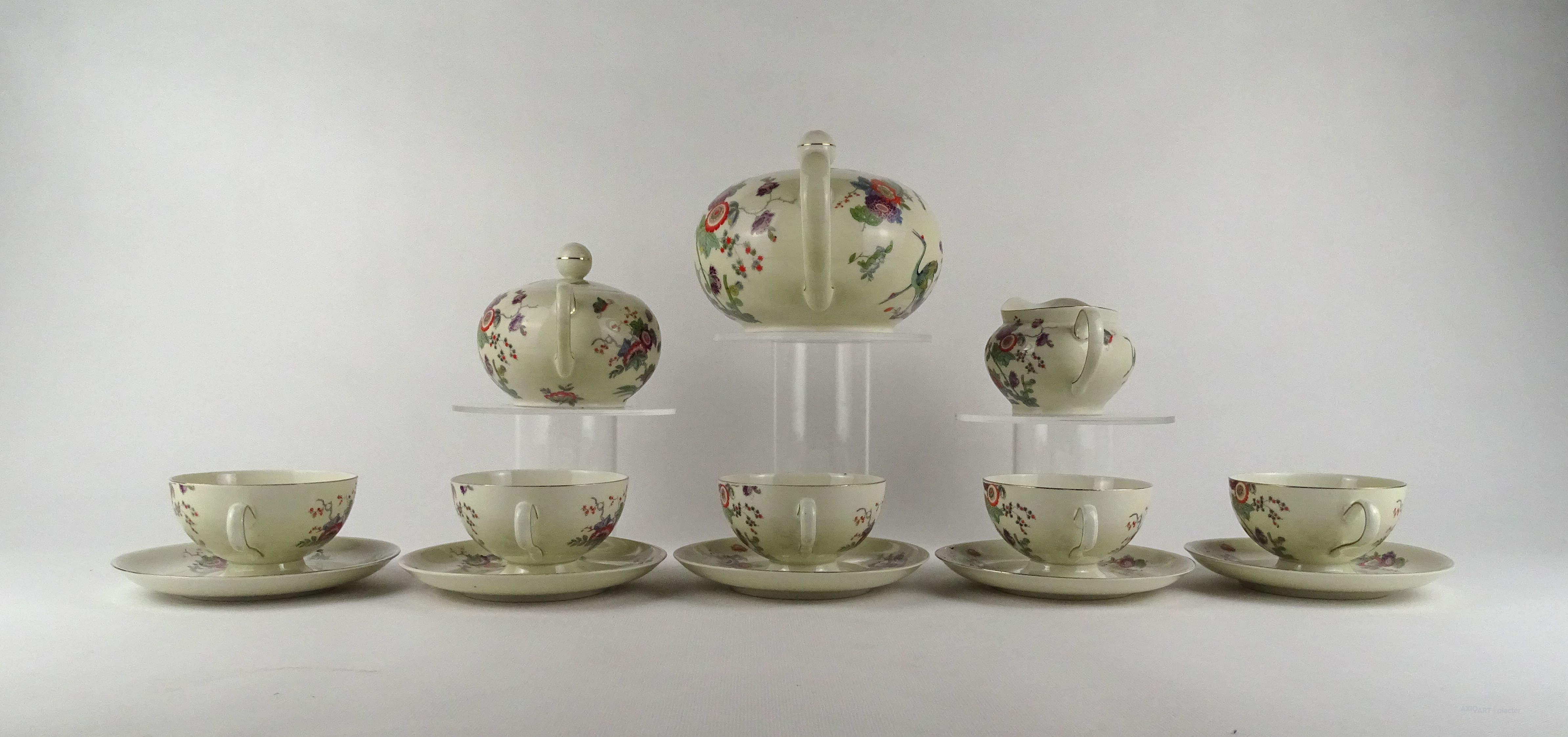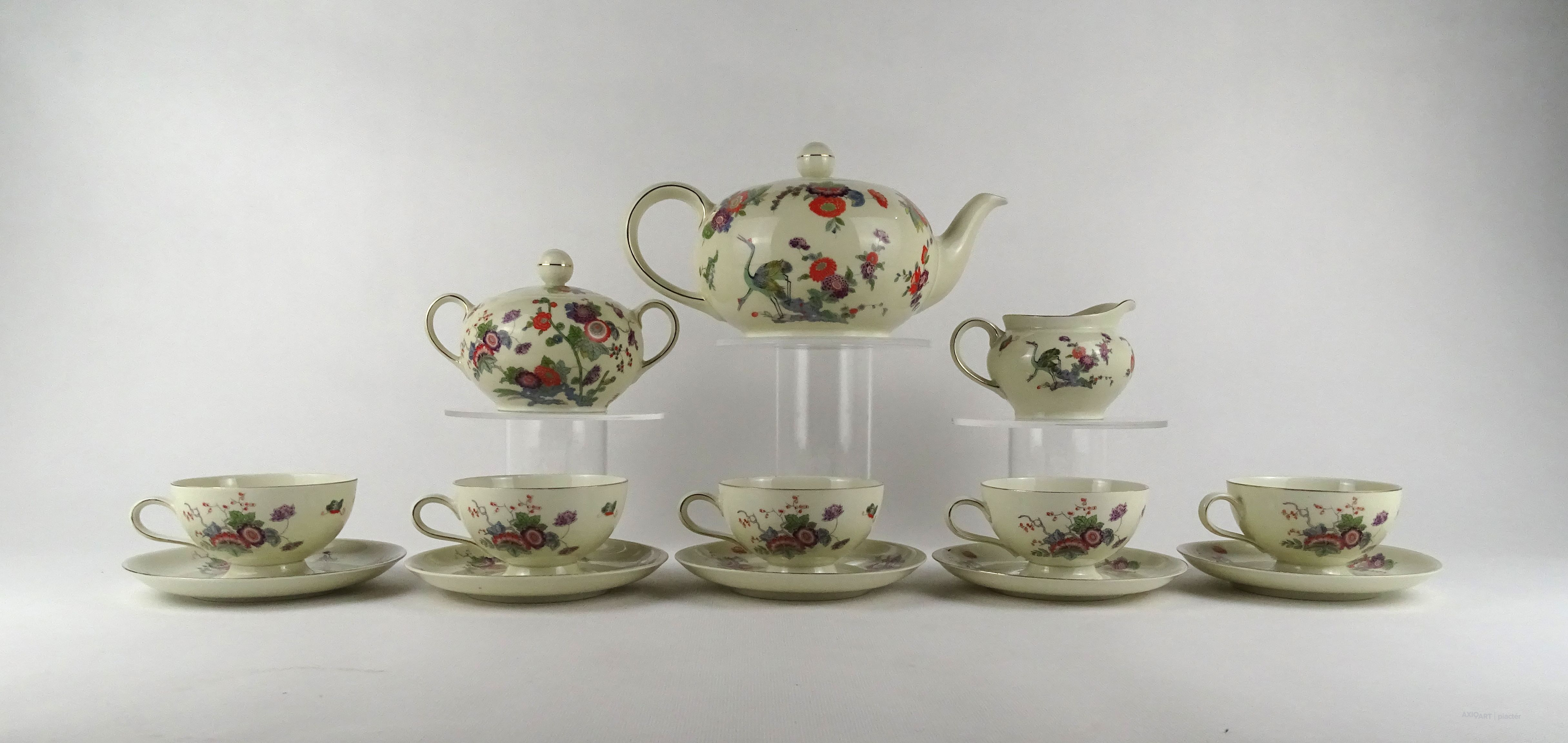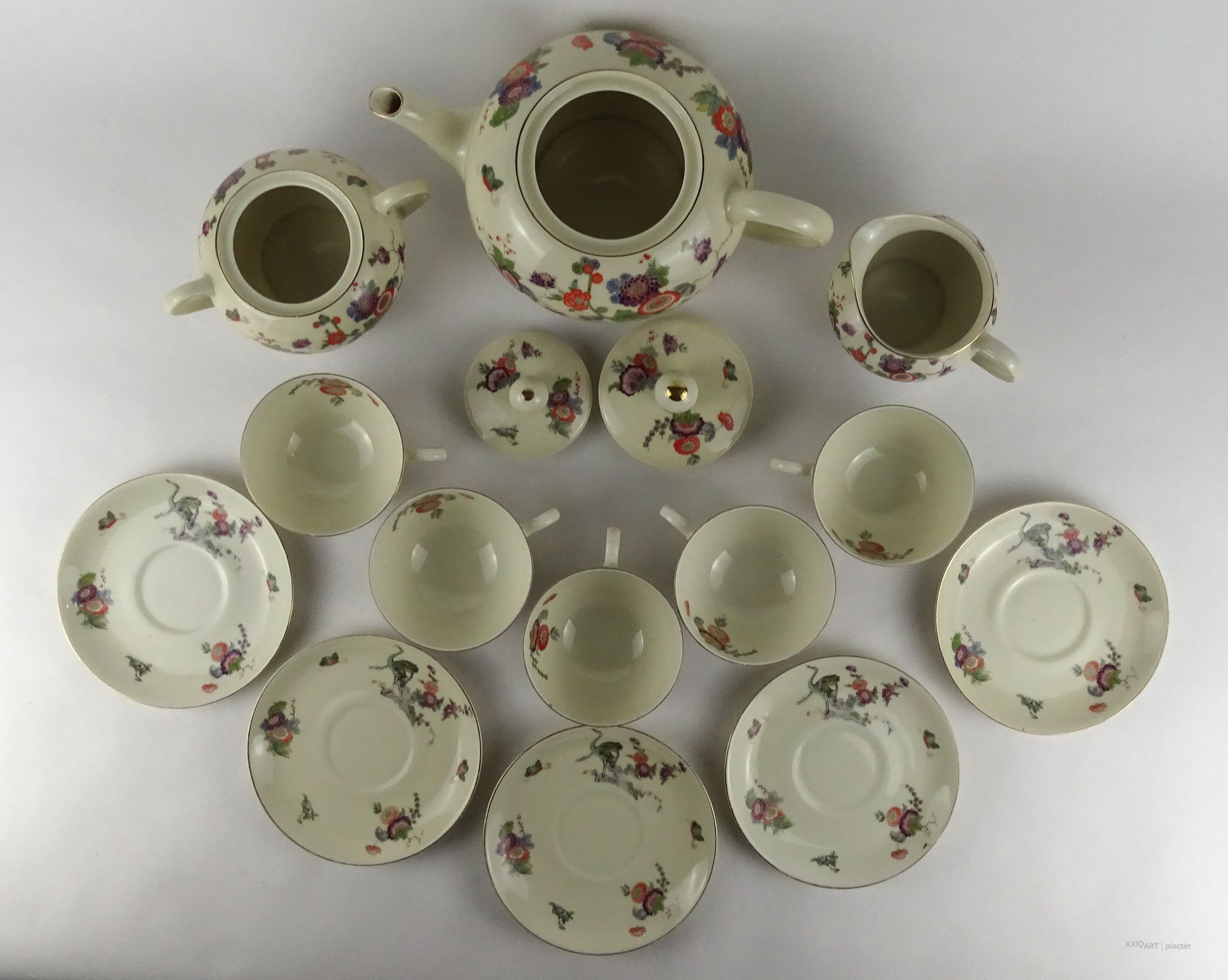 Régi, hibátlan állapotú, öt személyes, jelzett, vajszínű porcelán teás készlet. Keleti stílusú festéssel, darvakkal és virágmintákkal díszítve, aranyozott szegéllyel.