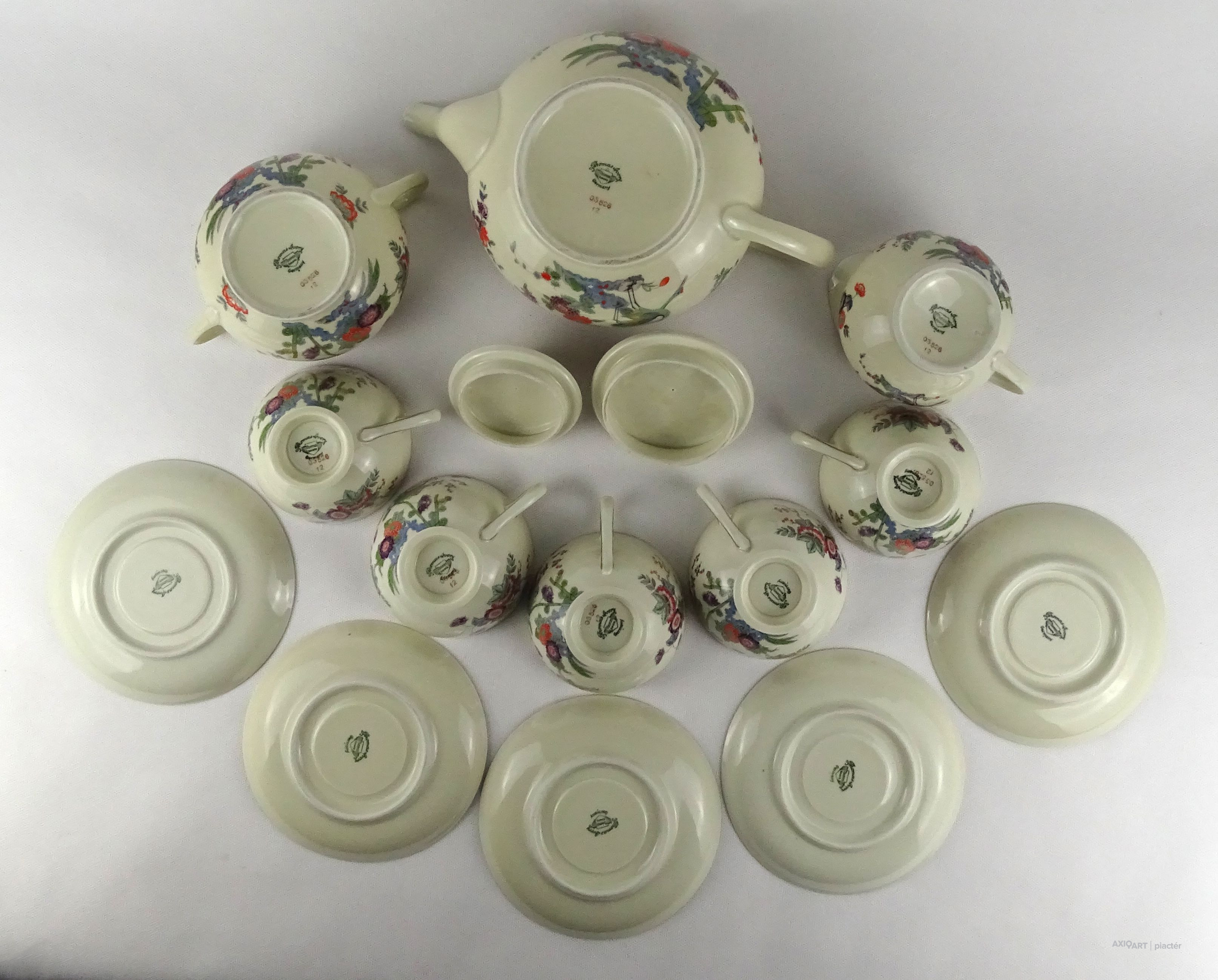 [1T971/Z271] Régi, hibátlan állapotú, öt személyes, jelzett, vajszínű porcelán teás készlet. Keleti stílusú festéssel, darvakkal és virágmintákkal díszítve, aranyozott szegéllyel. Alján zöld jelzés: THOMAS IVORY THOMAS BAVARIA GERMANY Formaszám: 03526 12 A készlet darabjai: - 5 darab teás csésze (5.5 x 9.5 cm) - 5 darab csésze alj (14.6 cm) - 1 darab teás kanna (13.5 x 17 x 27 cm) - 1 darab cukortartó (10.3 x 12 x 17 cm) - 1 darab tejkiöntő (8.2 x 10.4 x 13.5 cm) Súly: 2.26 kg