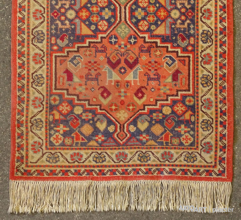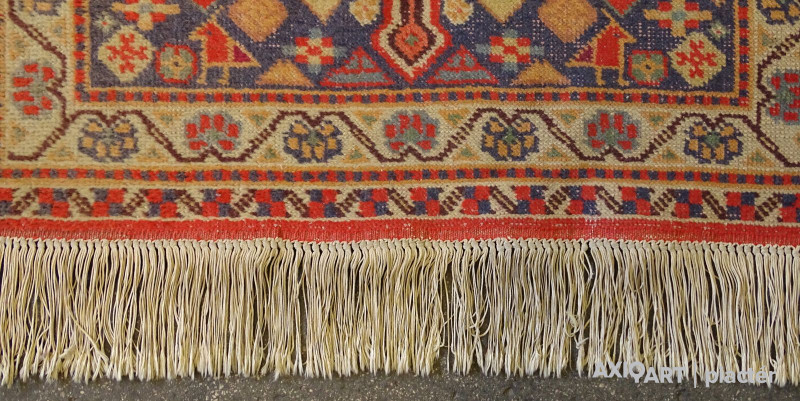 1920-as évekbeli, szép állapotú, összekötő szőnyeg. Piros, bordó, kék színű szép állapotú, nem kopott szőnyeg, hosszú rojtokkal.