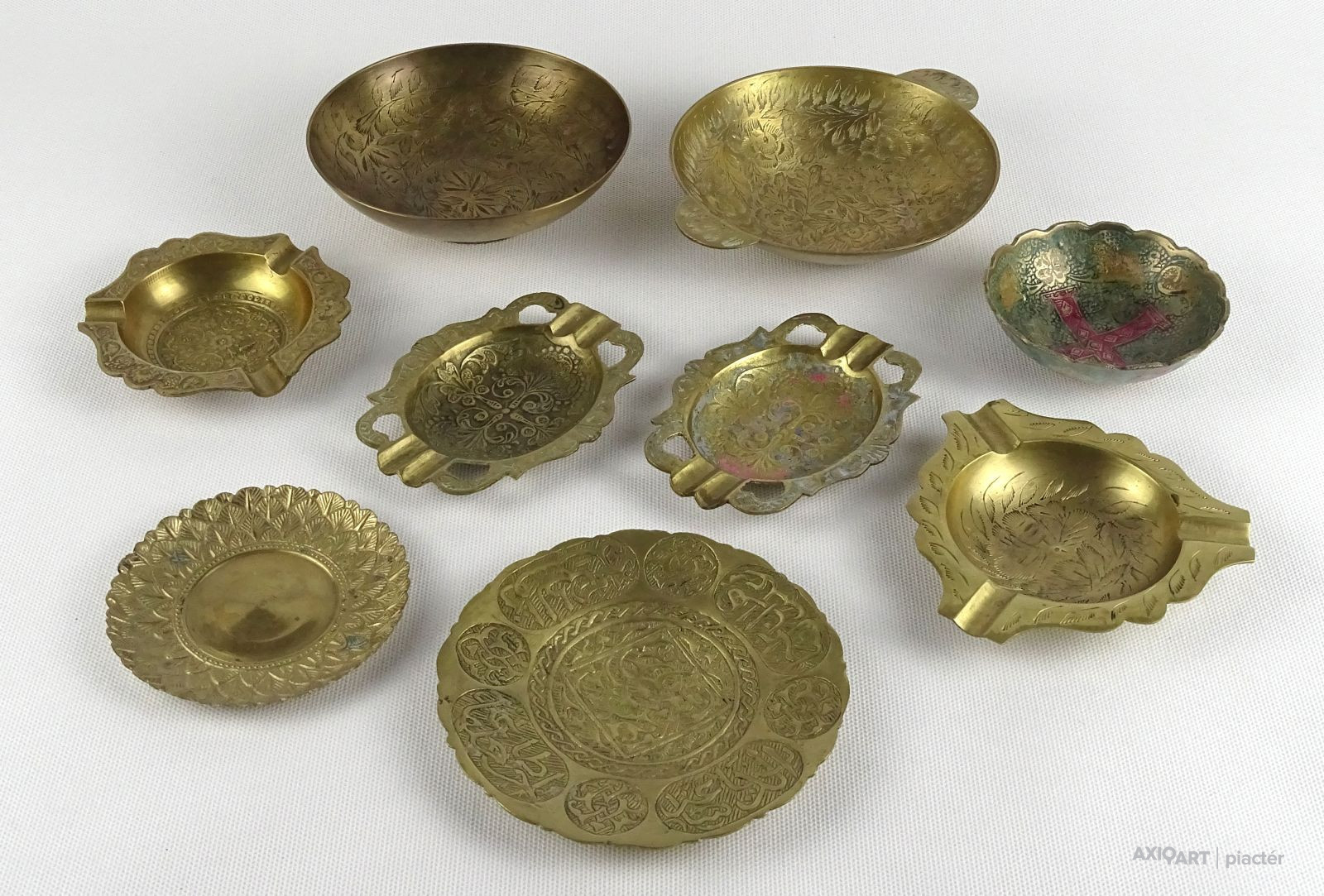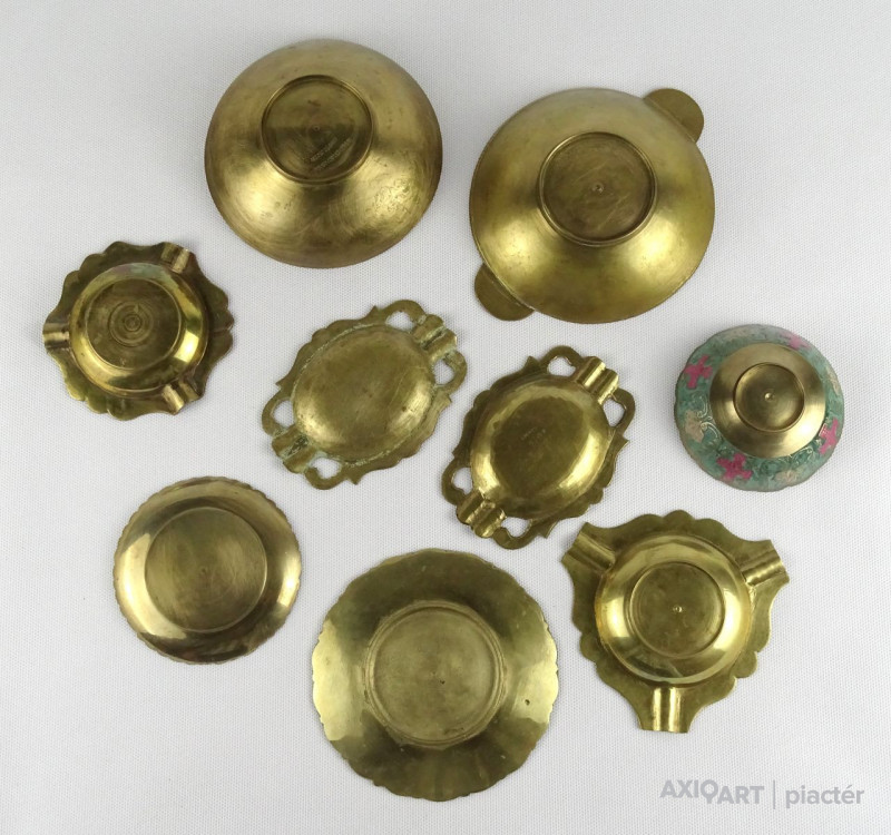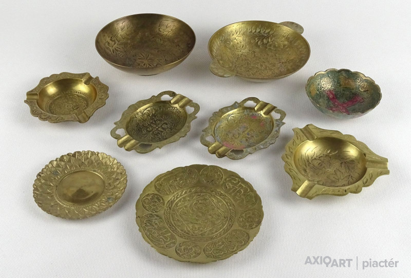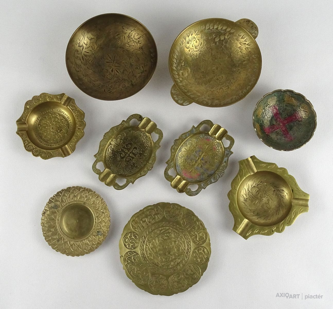 [1S278/X065] Hibátlan állapotú, gazdagon díszített réz hamutál: - 2 darab egyforma áttört széllel (8 x 11 cm) - 1 darab magas falú, levélmintás (3.5 x 12.5 cm) - 1 darab indiai magas falú, levélmintás, két füllel (3 x 12.8 x 15.8 cm) - 1 darab kis méretű levélmintás (9.5 cm) - 1 darab három állásos levélmintás (1.5 x 11 cm) - 1 darab három állásos virágmintás (1.5 x 9.8 cm) - 1 darab arab feliratos, lapos (12.2 cm) - 1 darab festett, Bethehem feliratos (2.7 x 8.7 cm) Súly: 0.895 kg