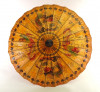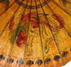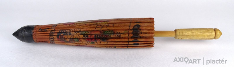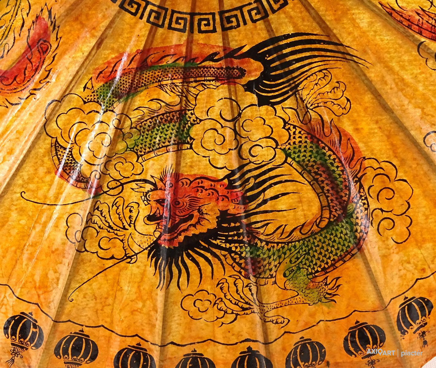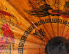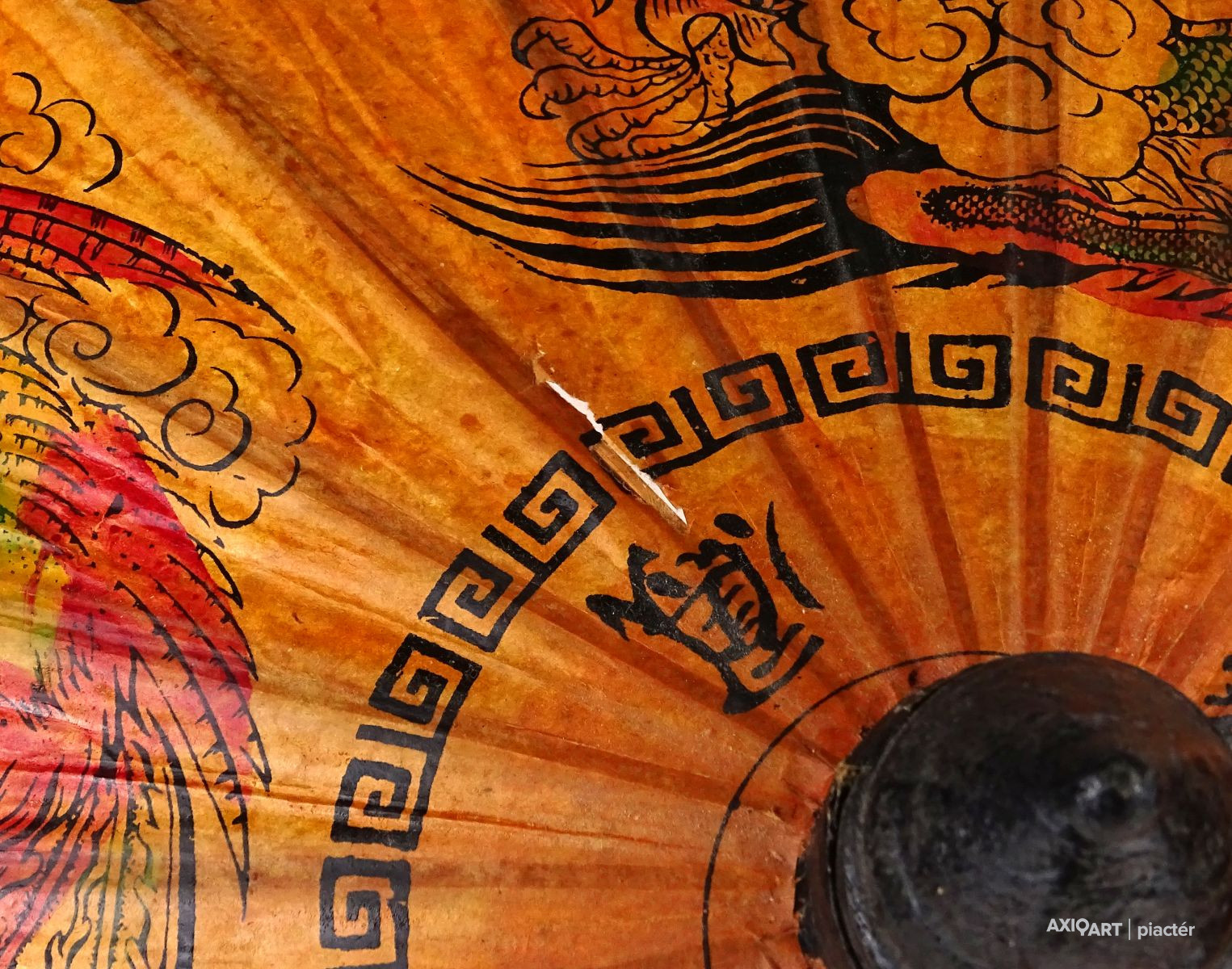 Régi, fa nyelű, keleti stílusú papír napernyő. Bambusz szerkezet óvatosan, szépen működtethető. Az ernyő felülete kézifestéssel, sárkány motívumokkal és kalligráfiákkal díszített.