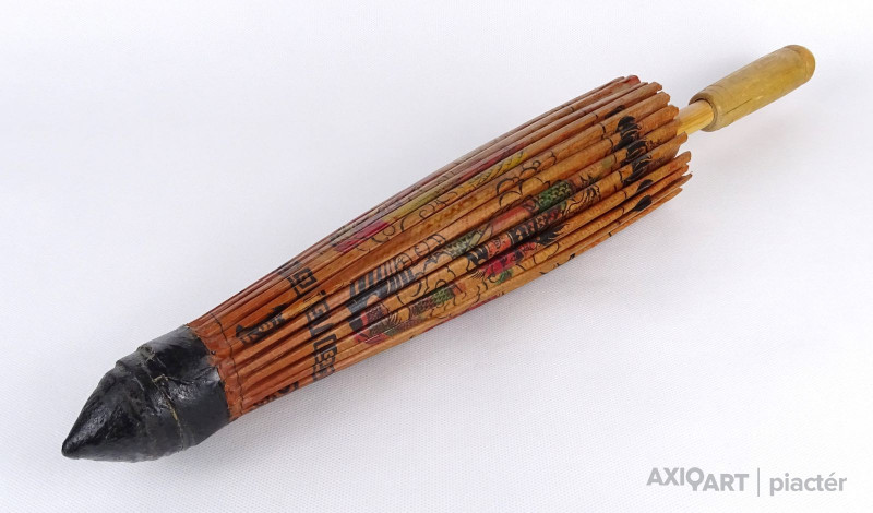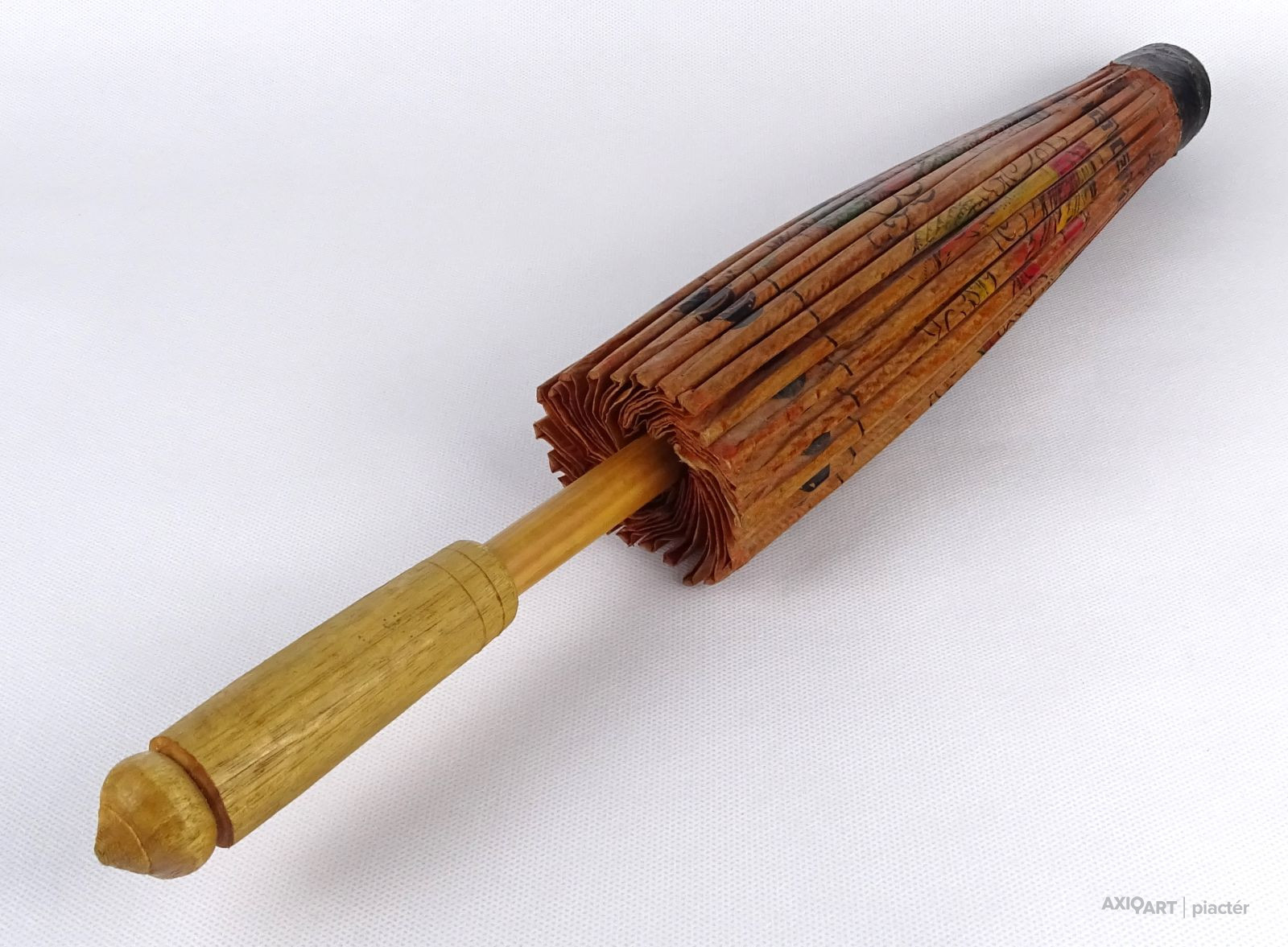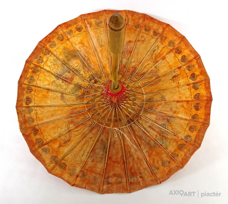 [1N759/X116] Régi, fa nyelű, keleti stílusú papír napernyő. Bambusz szerkezet óvatosan, szépen működtethető. Az ernyő felülete kézifestéssel, sárkány motívumokkal és kalligráfiákkal díszített. Szélesség: 55 cm Hosszúság: 49.5 cm Súly: 0.175 kg