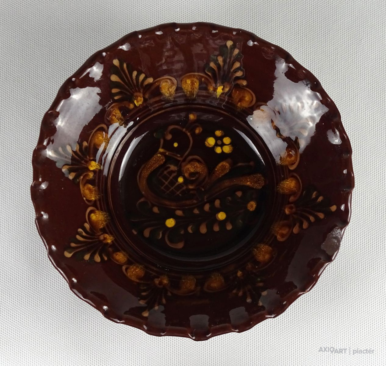 - 1 darab régi kazincbarcikai jelzett fodros Tarczy madaras kerámia tál kisebb hibával a szélén (5.5 x 20 cm)