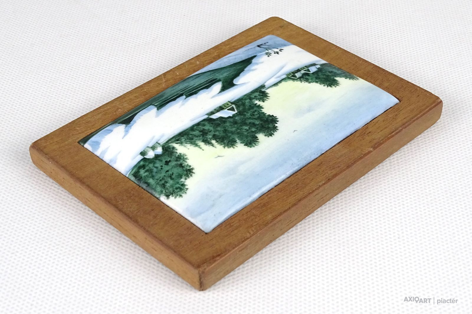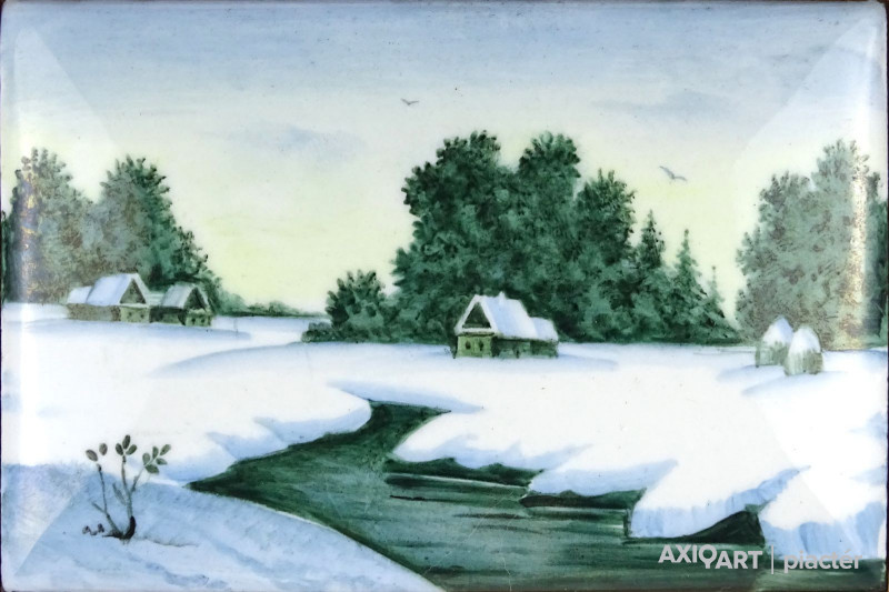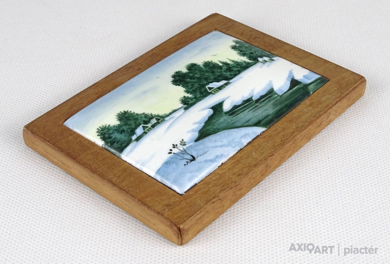 Régi egyszerű keretben, fa táblára illesztett kis méretű hibátlan állapotú domború tűzzománc kép. Gyönyörű kézzel festett téli táj házakkal patakkal. Akasztási lehetőséggel rendelkezik.
