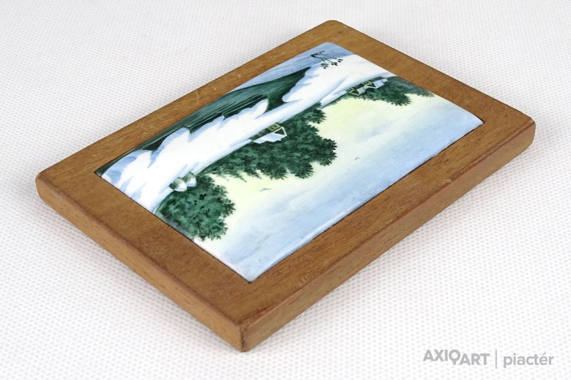 [1P224/Z009] Régi egyszerű keretben, fa táblára illesztett kis méretű hibátlan állapotú domború tűzzománc kép. Gyönyörű kézzel festett téli táj házakkal patakkal. Akasztási lehetőséggel rendelkezik. Magasság: 8.5 cm Szélesség: 12 cm Súly: 0.125 kg
