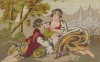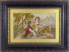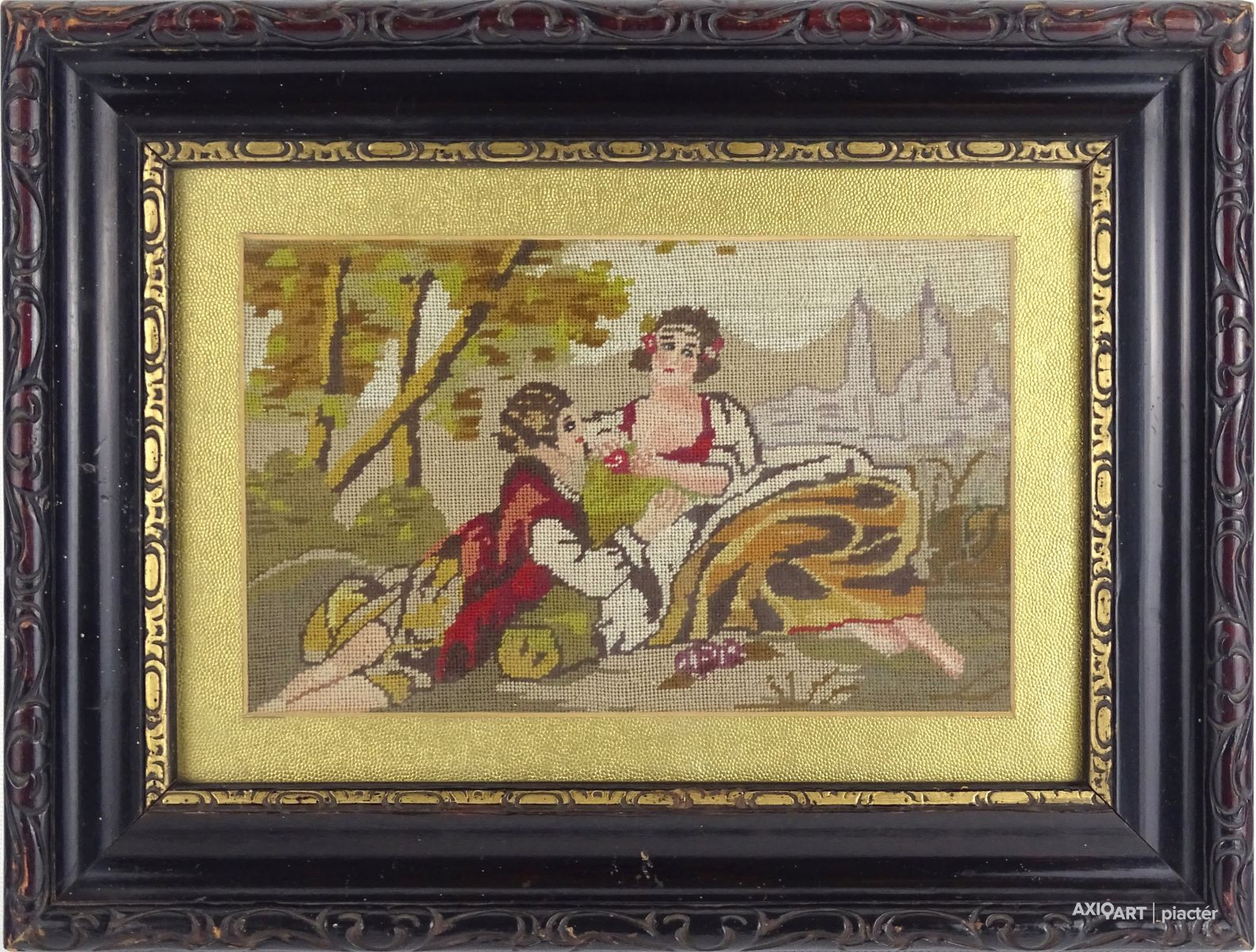 [1S545/074] Régi fekete keretben üveglap mögött, arany színű paszpartuban található, kétalakos romantikus piknik kézimunka gobelin. Akasztási lehetőséggel rendelkezik. Magasság: 31 cm Szélesség: 40.5 cm Súly: 0.925 kg