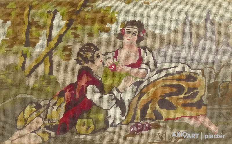 Régi fekete keretben üveglap mögött, arany színű paszpartuban található, kétalakos romantikus piknik kézimunka gobelin. Akasztási lehetőséggel rendelkezik.