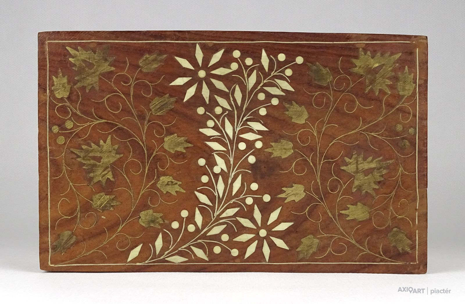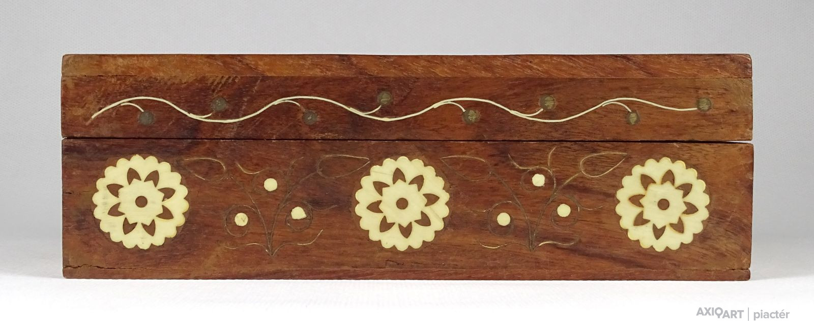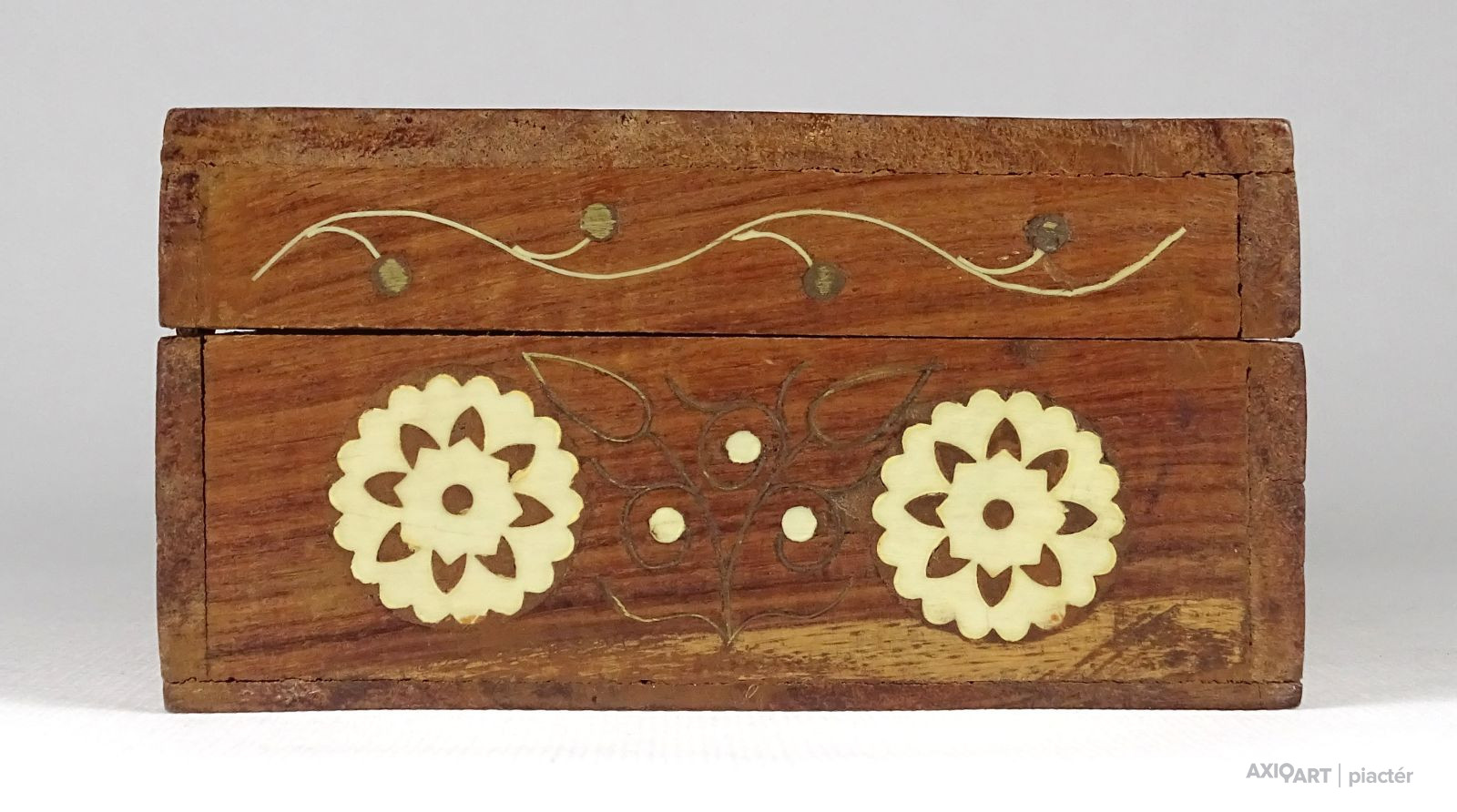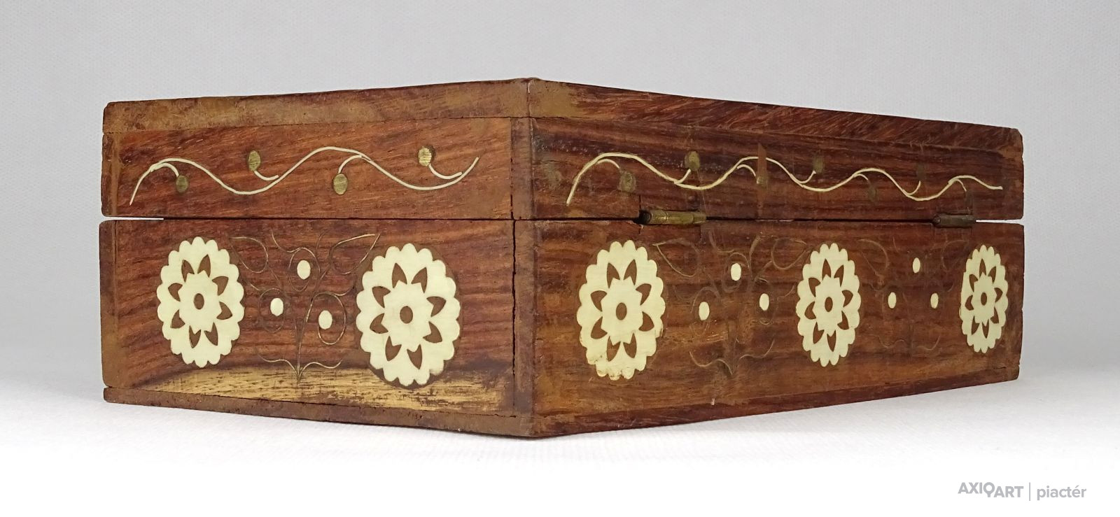 Teak fából faragott, réz és csont vagy csontszerű anyagok virágos intarzia motívumokkal díszített, ékszertartó, gyűrűtartó fadoboz, ládika.