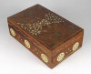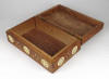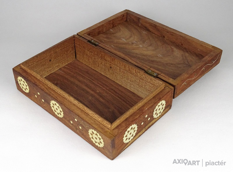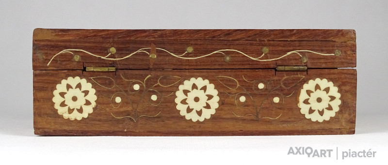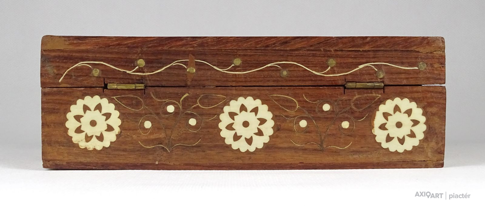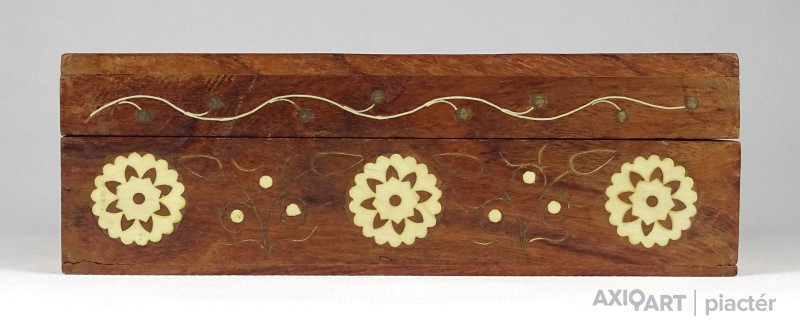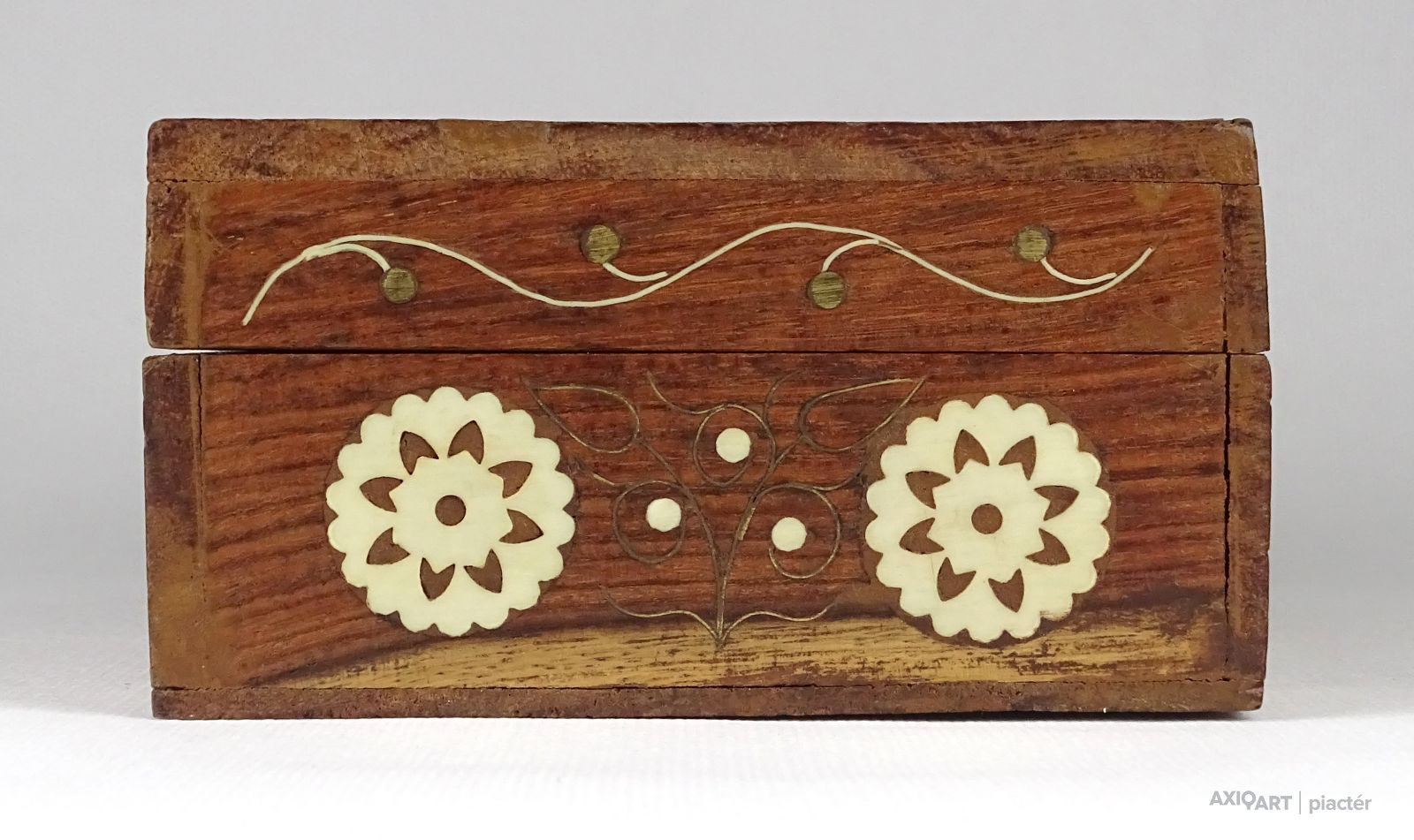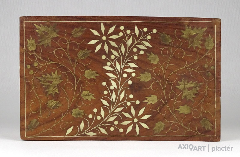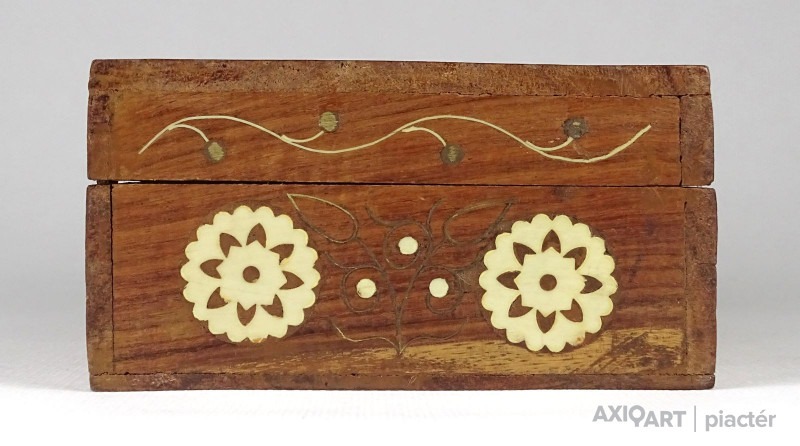 Teak fából faragott, réz és csont vagy csontszerű anyagok virágos intarzia motívumokkal díszített, ékszertartó, gyűrűtartó fadoboz, ládika.