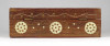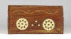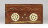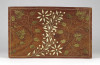 [1M734/X012] Teak fából faragott, réz és csont vagy csontszerű anyagok virágos intarzia motívumokkal díszített, ékszertartó, gyűrűtartó fadoboz, ládika. Magasság: 6.8 cm Szélesség: 12.8 cm Hosszúság: 20.5 cm Súly: 0.51 kg
