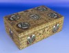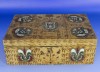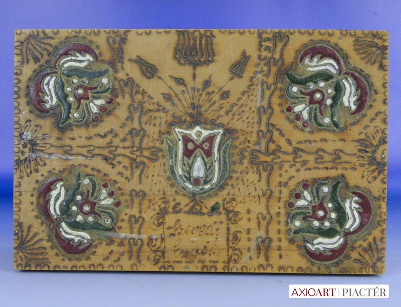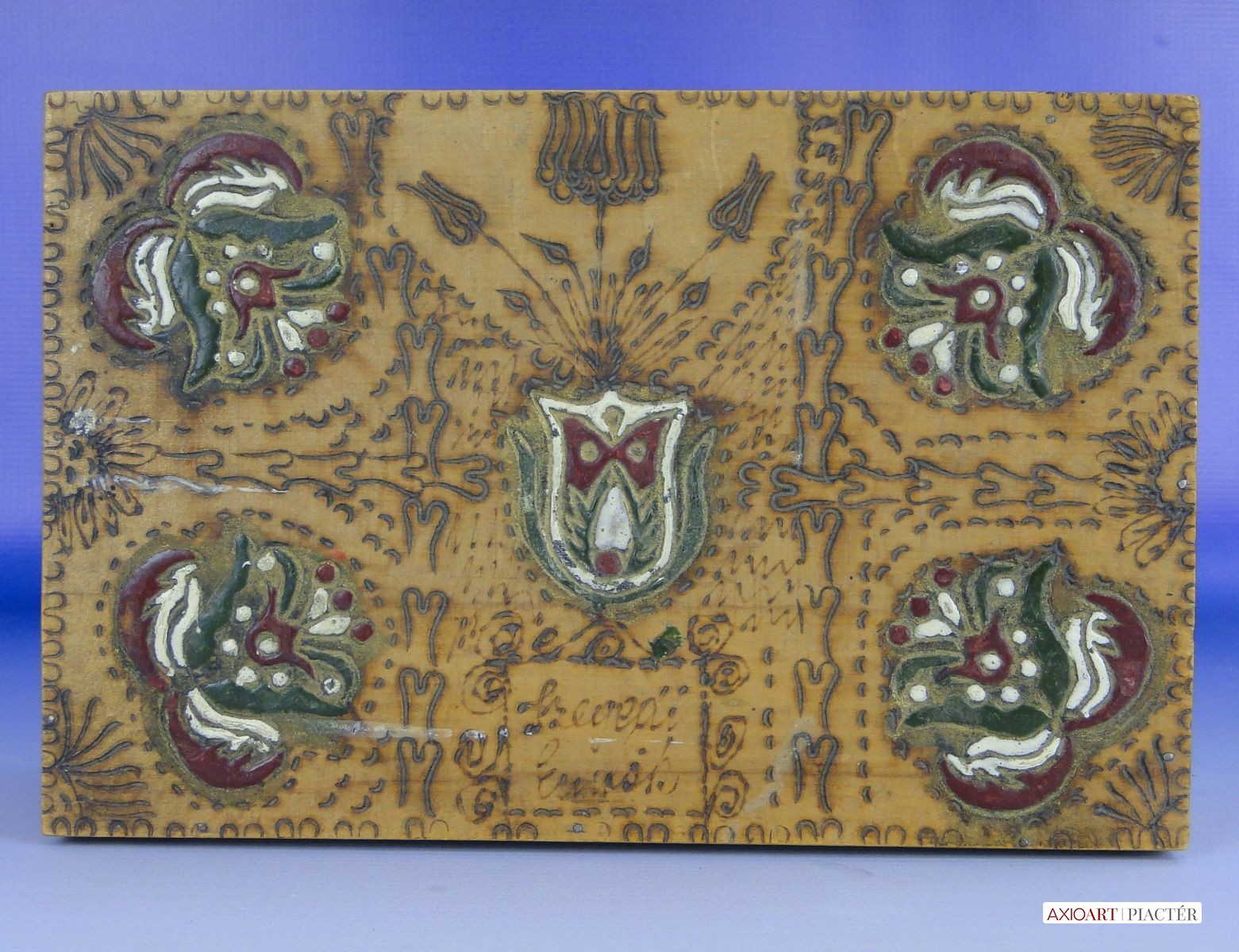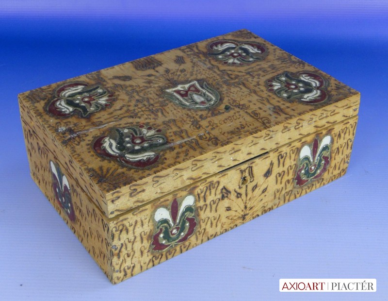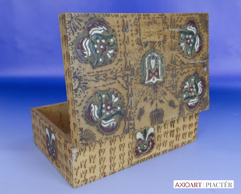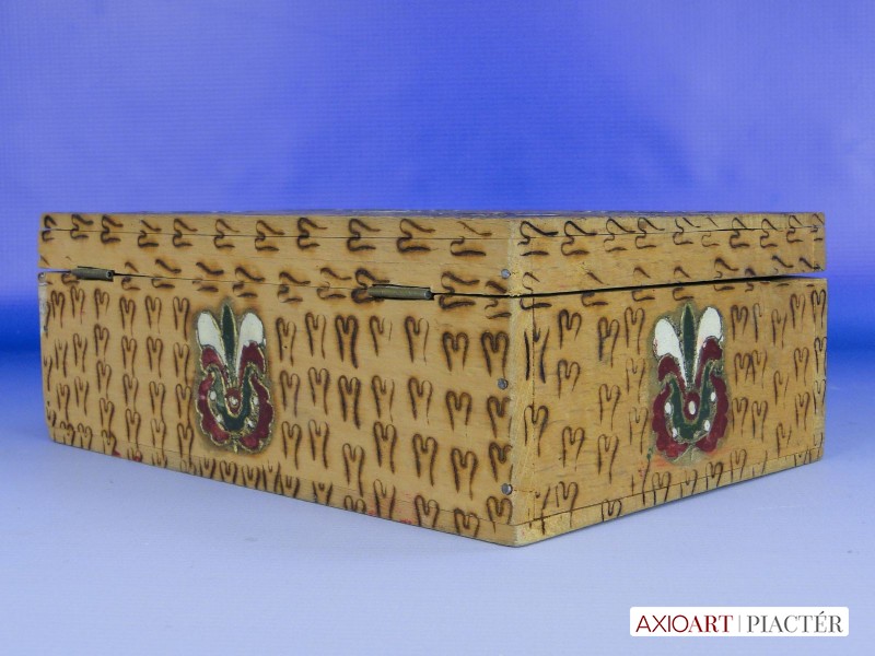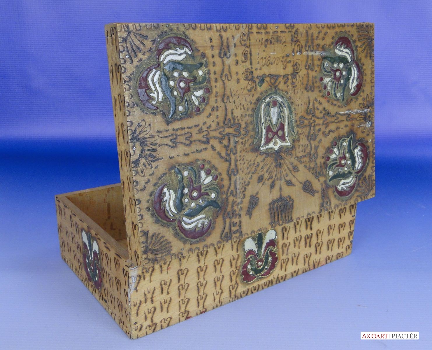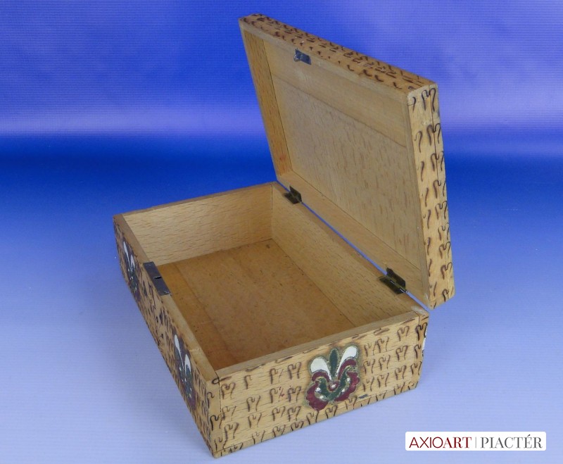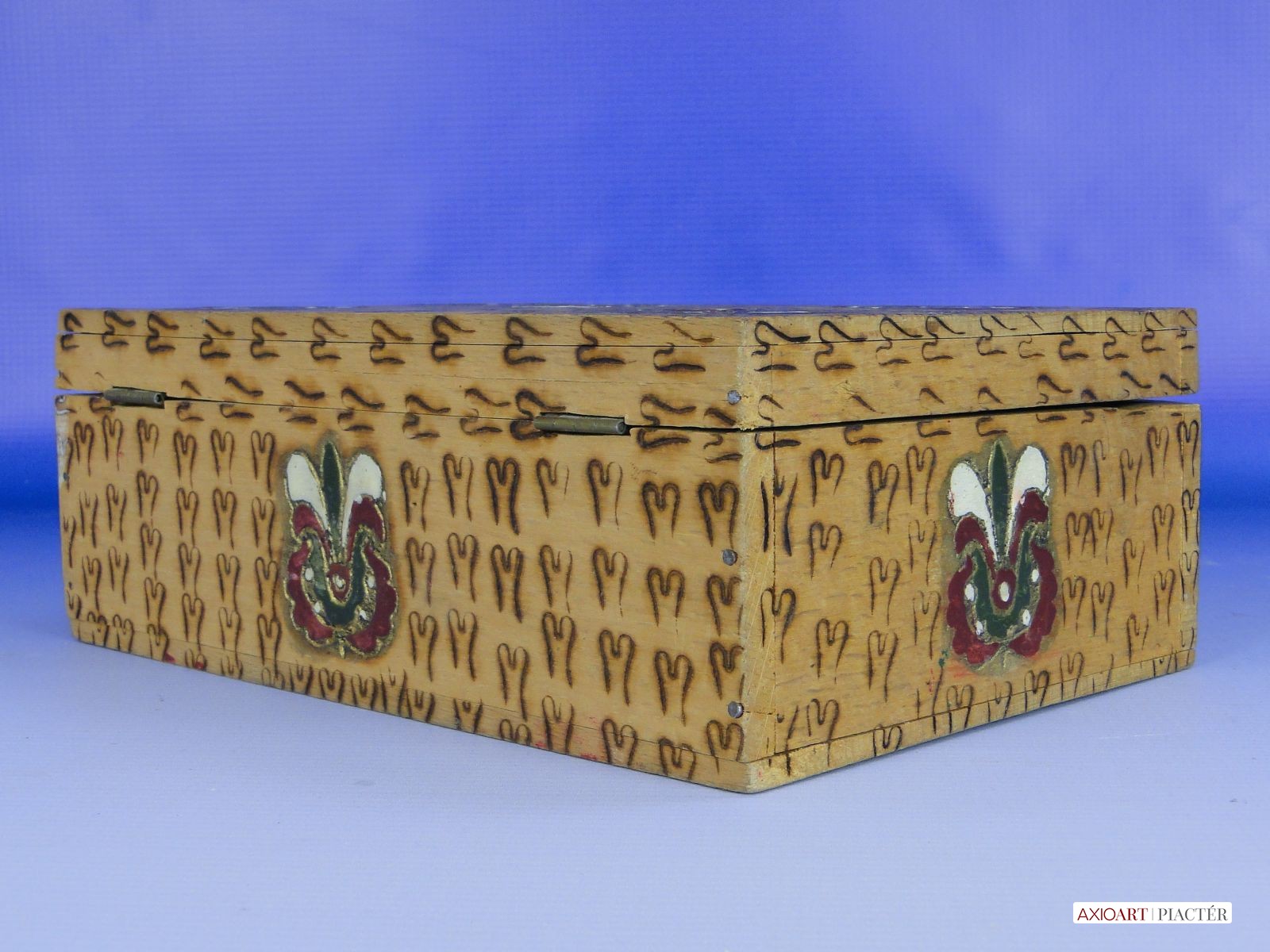 Régi, népi motívumokkal és égetett mintákkal díszített, ékszertartó, gyűrűtartó fadoboz.