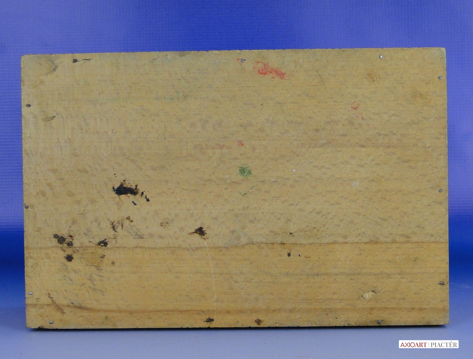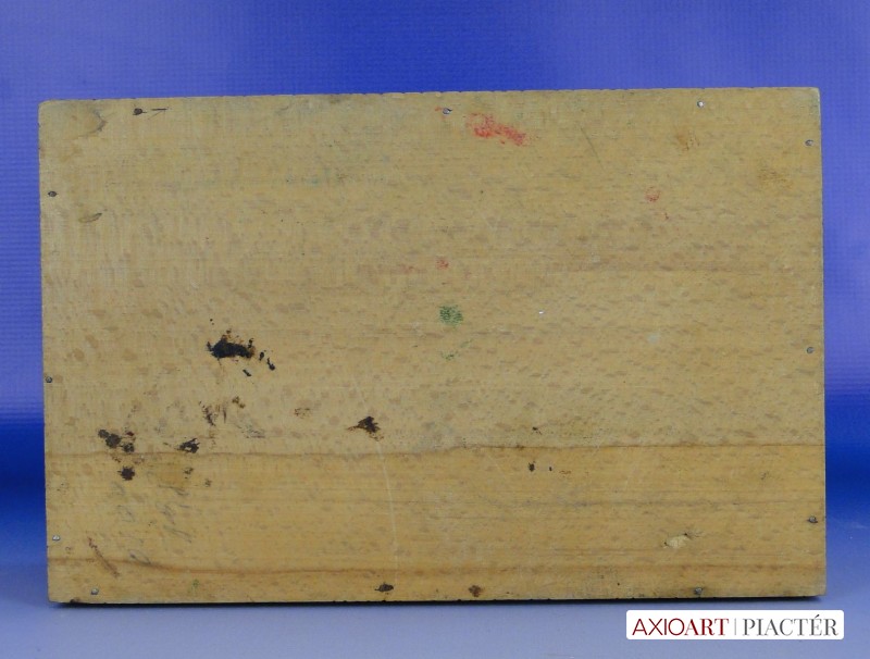 [1Y029/Z018] Olaj farost festmény, üveglap mögött, hibátlan képcsarnokos keretben. Hátoldalán Képcsarnok Vállalat papír címkéje: A művész neve: SCHÉNER MIHÁLY A kép címe: TÁJ Magasság: 66.5 cm Szélesség: 86 cm Súly: 6.54 kg Schéner Mihály festő, grafikus, szobrász, keramikus, bábtervező Medgyesegyháza, 1923-01-9 Elhalálozott: Budapest, 2009. május 11. Honlap: http://www.kormendigaleria.hu/kiadvany.html 1942-1947: Magyar Képzőművészeti Főiskola, tanára: Rudnay Gyula. 1978: Munkácsy-díj; 1984: érdemes művész; 1989: kiváló művész; 1995: Kossuth-díj. 1992-től a Magyar Művészeti Akadémia, 1993-tól a Széchenyi Irodalmi és Művészeti Akadémia tagja. 1956-ig tanított. 1982: Nagyatádi Faszobrász Alkotótelep, 1985: Nemzetközi Acélszobrász Alkotótelep, Dunaújváros. A stílusában felismerhető, mégis sokféle műtárgyat létrehozó ~ gazdag, állandóan alakuló életműve a folyton változó világban helyét kereső, az alkotói szabadságot megvalósító XX. századi képzőművész példázata lehetne. Magát expresszív-szürrealista alkotónak nevezi. Egyaránt dolgozik festékkel, textillel, fával, fémmel. Rajzol, szerkeszt, farag, épít, gyúr, varr és ragaszt, felhasználja a mézesbábok öntőformáit. Festő, rajzoló, textilszobor- és bábkészítő, fazekas, asztalos, esztergályos. Háromlépcsős folyamatban gondolkozik: rajzban tervez, majd fest, szobrot készít, “formába önt”, mindig a végső plasztikai megoldást keresi. Ami állandó és mégis játékosan változékony megjelenésű Schéner művészetében, az a gyermekkori emlékek által meghatározott népi mesterségek iránti tiszteletet kifejező motívumkincs, a tárgyi folklór formakészlete, amely már-már kézjegyként ismétlődik munkáin. Mitologikussá nőtt képzelete új lényeket teremt, pl: a Pigulát, amely disznótestű, emberfejű teremtmény. Schéner festményein a szürrealista motívumokat konstruktív szerkezetbe rendezi, a geometriát és az organikus természeti motívumokat egyaránt beépíti műveibe. A népi, népművészeti formakincsből merített lovas huszárok, betyárok, szegénylegények cifra szűr mentéje, piros csákója, fekete csizmája, az önálló életet élő zsinórdíszek és mézeskalács bábok, a kiskocsik a gyermekkori vásárok, búcsúk színes forgatagába vezet. A primér motívumokat aztán felváltják a vastagon felhordott felületbe karcolt jelek, vonalhálózatok, amelyek a játszó gyermek homokba rajzolt ábráit, a pásztorember fába vésett üzeneteit, az ősember barlang falába rótt mágikus jeleneteit idézik meg. A művész pillanatnyi érdeklődésének megfelelően a színek búvópatakként tűnnek el és jelennek meg ismét. A 60-as években leginkább a formákkal való játék érdekelte, a festmények felülete egyre gazdagodott: a táblaképek felületén applikációk jelentek meg, vagy lemállasztott rétegek hagyták maguk után hiányukat, motívumok nélküli ősformák, archetipikus képzetek bukkantak fel művészetében. A véletlenszerűnek látszó rétegekkel való játék azonban tudatos komponálás eredménye, amely később nyilvánvaló ritmusnak és formai szerkesztettségnek adja át a helyét, mint a Törvénytáblák c. sorozaton. A különböző művészi kifejezési formák egymásra termékenyítő hatással vannak, át- meg áthatják egymást. Textilszobrai, amelyekkel új műfajt teremtett, ugyanazzal az automatikus, expresszív-szürrealista módszerrel készülnek, mint festményei. A hagyományosan a népművészetben alkalmazott anyag, a filc lehetőséget ad a népi formakincs felelevenítésére, amely azonban a művész különös szürrealista átiratában jelenik meg. A szívekkel kivarrt, zsinórdíszes Posztókotlós c. művén mézesbábok lógnak, hátán huszárok lovagolnak. Egész sor textilből készült kéz-plasztikát alkot, amelyeket az ujjakra rávarrt díszekkel öltöztet, személyesít meg. A színes-különös világból aztán ~ újra puritán képi és formai rendbe juttatja el a nézőt, majd nemsokára tépett, gyűrt, vágott, csorgatott, repedezni hagyott szenvedélyesen vonagló képi felületeket hagy hátra. Schéner készített apró gyermekjátékokat, térstruktúra-tereket, mászókákat is. A magyar népi formák mellett szürreális játékaiban gyakran alkalmaz görög mitológiai alakokat, “elkentaurosodott” lovakat, Gorgó-fejeket, sellőket, hárpiákat, Pán-ábrázolásokat. Schéner nemcsak saját művészetéről publikál, hanem művésztársairól is számos írása jelenik meg, elsősorban az Új Auróra c. folyóiratban, amelynek egy ideig főmunkatársa volt. Irodalom kiállítása, Magyar Építőművészet, 1962/4. Húsz év után, Művészet, 1965/4. BOZÓKY M.: ~, Tiszatáj, 1968/5. PERNECZKY G.: Nincs uborkaszezon, Élet és Irodalom, 1969. augusztus 8. BARÁNSZKY-JÓB L.: ~, Művészet, 1969/9. LÁSZLÓ GY.: ~ kaposvári kiállítása, Jelenkor, 1969/4. MAJOR M.: Pásztorok, betyárok, huszárok - kezek, Tükör, 1970. szeptember 15. FRANK J.: Bemutatjuk ~t, Élet és Irodalom, 1972. május 6. ról kiállítása ürügyén, Képzőművészeti Almanach, Budapest, 1972 Sötétkék kokasok, Élet és Irodalom, 1973. szeptember 9. MAJOR M.: ~ játékai, Élet és Irodalom, 1974. július 27. BARTA J.: Egy különös művész, Alföld, 1974/6. VADAS J.: Szárnykészítők, Élet és Irodalom, 1975. október 4. JUHÁSZ F.: A halál ellen játszani, Élet és Irodalom, 1975. május 17. PAP G.: Kincsek és műkincsek, Művészet, 1975/6. P. SZŰCS J.: Az utak kettéválnak, Művészet, 1978/3. Békési művészet, Művészet, 1978/7. SZAMOSI F.: ~ [kismonográfia], Budapest, 1978 VADAS J.: Játék a játékkal, Élet és Irodalom, 1979. augusztus 18. NÉMETH L.: ~ műveiről, Művészet, 1979/4. MIKLÓS P.: Mit akar ez a múzeum?, Művésze