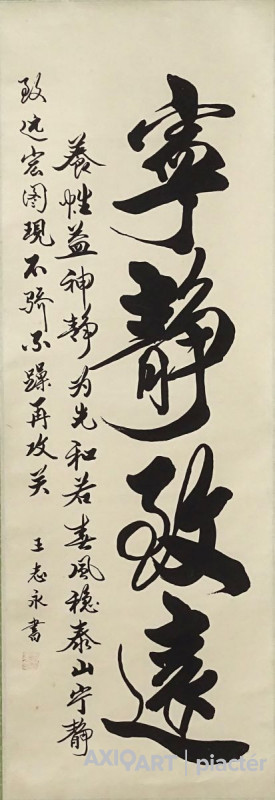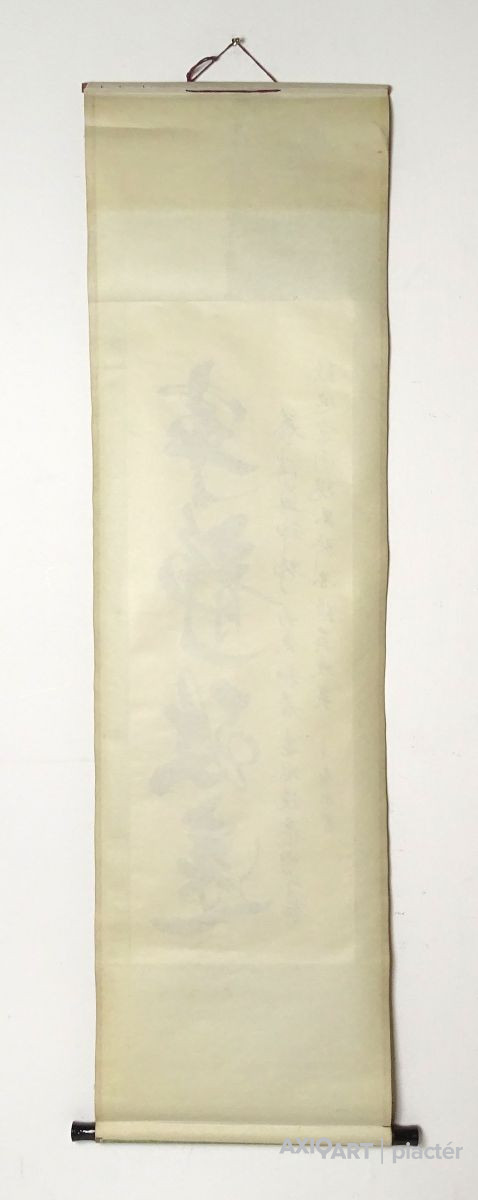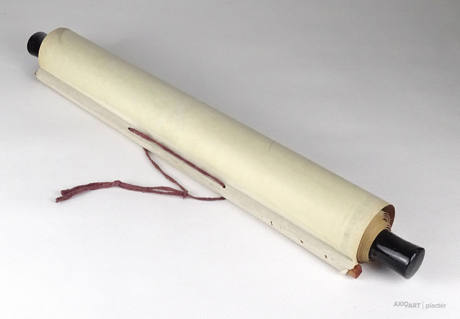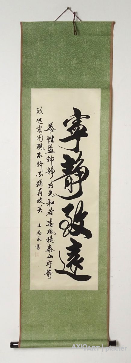 Jelzett, kínai mester által készített, papír tekercs. Rajta fekete tussal kalligrafikus kínai bölcsesség. Pirossal jelzés, lásd fotó. Pergamenként összetekerhető, nagyon díszes, selyem szerű textíliára kasírozva.