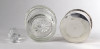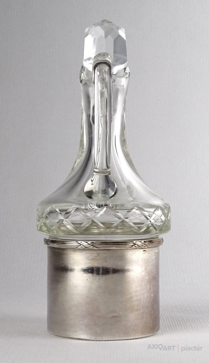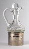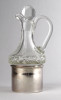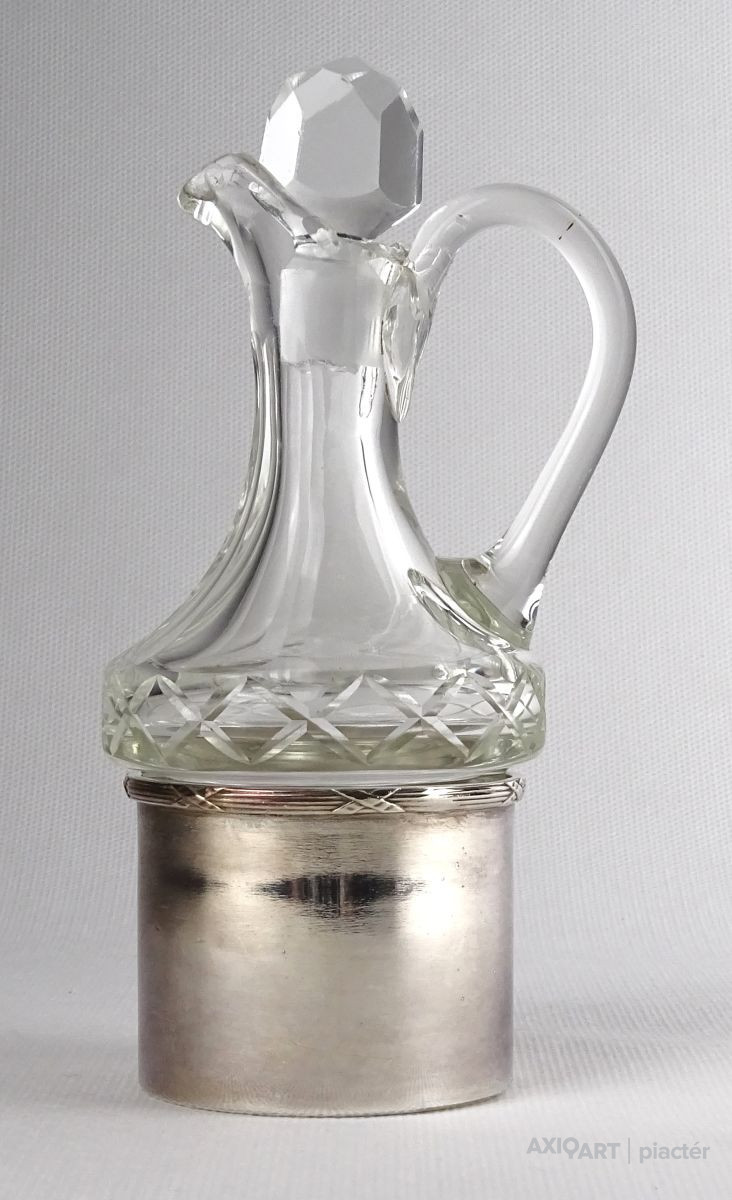Régi kisméretű csiszolt üveg olajos kiöntő ezüstözött tartóban