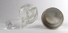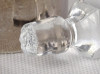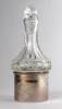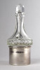 [1R009/UZ-N] Régi olajos vagy ecetes asztali kínáló, oldalán és alján csiszolatokkal díszítve. Hozzá csiszolt üveg dugó és ezüstözött fém talp, tartó. Az üveg nyaka sérült, lásd fotó. Magasság: 15 cm Szélesség: 6.5 cm Súly: 0.32 kg
