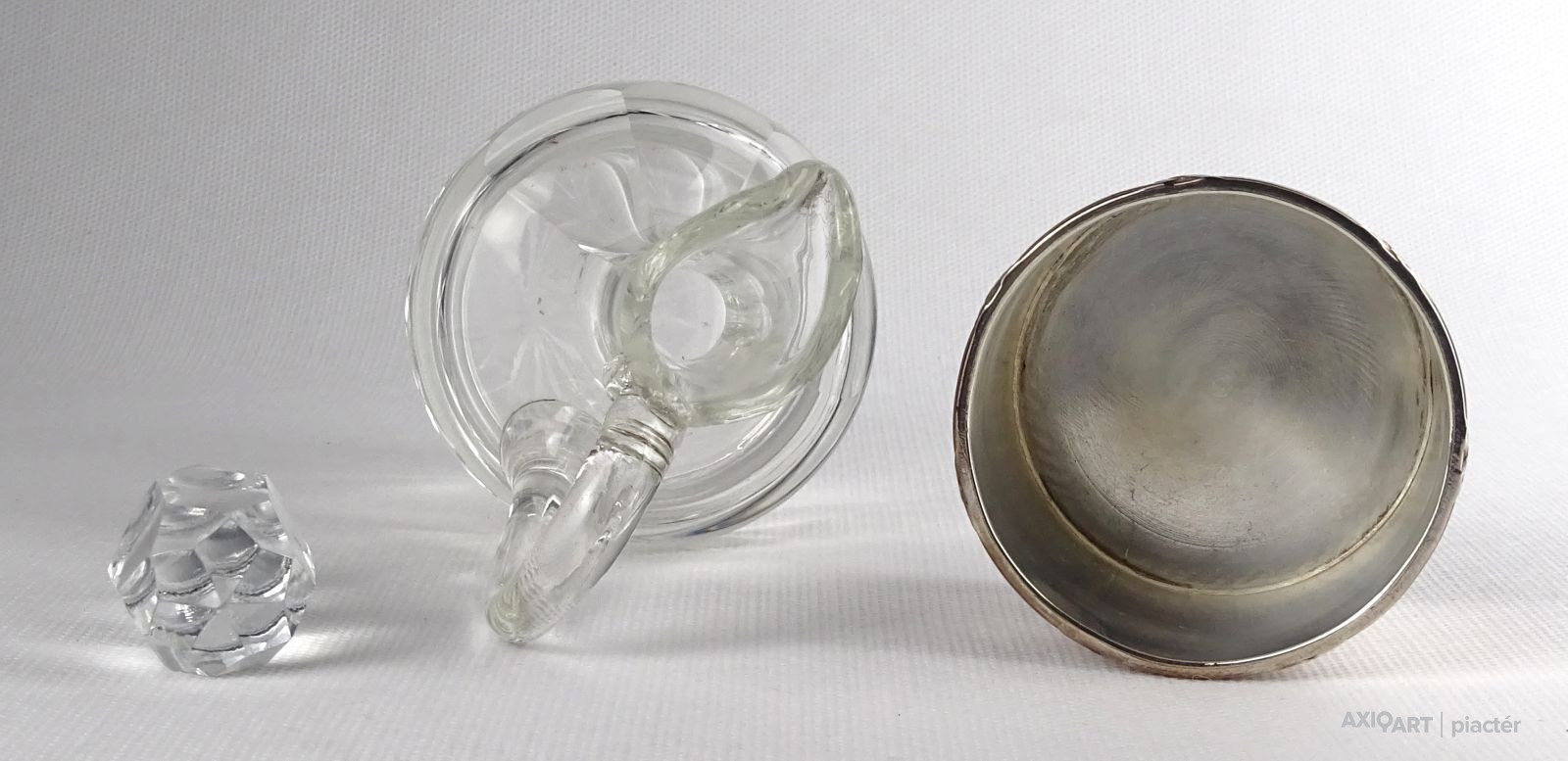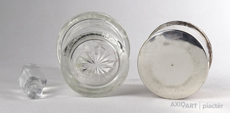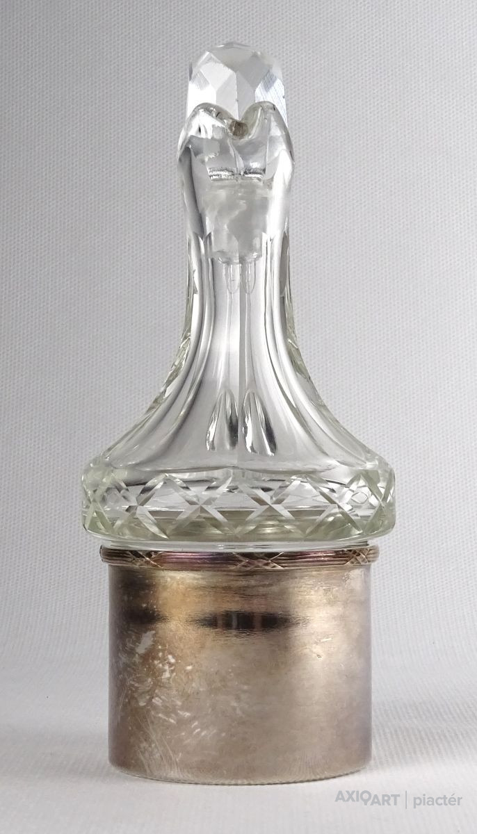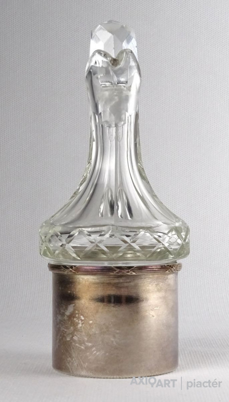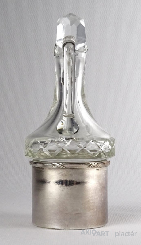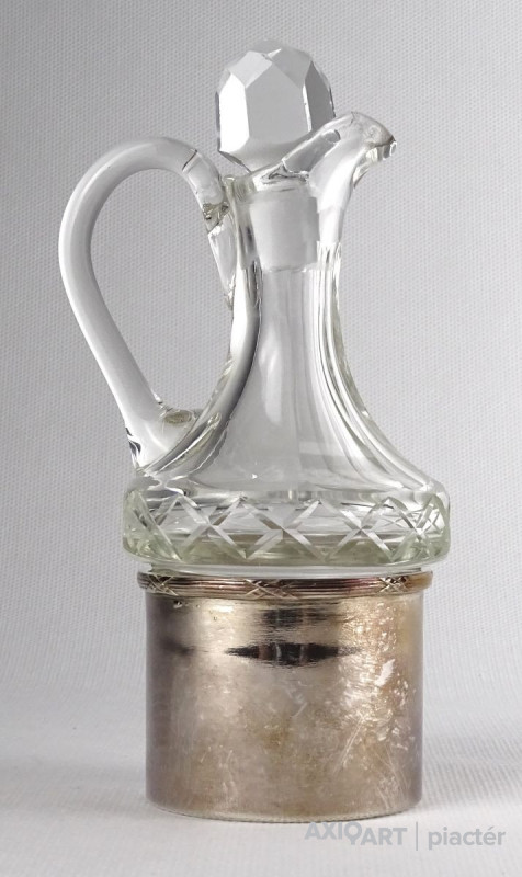 Régi olajos vagy ecetes asztali kínáló, oldalán és alján csiszolatokkal díszítve. Hozzá csiszolt üveg dugó és ezüstözött fém talp, tartó. Az üveg nyaka sérült, lásd fotó.