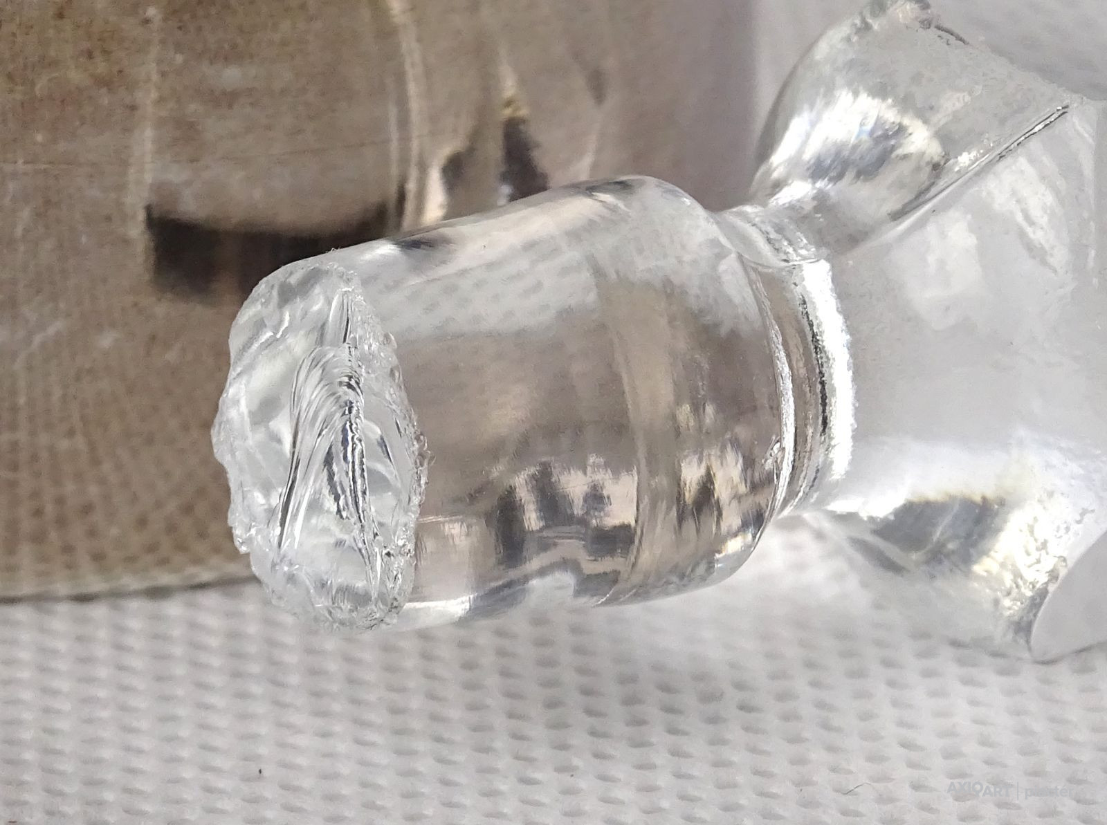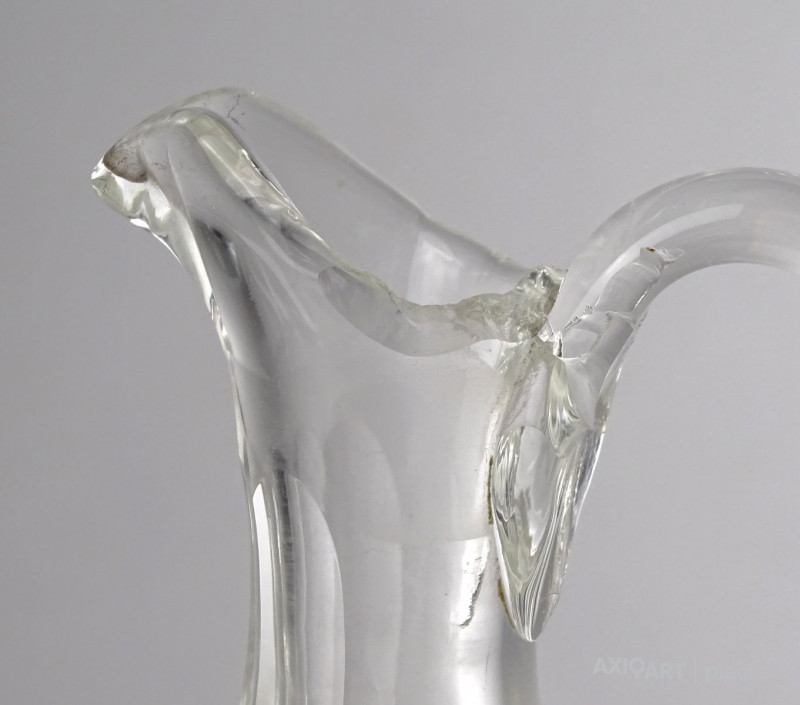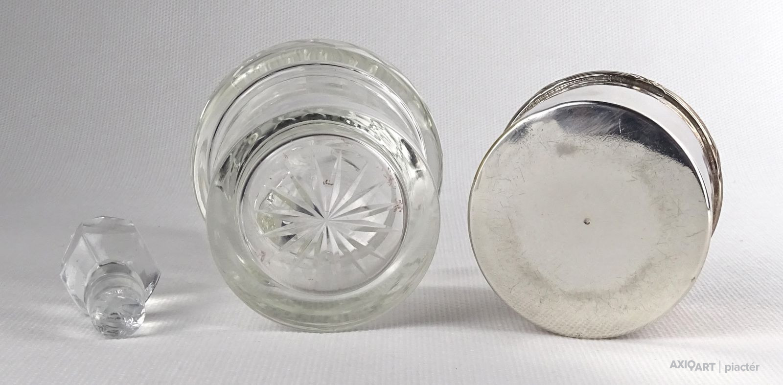 Régi olajos vagy ecetes asztali kínáló, oldalán és alján csiszolatokkal díszítve. Hozzá csiszolt üveg dugó és ezüstözött fém talp, tartó. Az üveg nyaka sérült, lásd fotó.