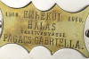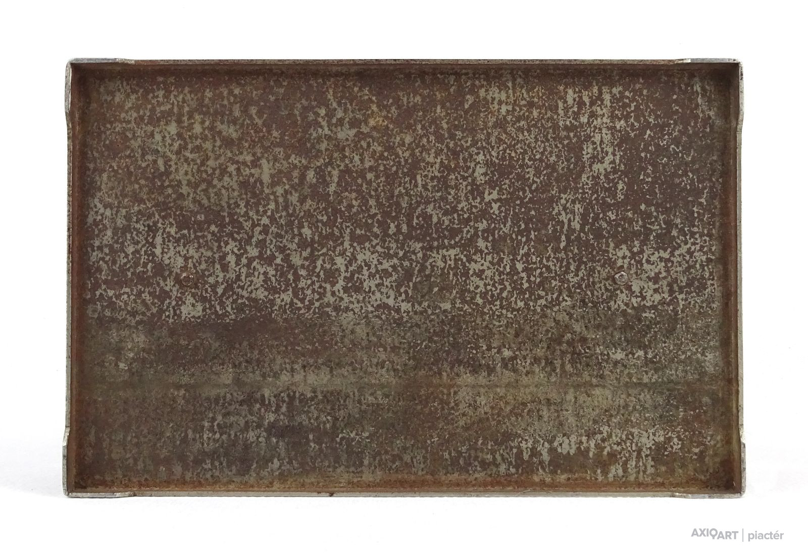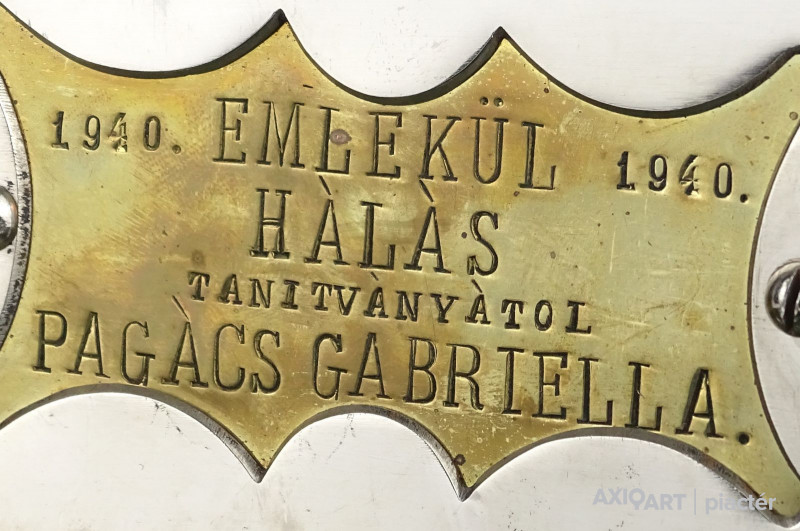 Régi, réz füllel rendelkező, fűzött zsanéros fém kassza, egy darab kulccsal. A páncél belsejében díszes ajándékozási réz tábla található, rajta felirat: