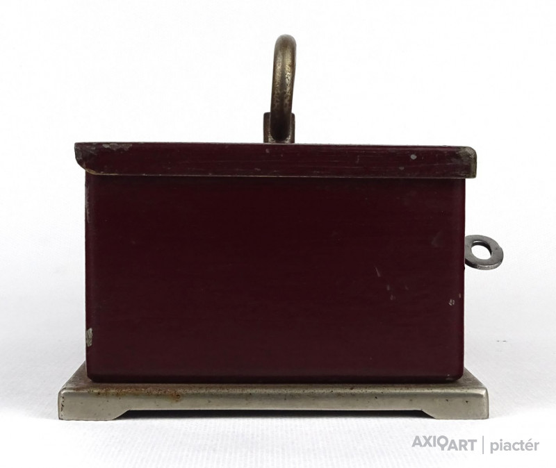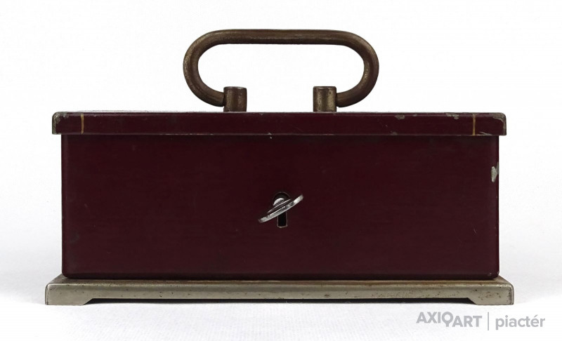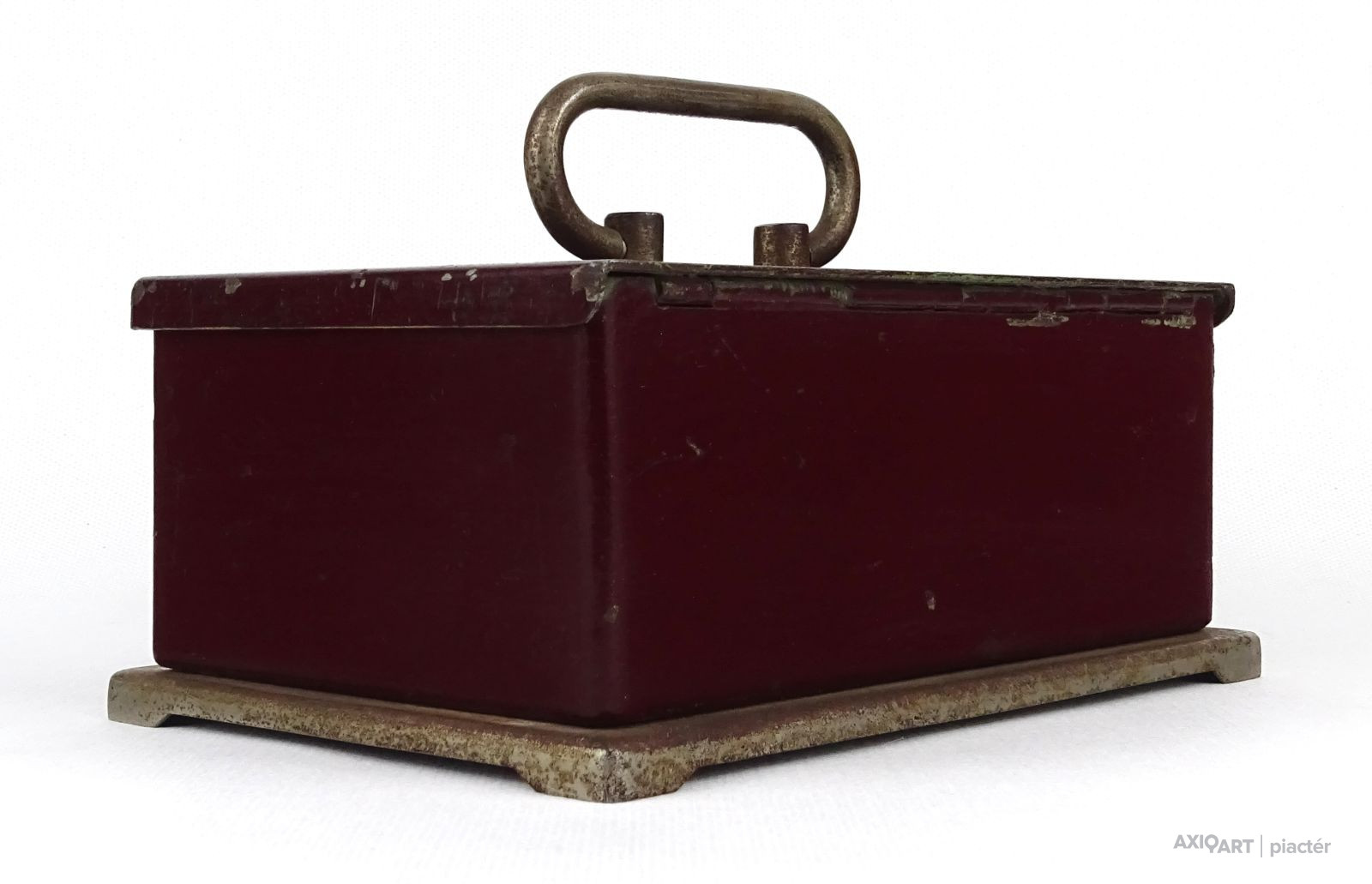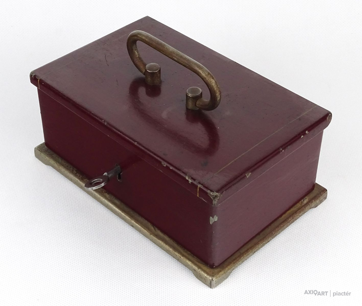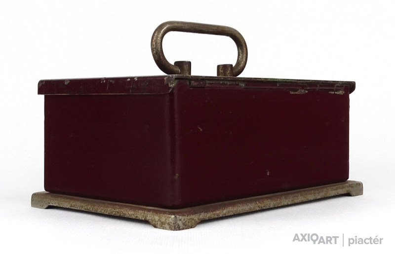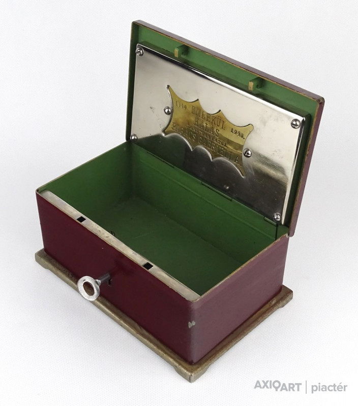 [1M507/X033] Régi, réz füllel rendelkező, fűzött zsanéros fém kassza, egy darab kulccsal. A páncél belsejében díszes ajándékozási réz tábla található, rajta felirat: 1940. EMLÉKÜL 1940. HÁLÁS TANÍTVÁNYÁTÓL PAGÁCS GABRIELLA Súly: 1.8 kg