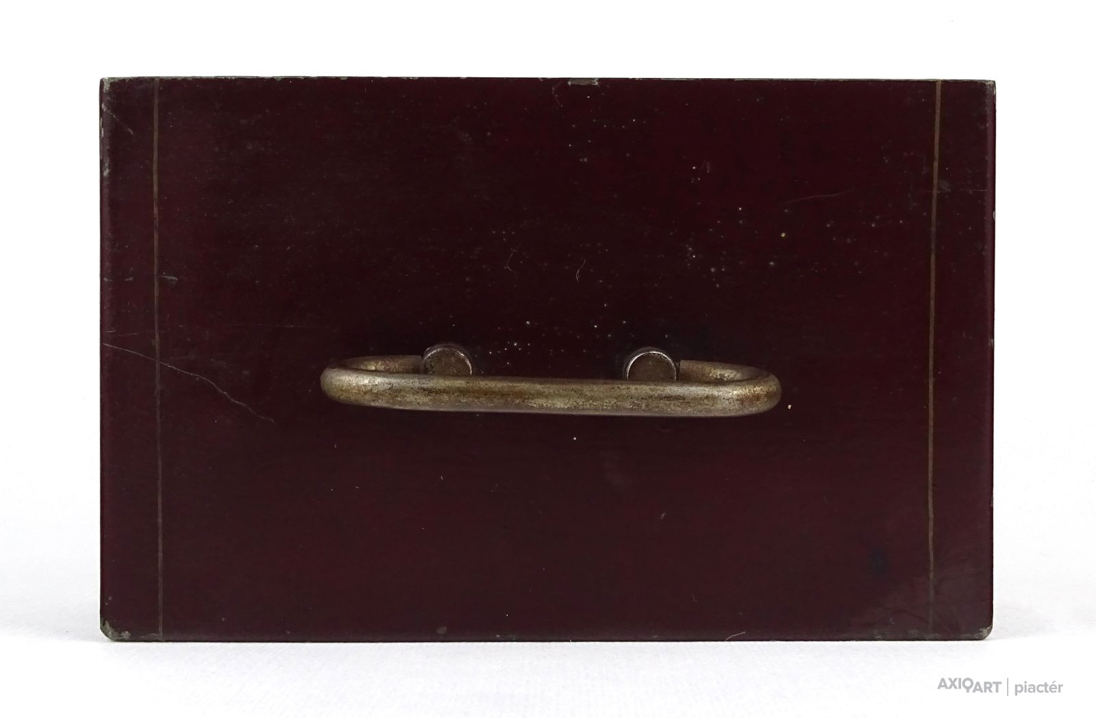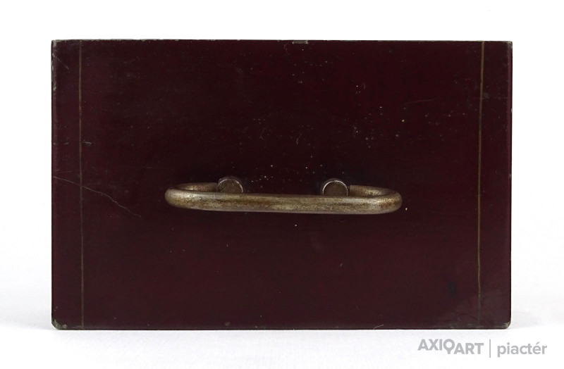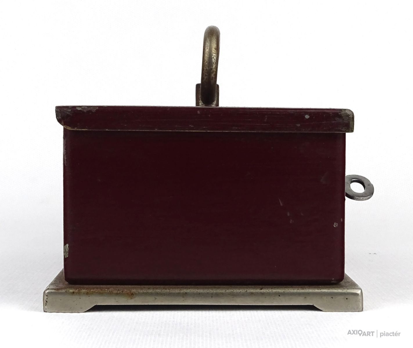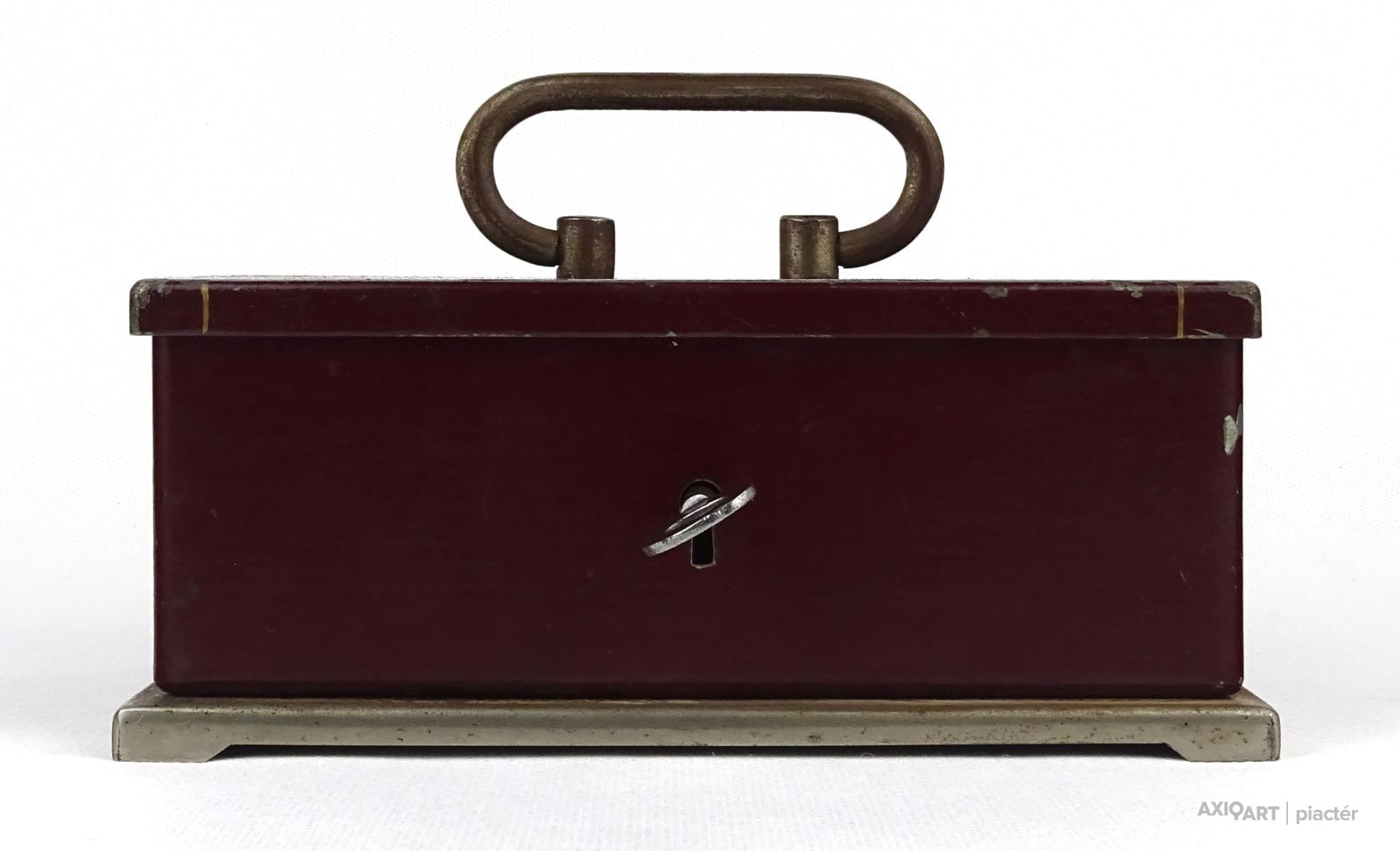 [1M507/X033] Régi, réz füllel rendelkező, fűzött zsanéros fém kassza, egy darab kulccsal. A páncél belsejében díszes ajándékozási réz tábla található, rajta felirat: 1940. EMLÉKÜL 1940. HÁLÁS TANÍTVÁNYÁTÓL PAGÁCS GABRIELLA Súly: 1.8 kg