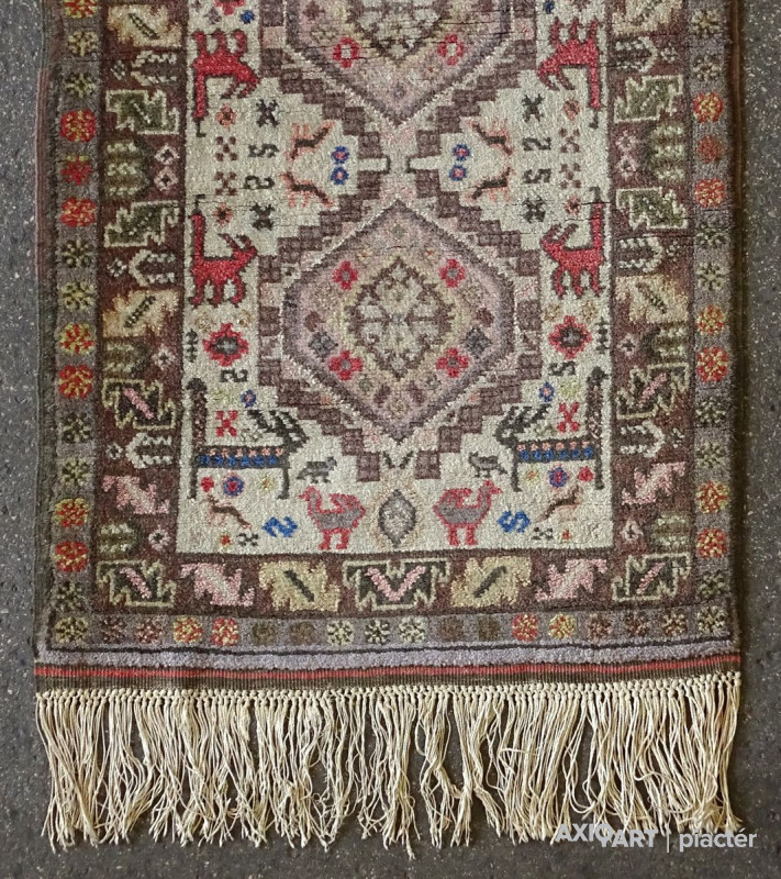 [1K989/UZ-N] 25% ÁRENGEDMÉNY MINDEN TERMÉKÜNKRE Dec. 14-ig Barna árnyalatú, vastaghúsú régi imaszőnyeg. Dupla medalionos, állatmintás kézi csomózású szőnyeg. Szélesség: 80 cm Hosszúság: 154 cm