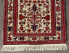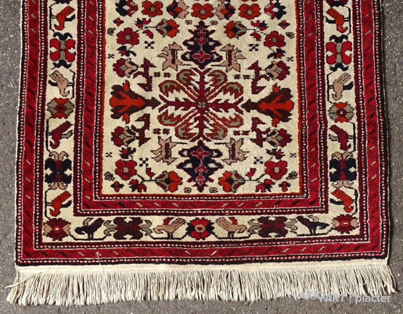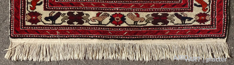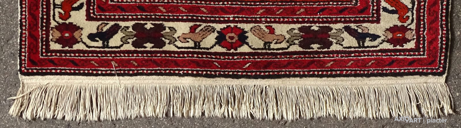 Régi, XX. századi kézi szövésű kisméretű, szép állapotú szőnyeg, összekötőszőnyeg, ágyelő szőnyeg. Szép állapotú, hosszú rojtokkal rendelkezik. Főbb színei: bordó, bézs.